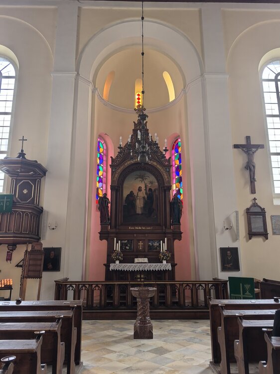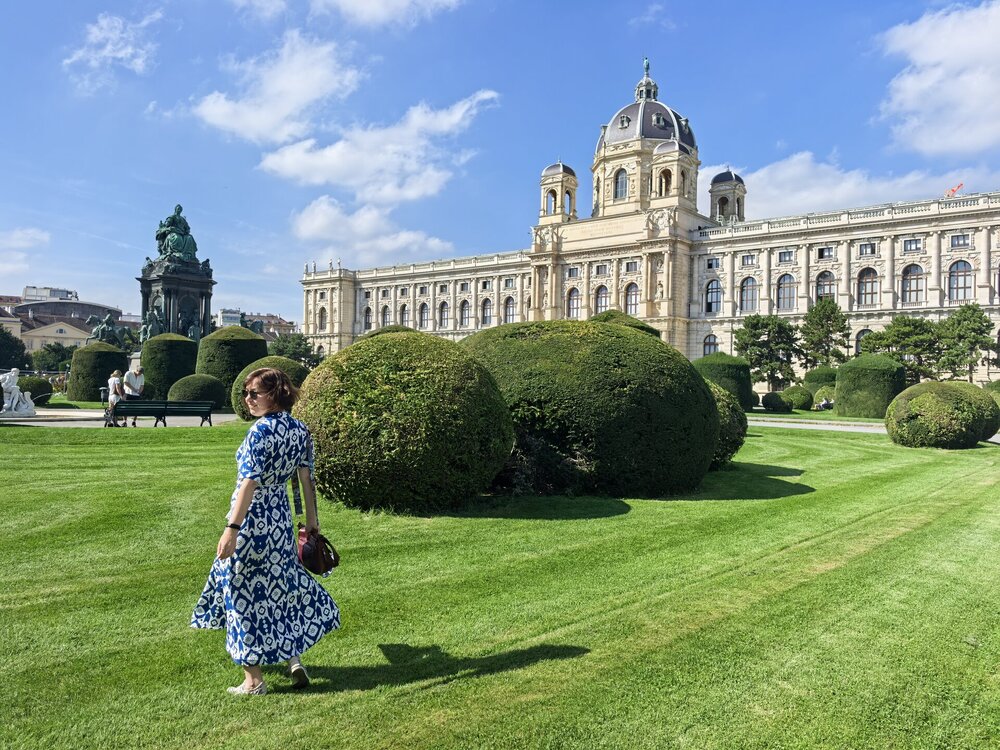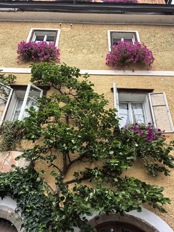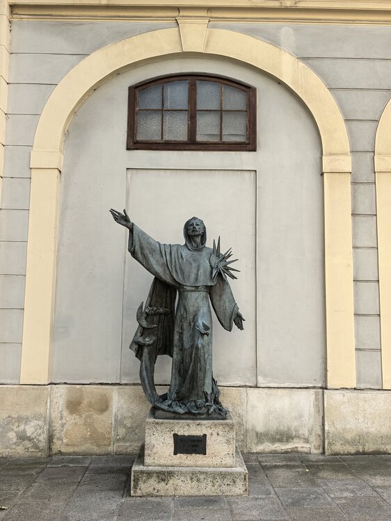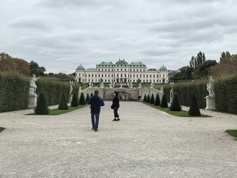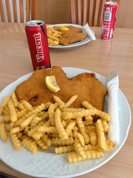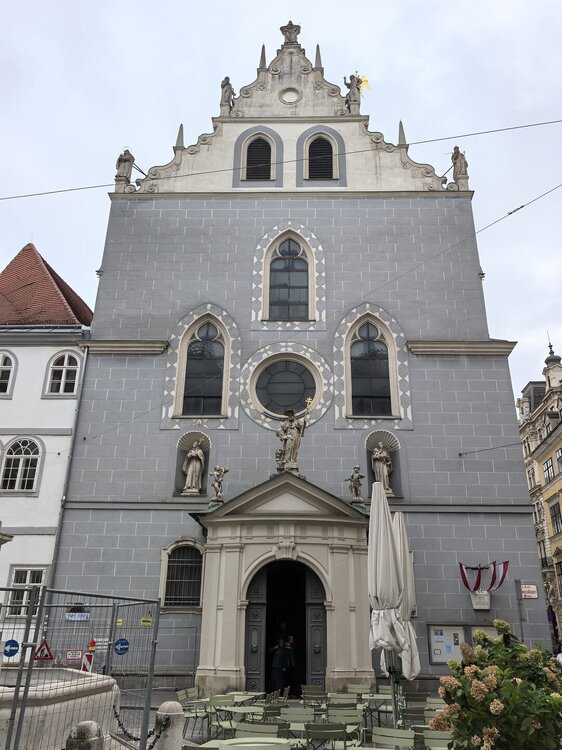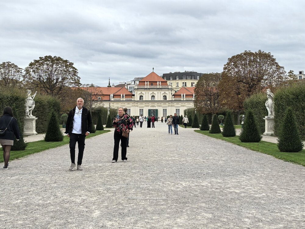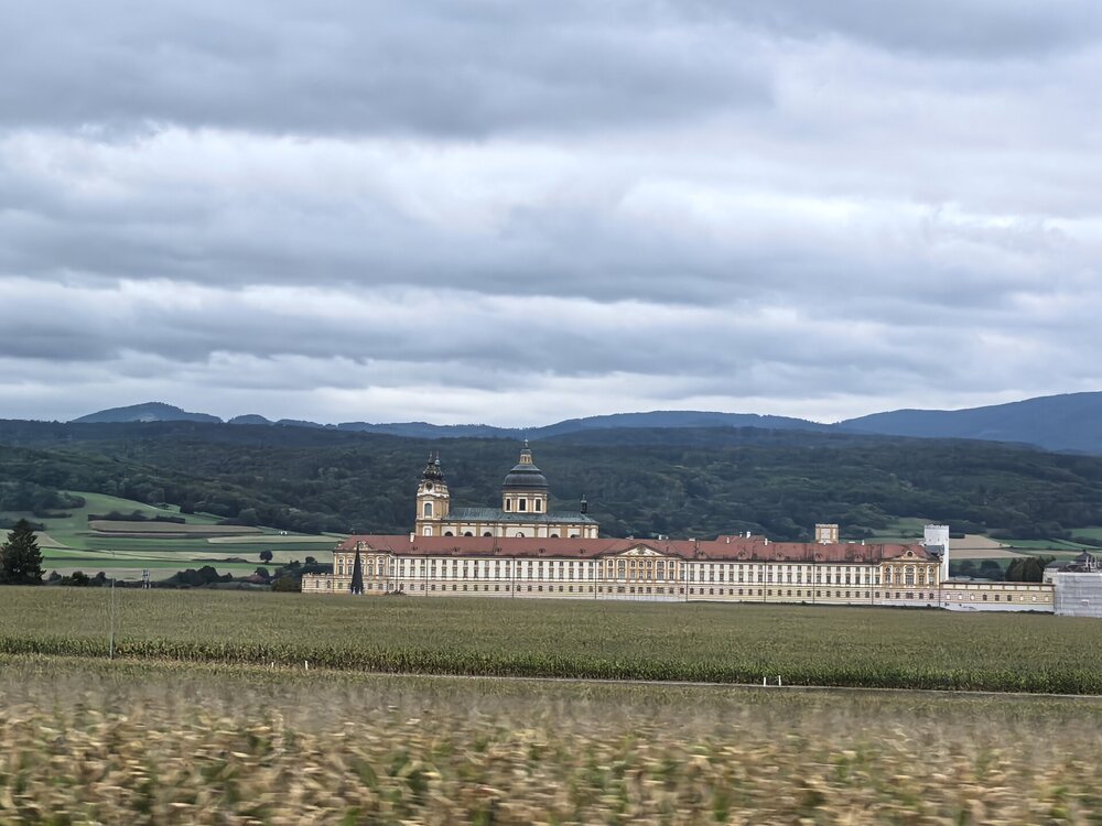 А шли мы к Бельведеру. Думаю, комментарии тут излишни. Давайте просто посмотрим какой он был в сентябре 2025 года. И что я скажу? Парк был местами не очень ухоженным и немного лысоватым. Простите))) Нагулявшись и проголодавшись, идем на обед. Вечером в отеле я нарыла в гугле интересную забегаловку с названием Шницель центр, в котором шницель - главное блюдо. К слову шницель в центре стоит 17-22 евро, шницель здесь вместо с колой и фри обошелся нам в 10 евро. Наелись мы знатно, до следующего завтрака в отеле)) Когда я увидела порцию, у меня закрались сомнения что меня правильно поняли и не выдали мне двойной шницель, который также был в меню. Но при оплате (а она постоплата, после того как вы поели), деньги взяли верно как за одинарный шницель. Местные то и дело заходили сюда и заказывали еду на вынос. Далее мы гуляли по магазинам вместе с местными по не очень туристическим местам Вены, удивлялись большому количеству огромных собак, которые никуда не неслись, не лаяли и вообще вели себя как паиньки. В одном из книжных собака ростом примерно в половину меня спокойно лежала под стеллажом пока хозяйка мирно выбирала книжку. Сок из австрийских яблок никогда не пробовали привезти в качестве сувенира? И да, это книжный магазин. И вот какая прелесть была обнаружена в киоске по диагонали от Оперы. Точь-в-точь как у меня на полке дома! Суслик весел явно не спроста. Центр города опять нас утянул в свои недра Здесь вдали от толп находится очень красивый костел Францисканцев, отстроенного примерно в 17 веке. Фасад в стиле ренессанса с элементами готики, а внутри сплошь барокко. Отделка внутри храма продолжалась в 18 веке. Храм построен на месте разрушенного турками монастыря 14 века. Такое пожелание обнаружила внутри одного из алтарей Выходим в шумную толпу, у нас есть ещё немного времени, чтобы подышать воздухом Вены. В назначенный час наш золотой мерседес с легкостью увозит нас в направлении Зальцбурга. Но мы совсем немого постояли в пробках. И тут где-то в середине автобуса произошло оживление - туристы увидели интересную надпись и тут же начали рассуждать "а что, это видеосалон? а это ещё актуально? а зачем вообще?" Ну, забавно, да)) Самое главное, нон-стоп! Дорога проходила по трассе, периодически встречались интересные исторические места, о которых рассказывал Олег тем кого ещё не похитил Морфей. На фото монастырь фирменного императорского цвета.