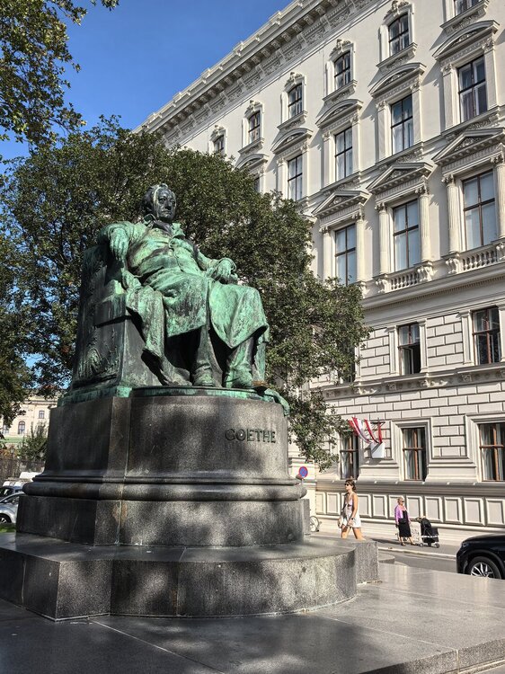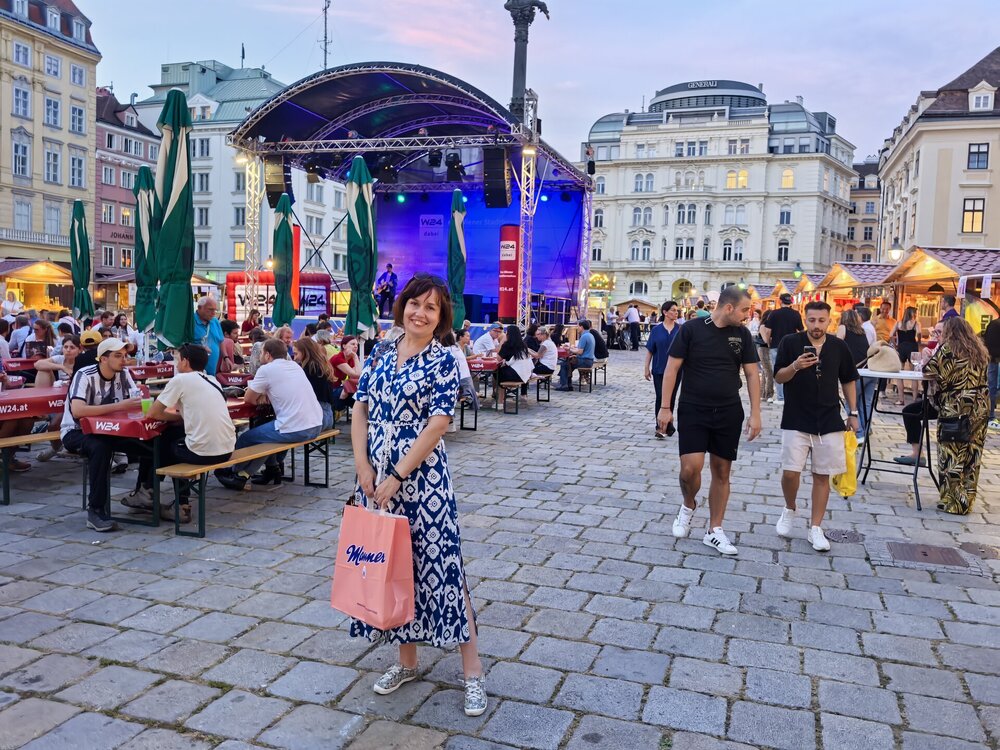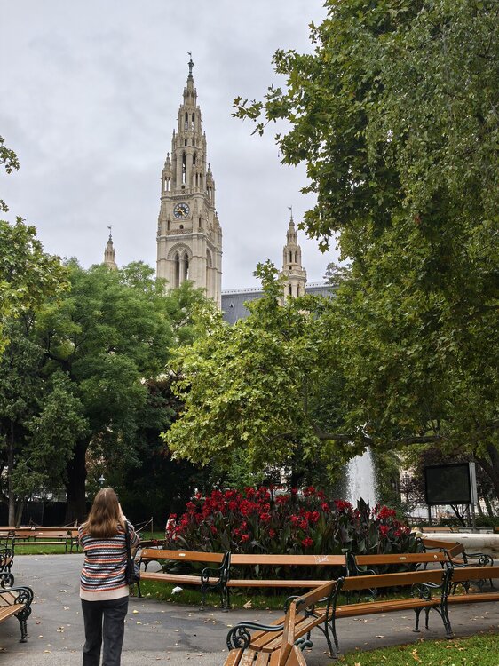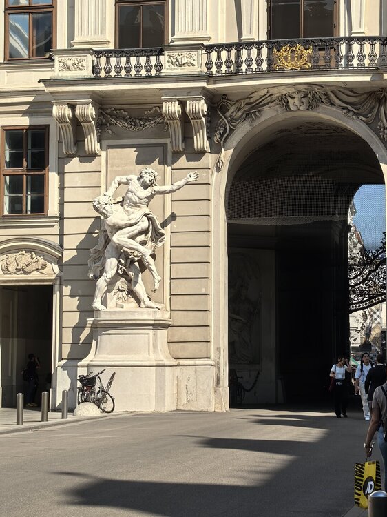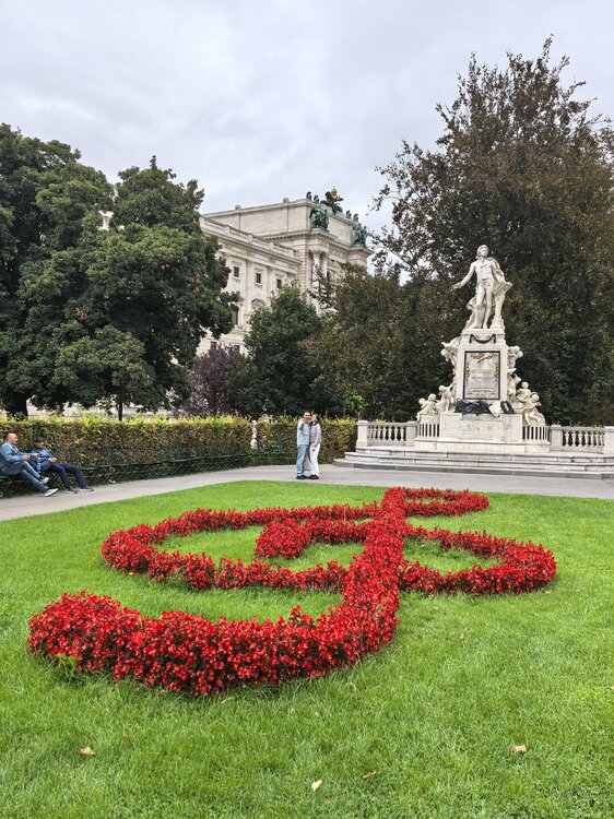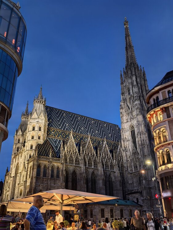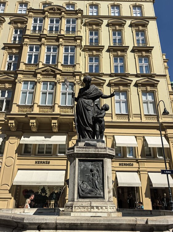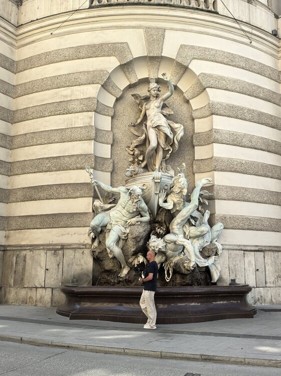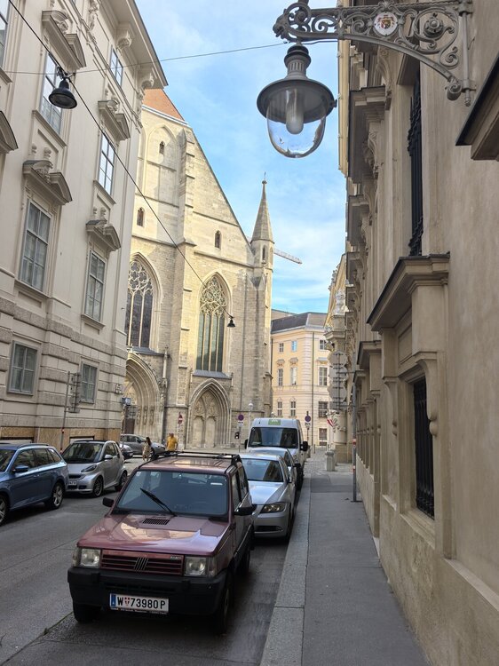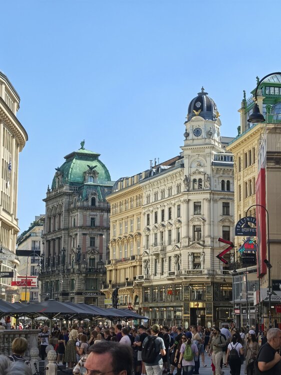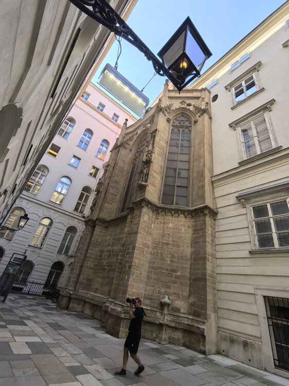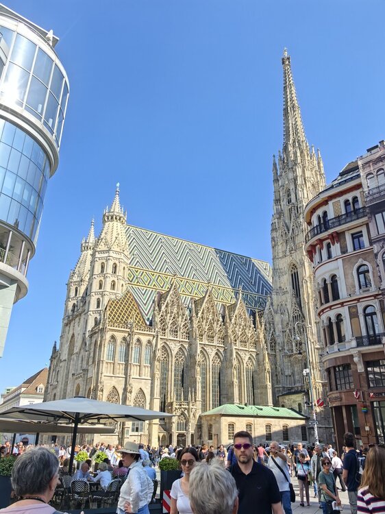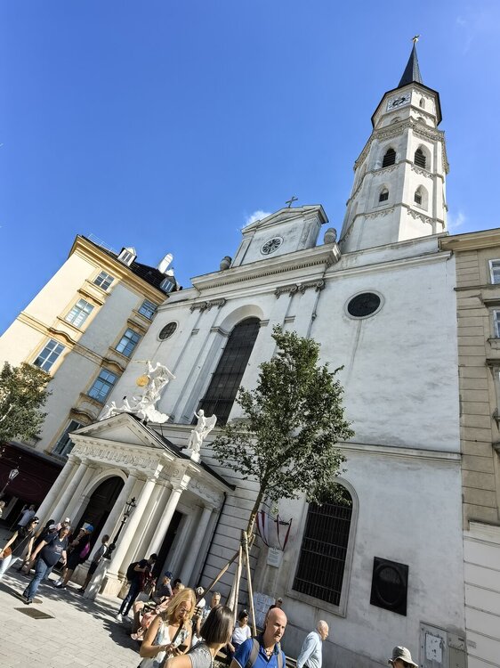 А мы продолжаем наши прогулки. Гид с нами распрощалась у Альбертины, у группы чуть позже поездка в Шенбрунн, но я снова мимо. Я слишком долго не видела свою любимую Вену, чтобы рассматривать покои Франца Иосифа. Он, конечно, впечатляющая личность, но не до такой степени)) В Альбертине в роли афиши ступени. За это время мы уже изрядно проголодались и, пока ходили с экскурсией, приметили пару мест со стрит-фудом. Это очередь за знаменитыми венскими хот-догами. Но ждать это не про нас.) Забегаем в Биллу - здесь прекрасный уголок с готовой горячей едой, салатами, кофе, порезанными фруктами и вообще что захотите. Взяла пасту в сливочном соусе, было очень вкусно и сытно. На этикетке указаны цены. И не могла пройти мимо этой бутылочки Швепса, просто обратите внимание на название на ценнике. Если русская, надо брать.)) Хотя, возможно, это уловки)) После вкусного обеда по закону Архимеда полагается... как минимум никуда не бежать, а хотя бы посидеть вот как Гете к примеру Посидеть можно на задворках Хофбурга. Это уже второй раз за поездку вальяжного отдыха в зеленой зоне. Иду на эту башенку, загляну в костёл Святого Августина Внимание тут привлекает это белоснежное надгробие Марии-Кристине Австрийской, дочери Марии Терезы. Автором надгробия является Антонио Канова, который изначально посвятил его Тициану, но не закончил, а тут подвернулся заказ от мужа Марии-Кристины. Это надгробие отличалось от других своей эпохи, т.к. в центре здесь не покойный человек, а сама смерть в виде темных ворот, куда идут безутешные люди, пересекая тем самым черту между тем и этим миром. Лев справа - символ рода Габсбургов. Достаточно грустных историй, идём гулять в цветники Жимеш выбор сада одобряет Среди зданий увидела очертания явно какого-то религиозного сооружения Это храм огромный Миноритов, основанный в 14 веке. Вокруг абсолютная тишина и никого. Выглядел он как закрытый, лишь позади люди собирались на какое-то мероприятие и выглядели весьма загадочно, все в черном, но обывательском. Пройдемся немного по рингу Сюда вернемся завтра, а пока взгляд издалека. Площадь перед храмом только для быстрых пешеходов с хорошей реакцией, потому что по ней ездят трамваи и автомобили по кольцу с перекрестками. Представляю как ломали головы архитекторы, когда думали что же сделать с этим огромным пустырем. У Ратуши что-то разбирали. Кажется, гид говорила, что был фестиваль вина. Заходим в костел Святого Михаила, где впервые прозвучал реквием Моцарта. Очень красивая алтарная часть, изображающая падение ангелов. На переднем плане чудотворный образ Марии Кандии, привезенный с острова Крит. Орган 18 века А это уже храм Святого Петра на Грабен Потом на нас напали сувенирные магазины и немного наследили в телефоне Вот что бывает с теми кто любит гулять по Вене)) а что, зато удобно А мы уходим в противоположную сторону от Собора Святого Стефана Чтобы немножечко погулять не фестивале Просто огромные бретцели с разными начинками, а есть предательски не хотелось VID_20250922_190224.mp4 Возвращаемся к Собору Святого Стефана, я хочу увидеть подсветку. Но... Моему разочарованию не было предела - этот собор не был подсвечен архитектурно. А так, по-свойски.. Солнышко и то лучше светит Выйдя на ринг, к месту встречи с группой и потом ехав в автобусе, я обратила внимание, что Вена в принципе плохо подсвечена. Я списал