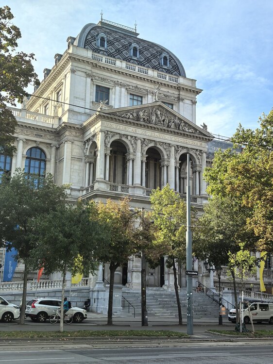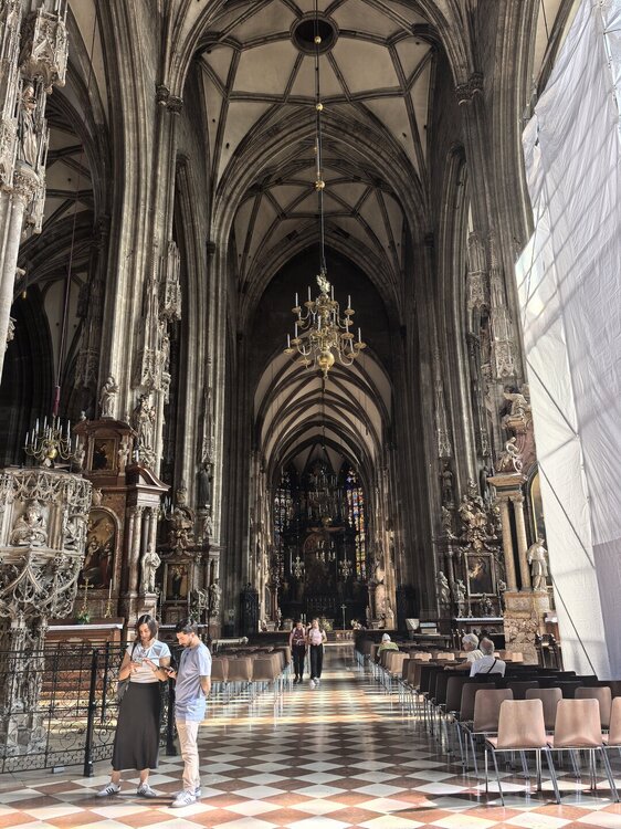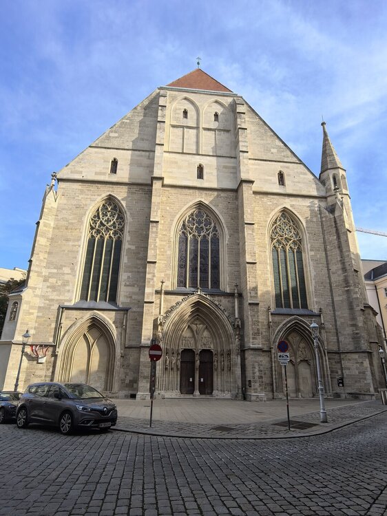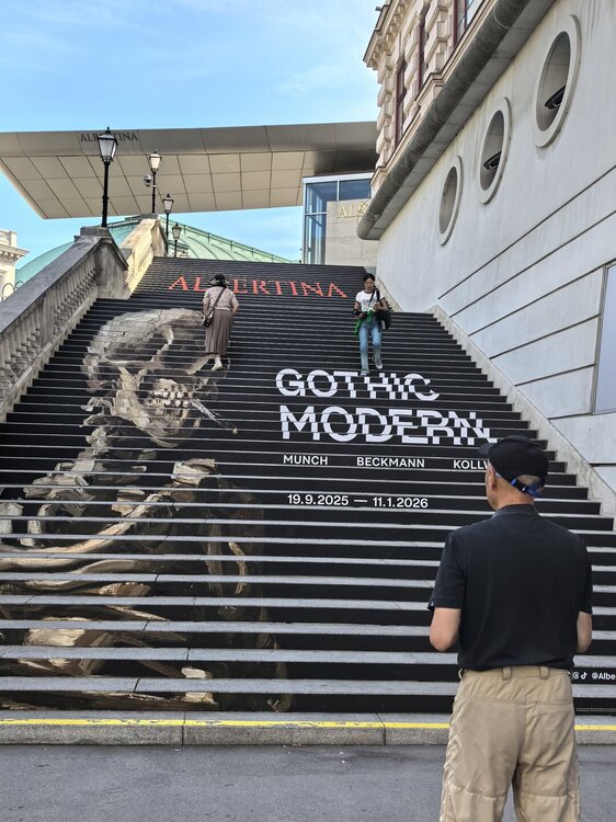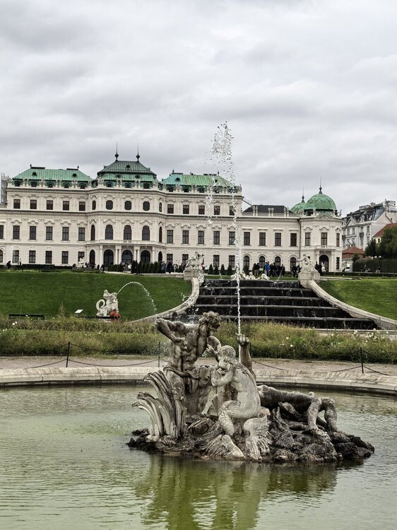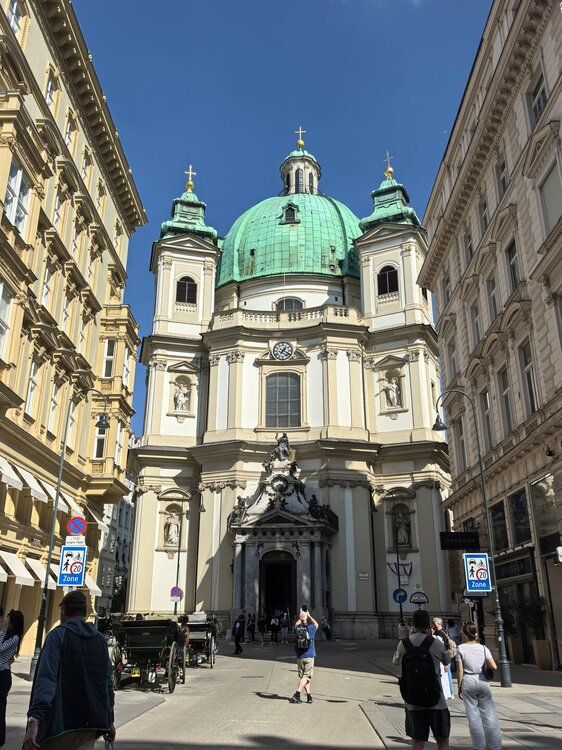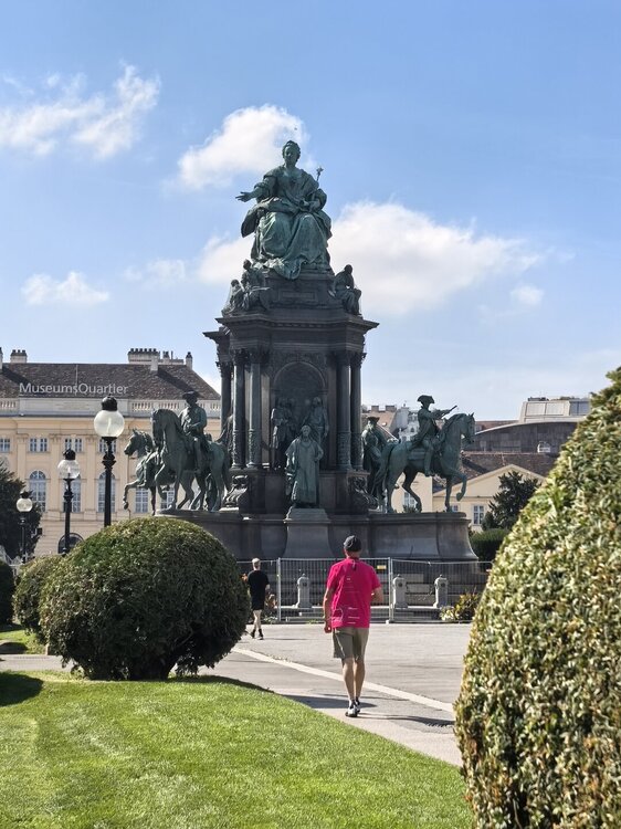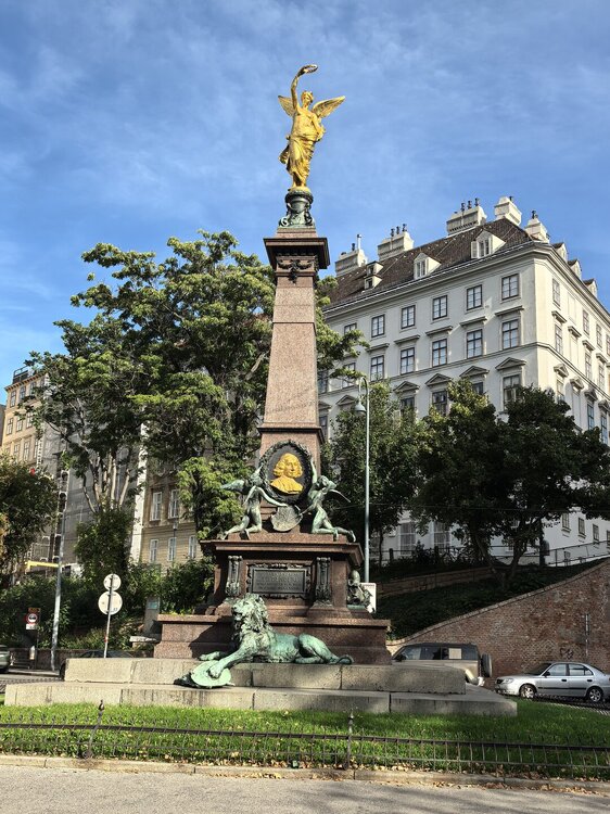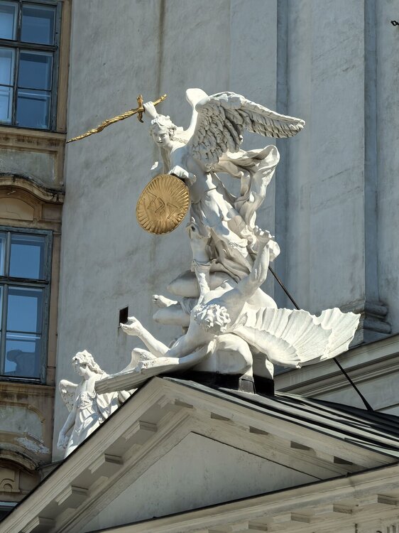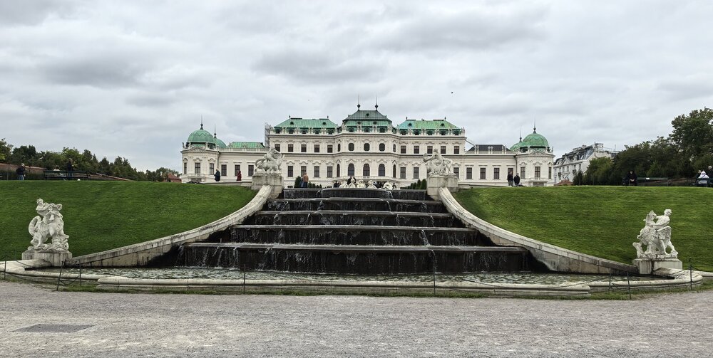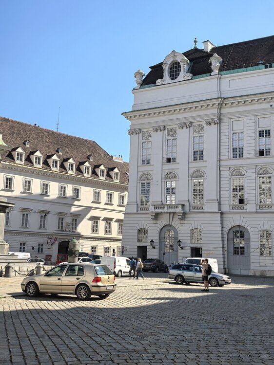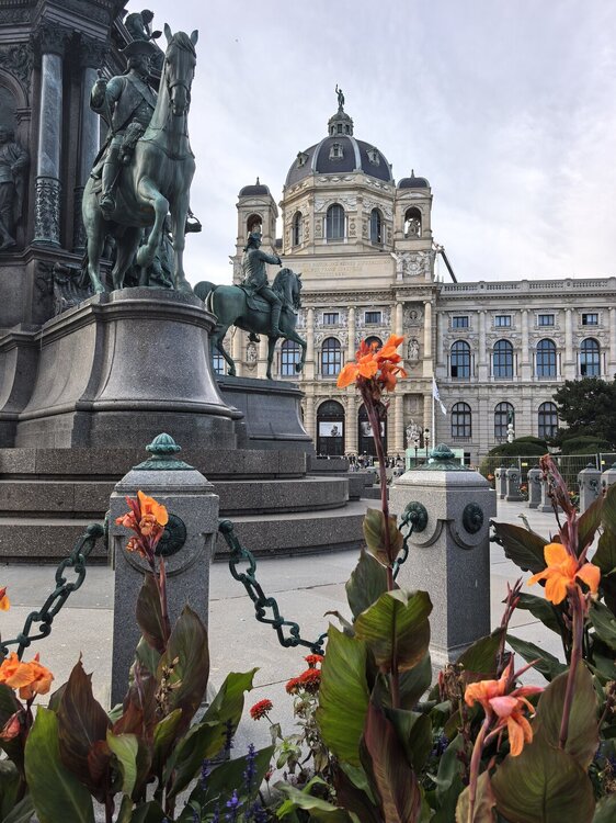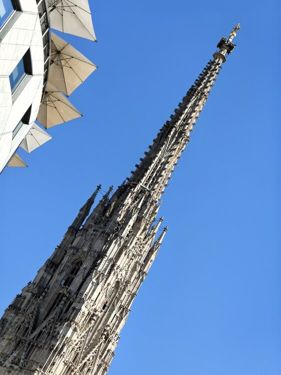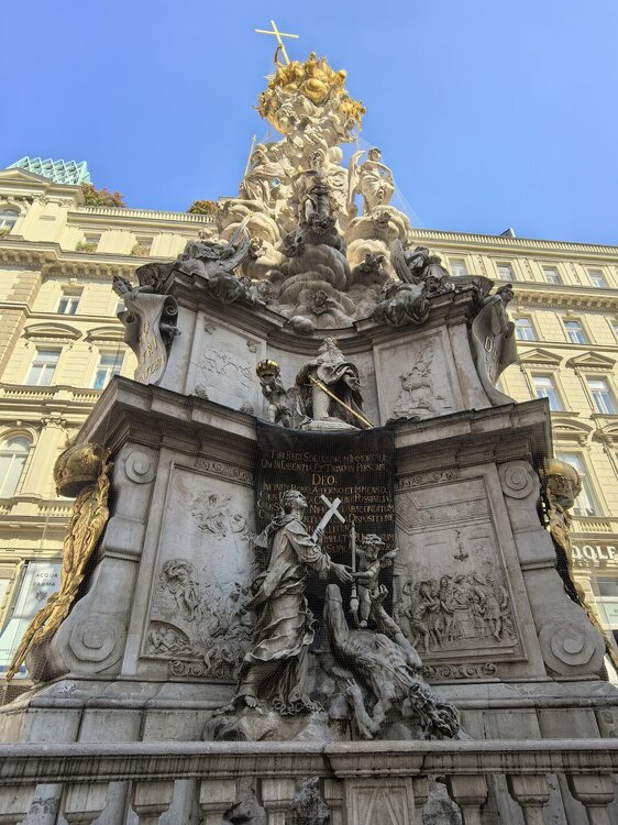 А мы продолжаем наши прогулки. Гид с нами распрощалась у Альбертины, у группы чуть позже поездка в Шенбрунн, но я снова мимо. Я слишком долго не видела свою любимую Вену, чтобы рассматривать покои Франца Иосифа. Он, конечно, впечатляющая личность, но не до такой степени)) В Альбертине в роли афиши ступени. За это время мы уже изрядно проголодались и, пока ходили с экскурсией, приметили пару мест со стрит-фудом. Это очередь за знаменитыми венскими хот-догами. Но ждать это не про нас.) Забегаем в Биллу - здесь прекрасный уголок с готовой горячей едой, салатами, кофе, порезанными фруктами и вообще что захотите. Взяла пасту в сливочном соусе, было очень вкусно и сытно. На этикетке указаны цены. И не могла пройти мимо этой бутылочки Швепса, просто обратите внимание на название на ценнике. Если русская, надо брать.)) Хотя, возможно, это уловки)) После вкусного обеда по закону Архимеда полагается... как минимум никуда не бежать, а хотя бы посидеть вот как Гете к примеру Посидеть можно на задворках Хофбурга. Это уже второй раз за поездку вальяжного отдыха в зеленой зоне. Иду на эту башенку, загляну в костёл Святого Августина Внимание тут привлекает это белоснежное надгробие Марии-Кристине Австрийской, дочери Марии Терезы. Автором надгробия является Антонио Канова, который изначально посвятил его Тициану, но не закончил, а тут подвернулся заказ от мужа Марии-Кристины. Это надгробие отличалось от других своей эпохи, т.к. в центре здесь не покойный человек, а сама смерть в виде темных ворот, куда идут безутешные люди, пересекая тем самым черту между тем и этим миром. Лев справа - символ рода Габсбургов. Достаточно грустных историй, идём гулять в цветники Жимеш выбор сада одобряет Среди зданий увидела очертания явно какого-то религиозного сооружения Это храм огромный Миноритов, основанный в 14 веке. Вокруг абсолютная тишина и никого. Выглядел он как закрытый, лишь позади люди собирались на какое-то мероприятие и выглядели весьма загадочно, все в черном, но обывательском. Пройдемся немного по рингу Сюда вернемся завтра, а пока взгляд издалека. Площадь перед храмом только для быстрых пешеходов с хорошей реакцией, потому что по ней ездят трамваи и автомобили по кольцу с перекрестками. Представляю как ломали головы архитекторы, когда думали что же сделать с этим огромным пустырем. У Ратуши что-то разбирали. Кажется, гид говорила, что был фестиваль вина. Заходим в костел Святого Михаила, где впервые прозвучал реквием Моцарта. Очень красивая алтарная часть, изображающая падение ангелов. На переднем плане чудотворный образ Марии Кандии, привезенный с острова Крит. Орган 18 века А это уже храм Святого Петра на Грабен Потом на нас напали сувенирные магазины и немного наследили в телефоне Вот что бывает с теми кто любит гулять по Вене)) а что, зато удобно А мы уходим в противоположную сторону от Собора Святого Стефана Чтобы немножечко погулять не фестивале Просто огромные бретцели с разными начинками, а есть предательски не хотелось VID_20250922_190224.mp4 Возвращаемся к Собору Святого Стефана, я хочу увидеть подсветку. Но... Моему разочарованию не было предела - этот собор не был подсвечен архитектурно. А так, по-свойски.. Солнышко и то лучше светит Выйдя на ринг, к месту встречи с группой и потом ехав в автобусе, я обратила внимание, что Вена в принципе плохо подсвечена. Я списал