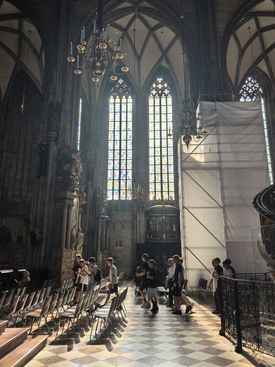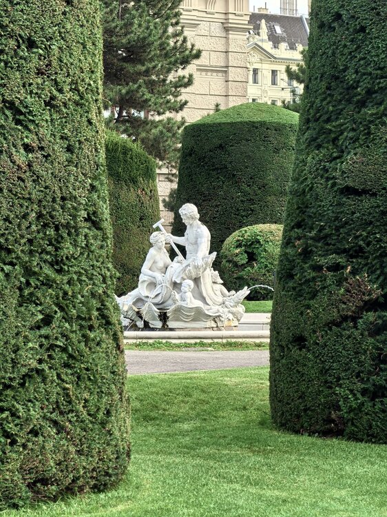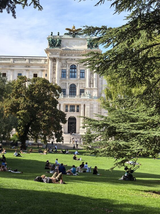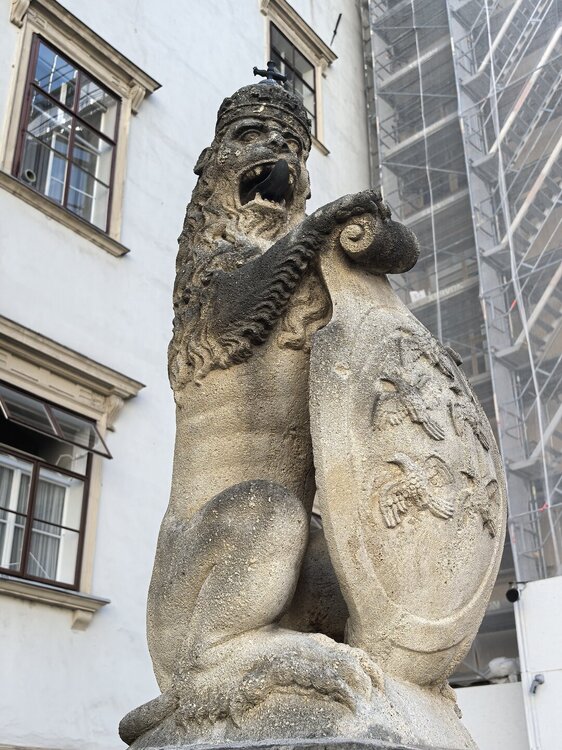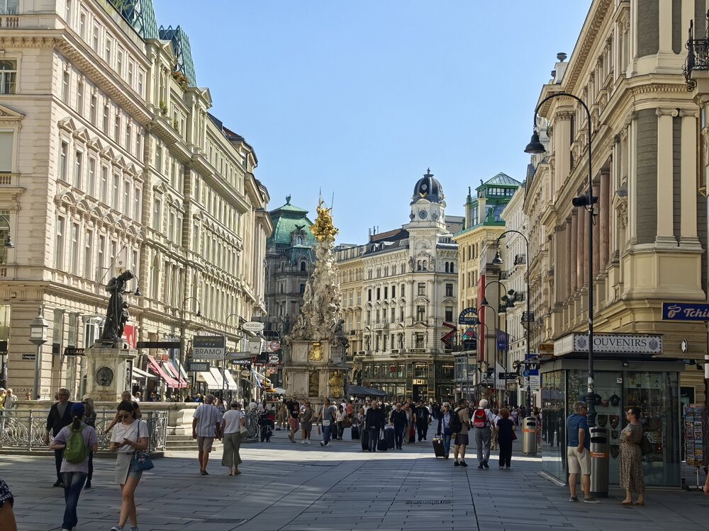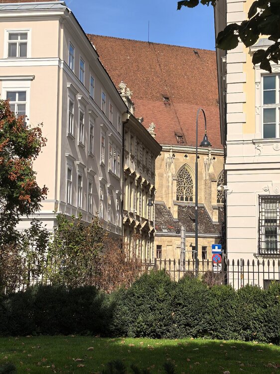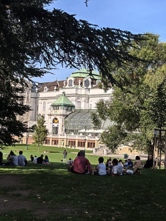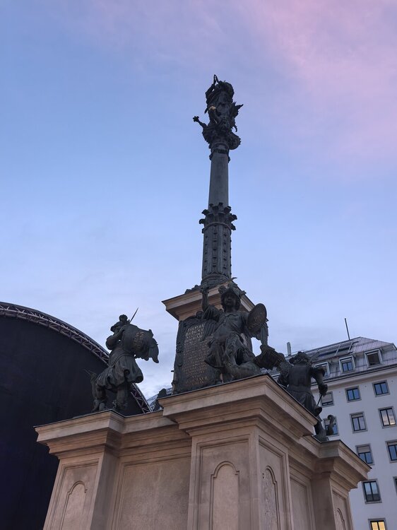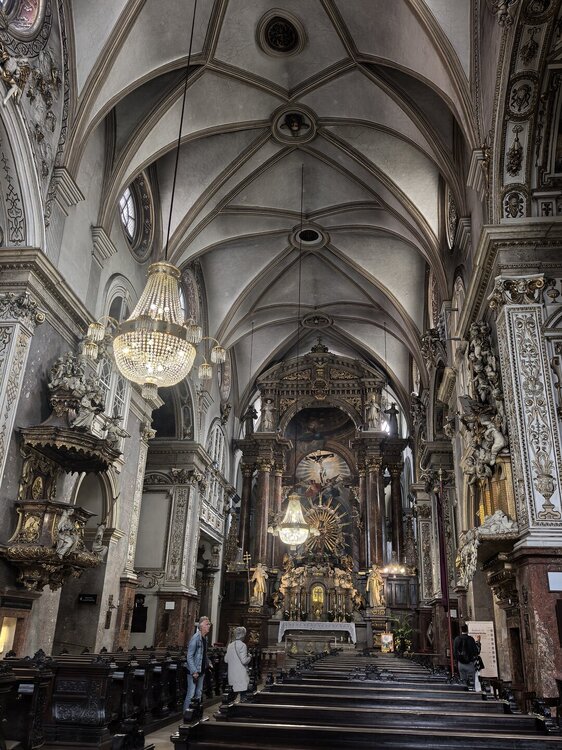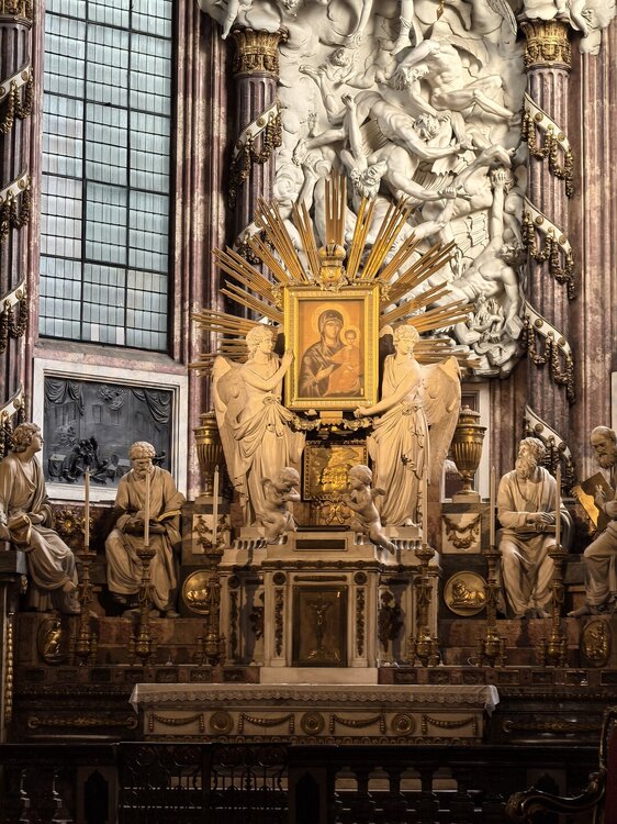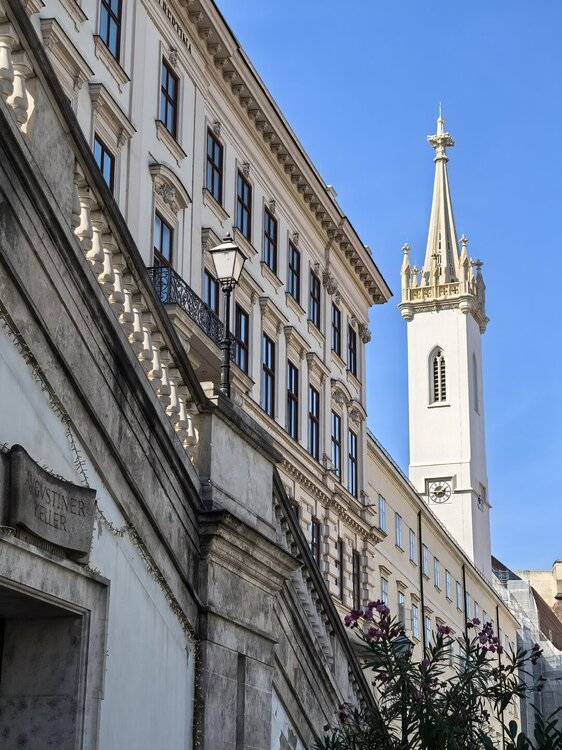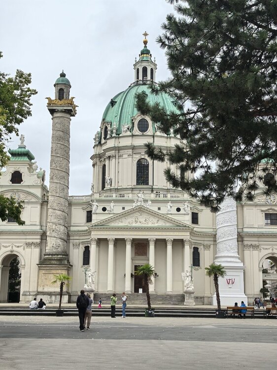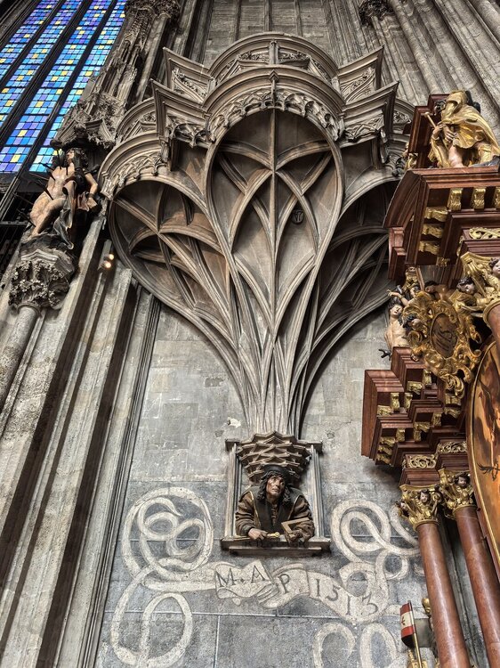 А мы продолжаем наши прогулки. Гид с нами распрощалась у Альбертины, у группы чуть позже поездка в Шенбрунн, но я снова мимо. Я слишком долго не видела свою любимую Вену, чтобы рассматривать покои Франца Иосифа. Он, конечно, впечатляющая личность, но не до такой степени)) В Альбертине в роли афиши ступени. За это время мы уже изрядно проголодались и, пока ходили с экскурсией, приметили пару мест со стрит-фудом. Это очередь за знаменитыми венскими хот-догами. Но ждать это не про нас.) Забегаем в Биллу - здесь прекрасный уголок с готовой горячей едой, салатами, кофе, порезанными фруктами и вообще что захотите. Взяла пасту в сливочном соусе, было очень вкусно и сытно. На этикетке указаны цены. И не могла пройти мимо этой бутылочки Швепса, просто обратите внимание на название на ценнике. Если русская, надо брать.)) Хотя, возможно, это уловки)) После вкусного обеда по закону Архимеда полагается... как минимум никуда не бежать, а хотя бы посидеть вот как Гете к примеру Посидеть можно на задворках Хофбурга. Это уже второй раз за поездку вальяжного отдыха в зеленой зоне. Иду на эту башенку, загляну в костёл Святого Августина Внимание тут привлекает это белоснежное надгробие Марии-Кристине Австрийской, дочери Марии Терезы. Автором надгробия является Антонио Канова, который изначально посвятил его Тициану, но не закончил, а тут подвернулся заказ от мужа Марии-Кристины. Это надгробие отличалось от других своей эпохи, т.к. в центре здесь не покойный человек, а сама смерть в виде темных ворот, куда идут безутешные люди, пересекая тем самым черту между тем и этим миром. Лев справа - символ рода Габсбургов. Достаточно грустных историй, идём гулять в цветники Жимеш выбор сада одобряет Среди зданий увидела очертания явно какого-то религиозного сооружения Это храм огромный Миноритов, основанный в 14 веке. Вокруг абсолютная тишина и никого. Выглядел он как закрытый, лишь позади люди собирались на какое-то мероприятие и выглядели весьма загадочно, все в черном, но обывательском. Пройдемся немного по рингу Сюда вернемся завтра, а пока взгляд издалека. Площадь перед храмом только для быстрых пешеходов с хорошей реакцией, потому что по ней ездят трамваи и автомобили по кольцу с перекрестками. Представляю как ломали головы архитекторы, когда думали что же сделать с этим огромным пустырем. У Ратуши что-то разбирали. Кажется, гид говорила, что был фестиваль вина. Заходим в костел Святого Михаила, где впервые прозвучал реквием Моцарта. Очень красивая алтарная часть, изображающая падение ангелов. На переднем плане чудотворный образ Марии Кандии, привезенный с острова Крит. Орган 18 века А это уже храм Святого Петра на Грабен Потом на нас напали сувенирные магазины и немного наследили в телефоне Вот что бывает с теми кто любит гулять по Вене)) а что, зато удобно А мы уходим в противоположную сторону от Собора Святого Стефана Чтобы немножечко погулять не фестивале Просто огромные бретцели с разными начинками, а есть предательски не хотелось VID_20250922_190224.mp4 Возвращаемся к Собору Святого Стефана, я хочу увидеть подсветку. Но... Моему разочарованию не было предела - этот собор не был подсвечен архитектурно. А так, по-свойски.. Солнышко и то лучше светит Выйдя на ринг, к месту встречи с группой и потом ехав в автобусе, я обратила внимание, что Вена в принципе плохо подсвечена. Я списал