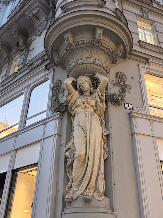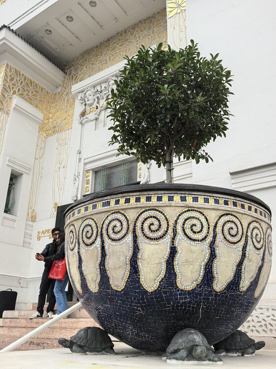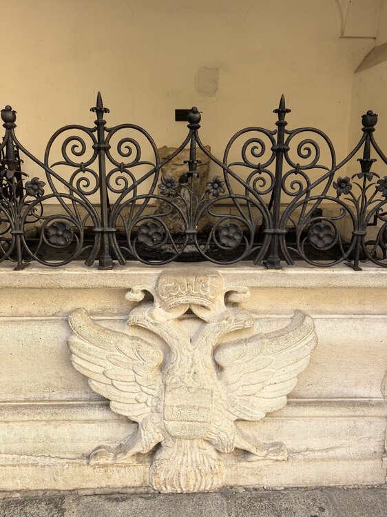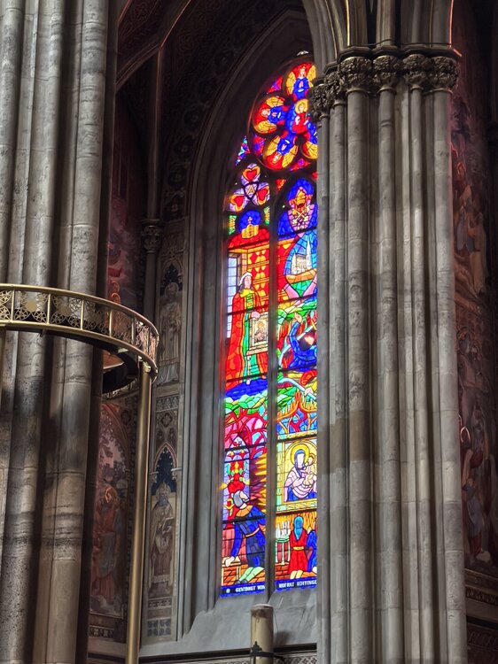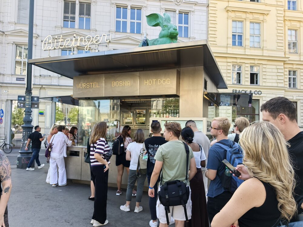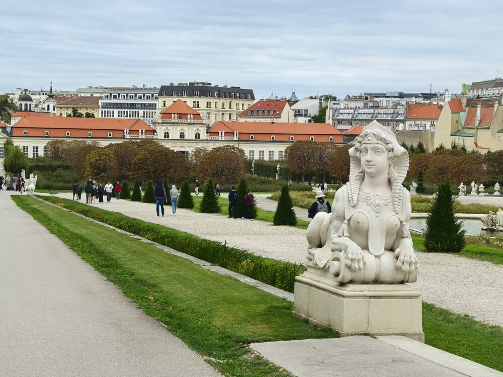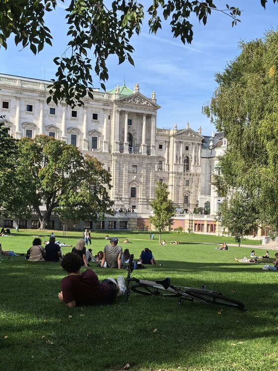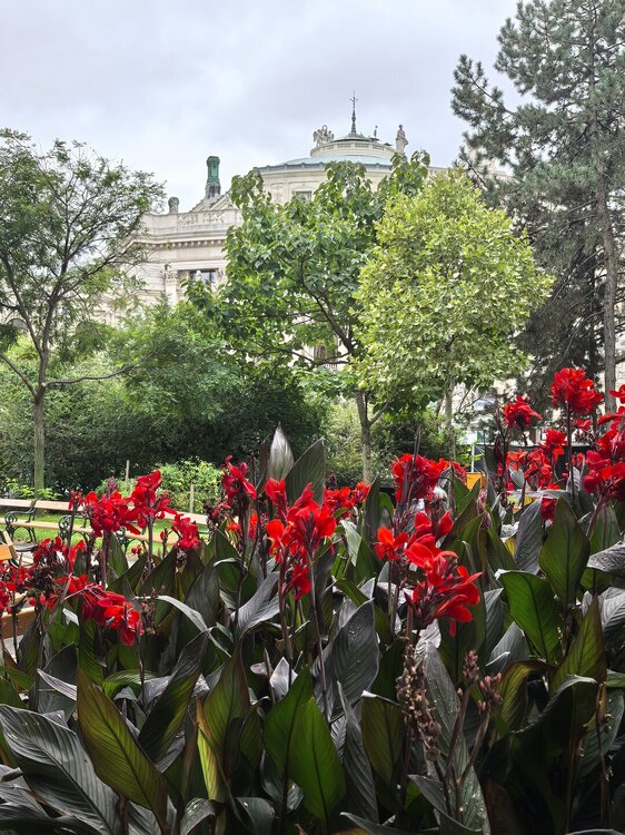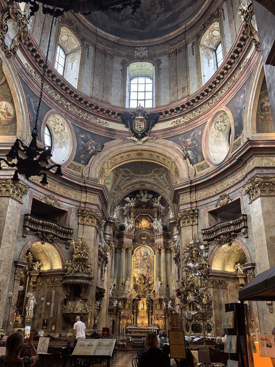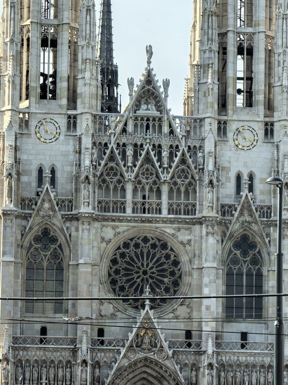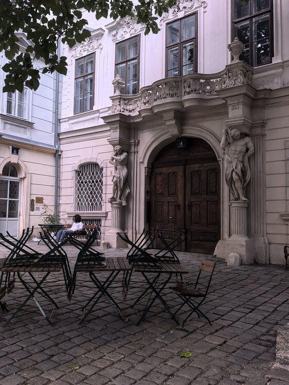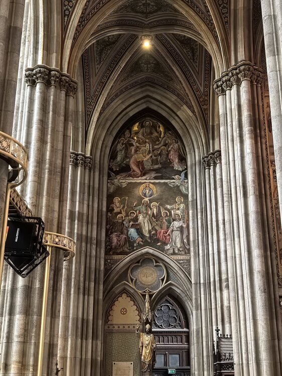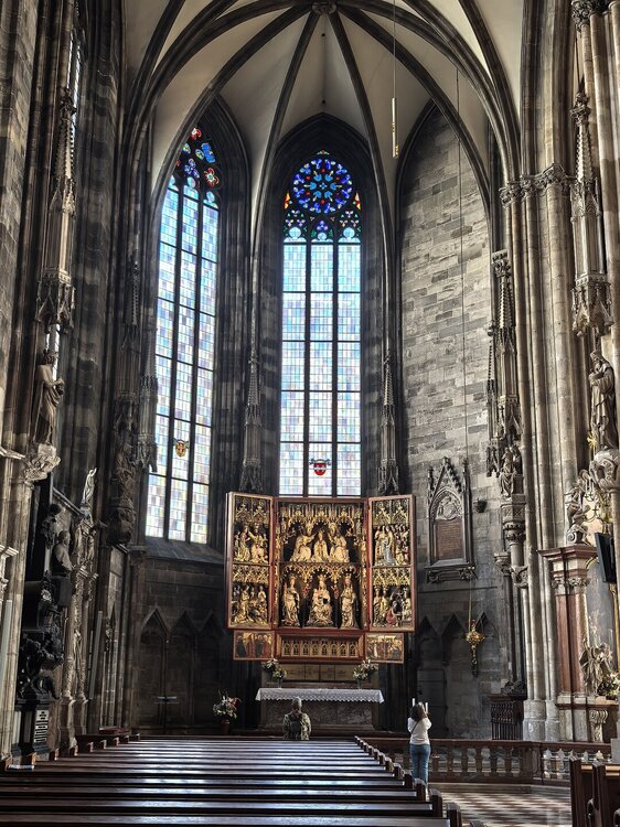 А мы продолжаем наши прогулки. Гид с нами распрощалась у Альбертины, у группы чуть позже поездка в Шенбрунн, но я снова мимо. Я слишком долго не видела свою любимую Вену, чтобы рассматривать покои Франца Иосифа. Он, конечно, впечатляющая личность, но не до такой степени)) В Альбертине в роли афиши ступени. За это время мы уже изрядно проголодались и, пока ходили с экскурсией, приметили пару мест со стрит-фудом. Это очередь за знаменитыми венскими хот-догами. Но ждать это не про нас.) Забегаем в Биллу - здесь прекрасный уголок с готовой горячей едой, салатами, кофе, порезанными фруктами и вообще что захотите. Взяла пасту в сливочном соусе, было очень вкусно и сытно. На этикетке указаны цены. И не могла пройти мимо этой бутылочки Швепса, просто обратите внимание на название на ценнике. Если русская, надо брать.)) Хотя, возможно, это уловки)) После вкусного обеда по закону Архимеда полагается... как минимум никуда не бежать, а хотя бы посидеть вот как Гете к примеру Посидеть можно на задворках Хофбурга. Это уже второй раз за поездку вальяжного отдыха в зеленой зоне. Иду на эту башенку, загляну в костёл Святого Августина Внимание тут привлекает это белоснежное надгробие Марии-Кристине Австрийской, дочери Марии Терезы. Автором надгробия является Антонио Канова, который изначально посвятил его Тициану, но не закончил, а тут подвернулся заказ от мужа Марии-Кристины. Это надгробие отличалось от других своей эпохи, т.к. в центре здесь не покойный человек, а сама смерть в виде темных ворот, куда идут безутешные люди, пересекая тем самым черту между тем и этим миром. Лев справа - символ рода Габсбургов. Достаточно грустных историй, идём гулять в цветники Жимеш выбор сада одобряет Среди зданий увидела очертания явно какого-то религиозного сооружения Это храм огромный Миноритов, основанный в 14 веке. Вокруг абсолютная тишина и никого. Выглядел он как закрытый, лишь позади люди собирались на какое-то мероприятие и выглядели весьма загадочно, все в черном, но обывательском. Пройдемся немного по рингу Сюда вернемся завтра, а пока взгляд издалека. Площадь перед храмом только для быстрых пешеходов с хорошей реакцией, потому что по ней ездят трамваи и автомобили по кольцу с перекрестками. Представляю как ломали головы архитекторы, когда думали что же сделать с этим огромным пустырем. У Ратуши что-то разбирали. Кажется, гид говорила, что был фестиваль вина. Заходим в костел Святого Михаила, где впервые прозвучал реквием Моцарта. Очень красивая алтарная часть, изображающая падение ангелов. На переднем плане чудотворный образ Марии Кандии, привезенный с острова Крит. Орган 18 века А это уже храм Святого Петра на Грабен Потом на нас напали сувенирные магазины и немного наследили в телефоне Вот что бывает с теми кто любит гулять по Вене)) а что, зато удобно А мы уходим в противоположную сторону от Собора Святого Стефана Чтобы немножечко погулять не фестивале Просто огромные бретцели с разными начинками, а есть предательски не хотелось VID_20250922_190224.mp4 Возвращаемся к Собору Святого Стефана, я хочу увидеть подсветку. Но... Моему разочарованию не было предела - этот собор не был подсвечен архитектурно. А так, по-свойски.. Солнышко и то лучше светит Выйдя на ринг, к месту встречи с группой и потом ехав в автобусе, я обратила внимание, что Вена в принципе плохо подсвечена. Я списал