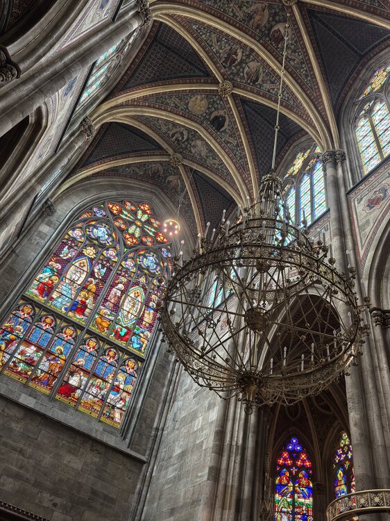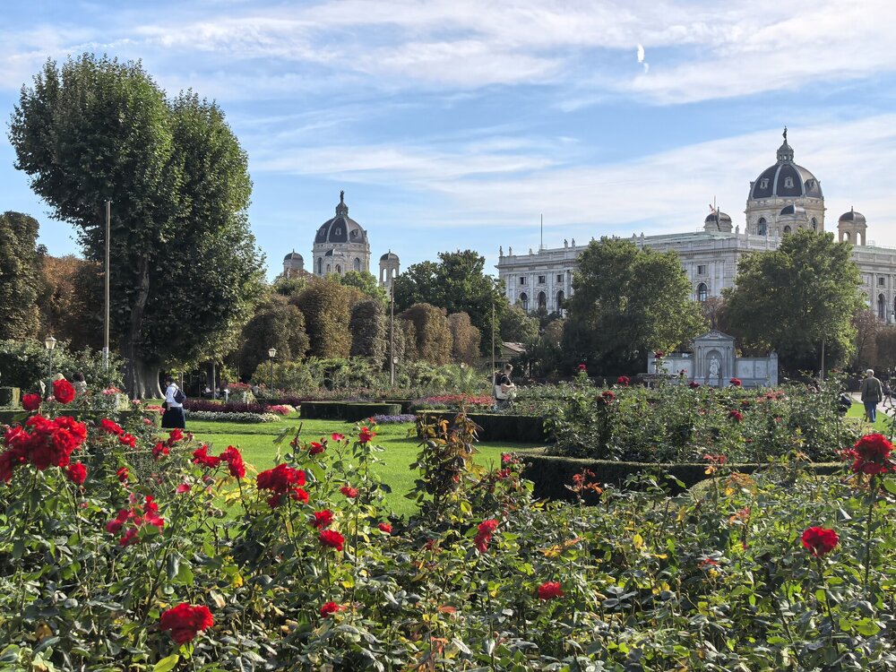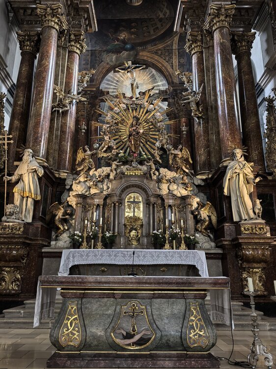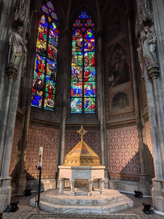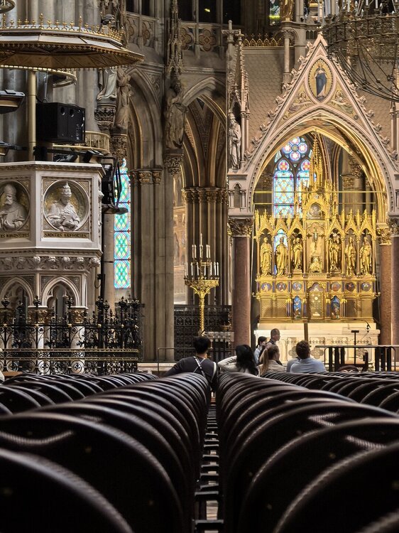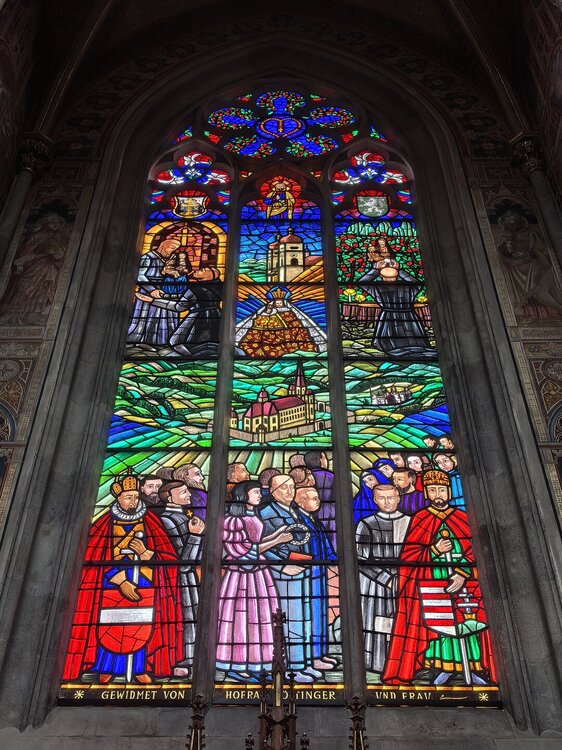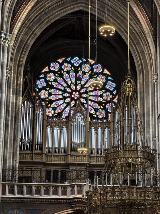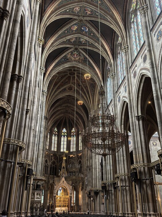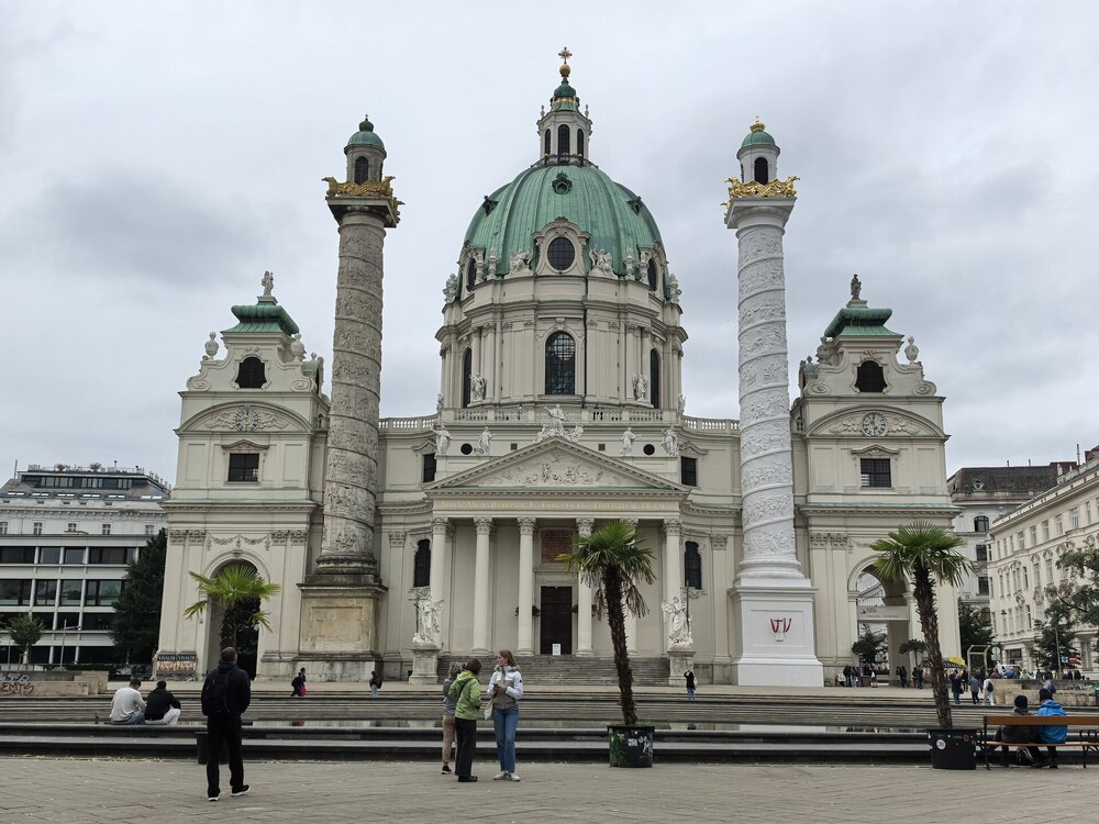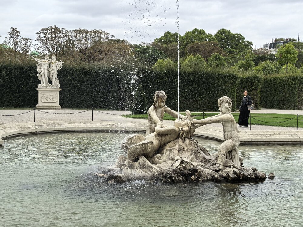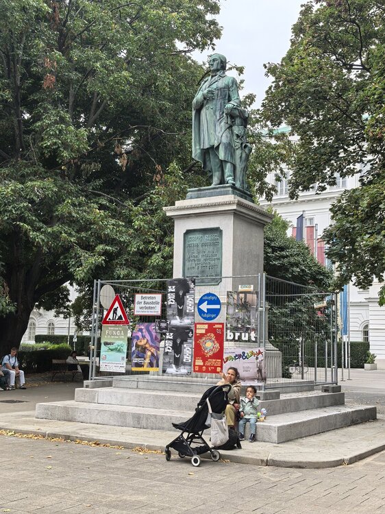 А мы продолжаем наши прогулки. Гид с нами распрощалась у Альбертины, у группы чуть позже поездка в Шенбрунн, но я снова мимо. Я слишком долго не видела свою любимую Вену, чтобы рассматривать покои Франца Иосифа. Он, конечно, впечатляющая личность, но не до такой степени)) В Альбертине в роли афиши ступени. За это время мы уже изрядно проголодались и, пока ходили с экскурсией, приметили пару мест со стрит-фудом. Это очередь за знаменитыми венскими хот-догами. Но ждать это не про нас.) Забегаем в Биллу - здесь прекрасный уголок с готовой горячей едой, салатами, кофе, порезанными фруктами и вообще что захотите. Взяла пасту в сливочном соусе, было очень вкусно и сытно. На этикетке указаны цены. И не могла пройти мимо этой бутылочки Швепса, просто обратите внимание на название на ценнике. Если русская, надо брать.)) Хотя, возможно, это уловки)) После вкусного обеда по закону Архимеда полагается... как минимум никуда не бежать, а хотя бы посидеть вот как Гете к примеру Посидеть можно на задворках Хофбурга. Это уже второй раз за поездку вальяжного отдыха в зеленой зоне. Иду на эту башенку, загляну в костёл Святого Августина Внимание тут привлекает это белоснежное надгробие Марии-Кристине Австрийской, дочери Марии Терезы. Автором надгробия является Антонио Канова, который изначально посвятил его Тициану, но не закончил, а тут подвернулся заказ от мужа Марии-Кристины. Это надгробие отличалось от других своей эпохи, т.к. в центре здесь не покойный человек, а сама смерть в виде темных ворот, куда идут безутешные люди, пересекая тем самым черту между тем и этим миром. Лев справа - символ рода Габсбургов. Достаточно грустных историй, идём гулять в цветники Жимеш выбор сада одобряет Среди зданий увидела очертания явно какого-то религиозного сооружения Это храм огромный Миноритов, основанный в 14 веке. Вокруг абсолютная тишина и никого. Выглядел он как закрытый, лишь позади люди собирались на какое-то мероприятие и выглядели весьма загадочно, все в черном, но обывательском. Пройдемся немного по рингу Сюда вернемся завтра, а пока взгляд издалека. Площадь перед храмом только для быстрых пешеходов с хорошей реакцией, потому что по ней ездят трамваи и автомобили по кольцу с перекрестками. Представляю как ломали головы архитекторы, когда думали что же сделать с этим огромным пустырем. У Ратуши что-то разбирали. Кажется, гид говорила, что был фестиваль вина. Заходим в костел Святого Михаила, где впервые прозвучал реквием Моцарта. Очень красивая алтарная часть, изображающая падение ангелов. На переднем плане чудотворный образ Марии Кандии, привезенный с острова Крит. Орган 18 века А это уже храм Святого Петра на Грабен Потом на нас напали сувенирные магазины и немного наследили в телефоне Вот что бывает с теми кто любит гулять по Вене)) а что, зато удобно А мы уходим в противоположную сторону от Собора Святого Стефана Чтобы немножечко погулять не фестивале Просто огромные бретцели с разными начинками, а есть предательски не хотелось VID_20250922_190224.mp4 Возвращаемся к Собору Святого Стефана, я хочу увидеть подсветку. Но... Моему разочарованию не было предела - этот собор не был подсвечен архитектурно. А так, по-свойски.. Солнышко и то лучше светит Выйдя на ринг, к месту встречи с группой и потом ехав в автобусе, я обратила внимание, что Вена в принципе плохо подсвечена. Я списал