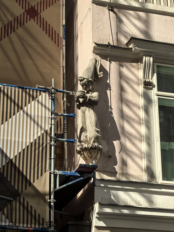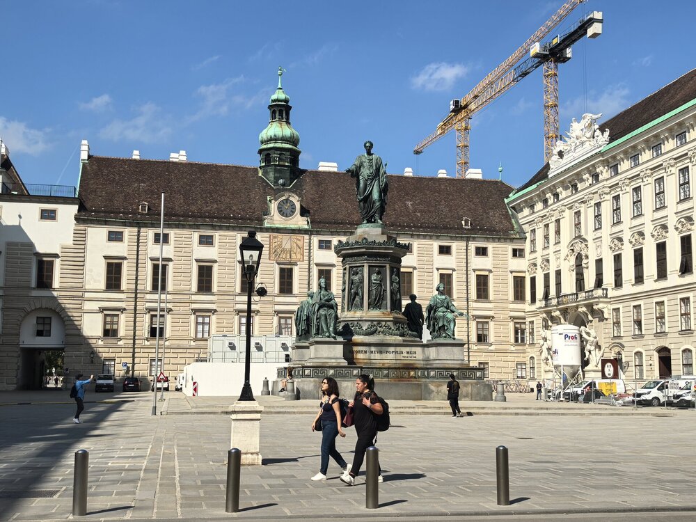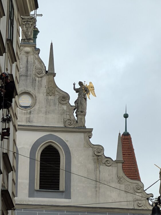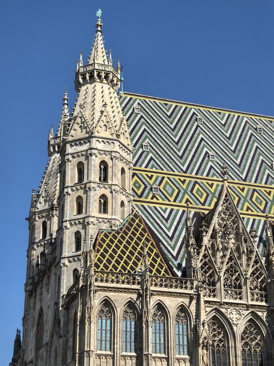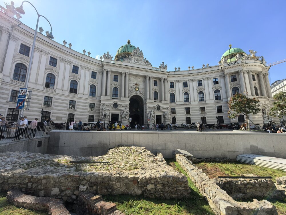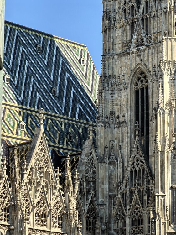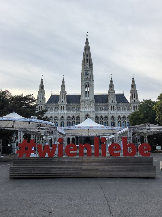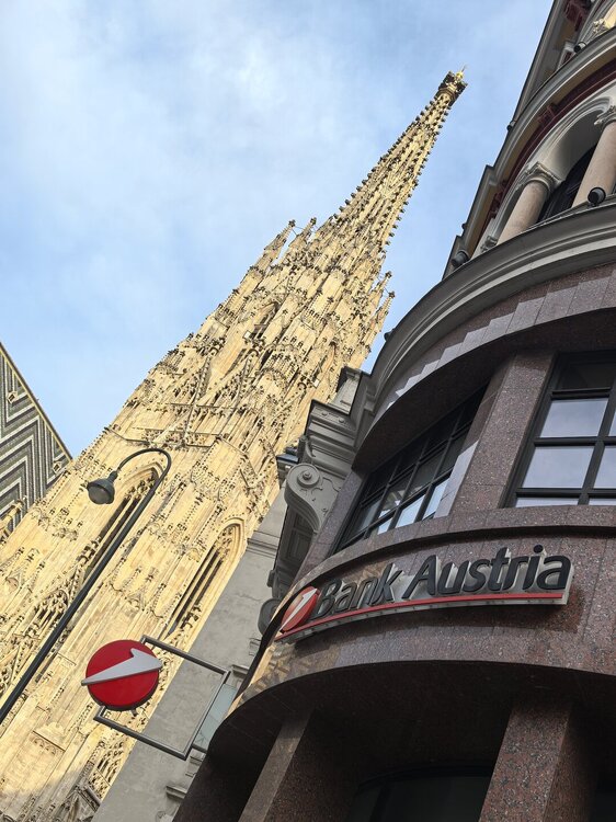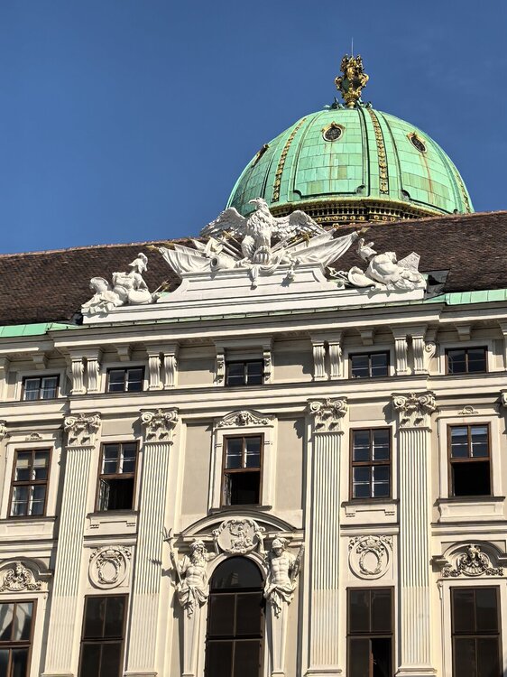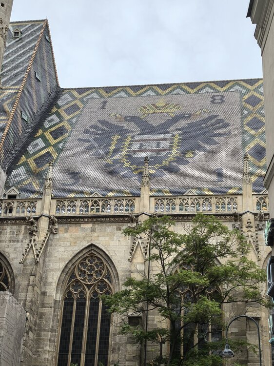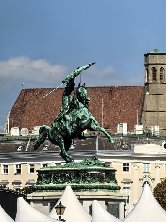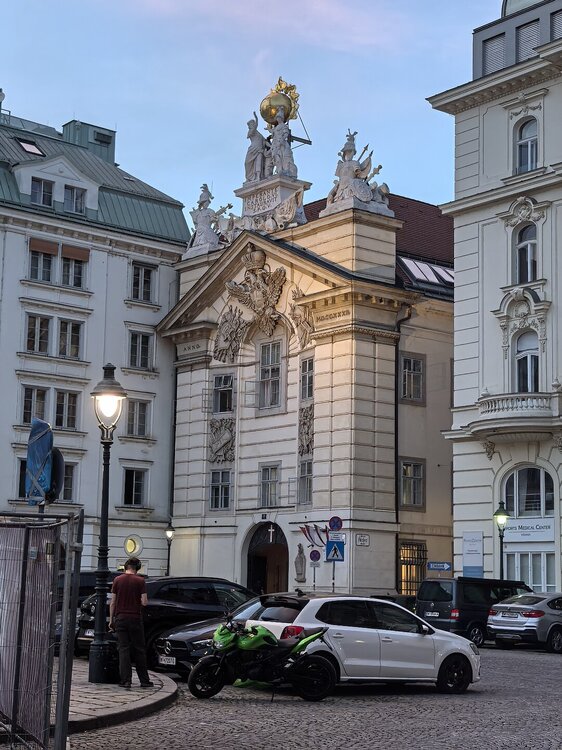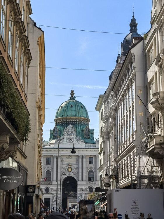 Через 15 минут нас высаживают уже на площади Марии Терезы. Танцую от счастья. А вот она и сама Как и полагается, экскурсия начинается от Хофбурга, а тут что-то то ли собирают, то ли разбирают Идём знакомыми дорогами, слушаем про Габсбургов и, конечно, Сиси. Здесь останавливаемся у сохранившейся стены старого храма, искусно вмонтированную в более современное здание. Фотограф тут снимал лав-стори, а я старину. Оставшаяся с войны надпись - квартал проверен. Прямо на русском, да. Я подсмотрела в интернетах дату освобождения Вены - 13 апреля 1945 года. У нас в Воронеже есть аналогичная, аналогично заботливо оставленная и не закрашенная. Выходим на Михаэльплац Костел Святого Михаила 13 века, один из старейших готических храмов города. Известен тем, что тут впервые прозвучал реквием Моцарта на его же поминальной службе. Бывшая придворная кондитерская. Известна тем, что именно здесь был изобретен тот самый торт Захер. Ну как здесь... Здесь учился сын Франца Захера, который именно во время обучения дополнил рецепт своего отца. Того самого торта. Разгорелся спор о месте рождения рецепта, который был решен в судебном порядке не в пользу Демель. И вот мы выходим на Грабен. Как всегда шумная и деловая, перекликающаяся множеством языков. Кафедральный Собор Стефана представлять не стоит. Как всегда величественен. Вокруг как обычно яблоку негде упасть, а вечером площадь превратилась в сцену для спикеров о сложной ситуации в мире.