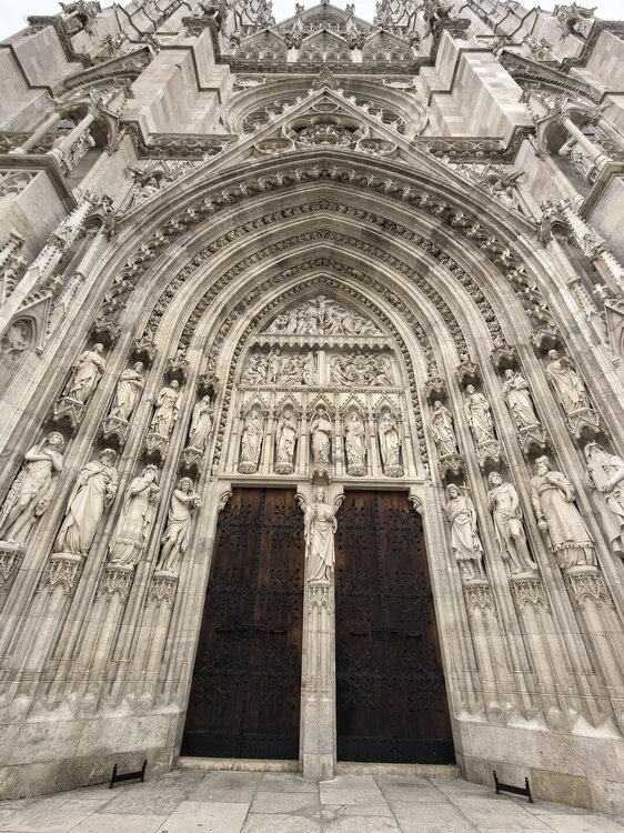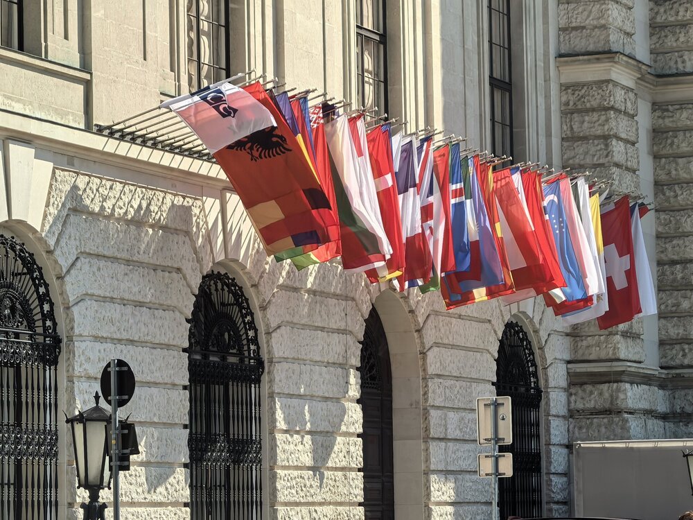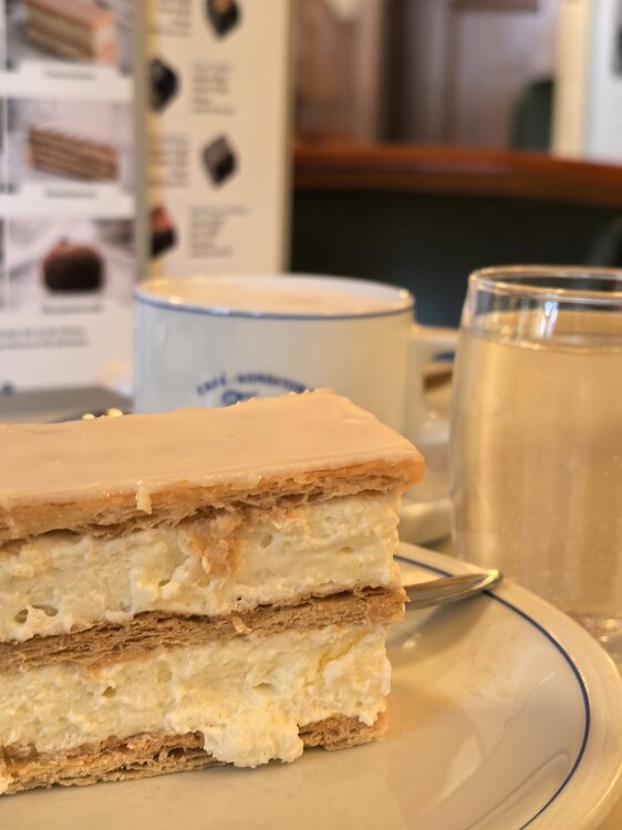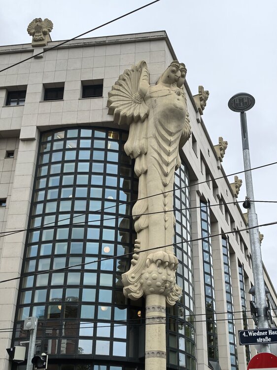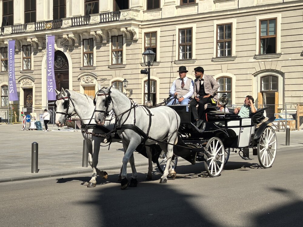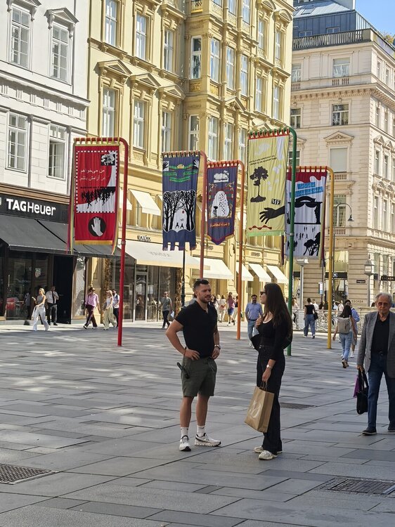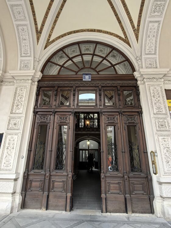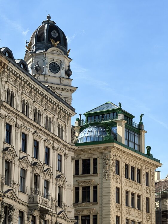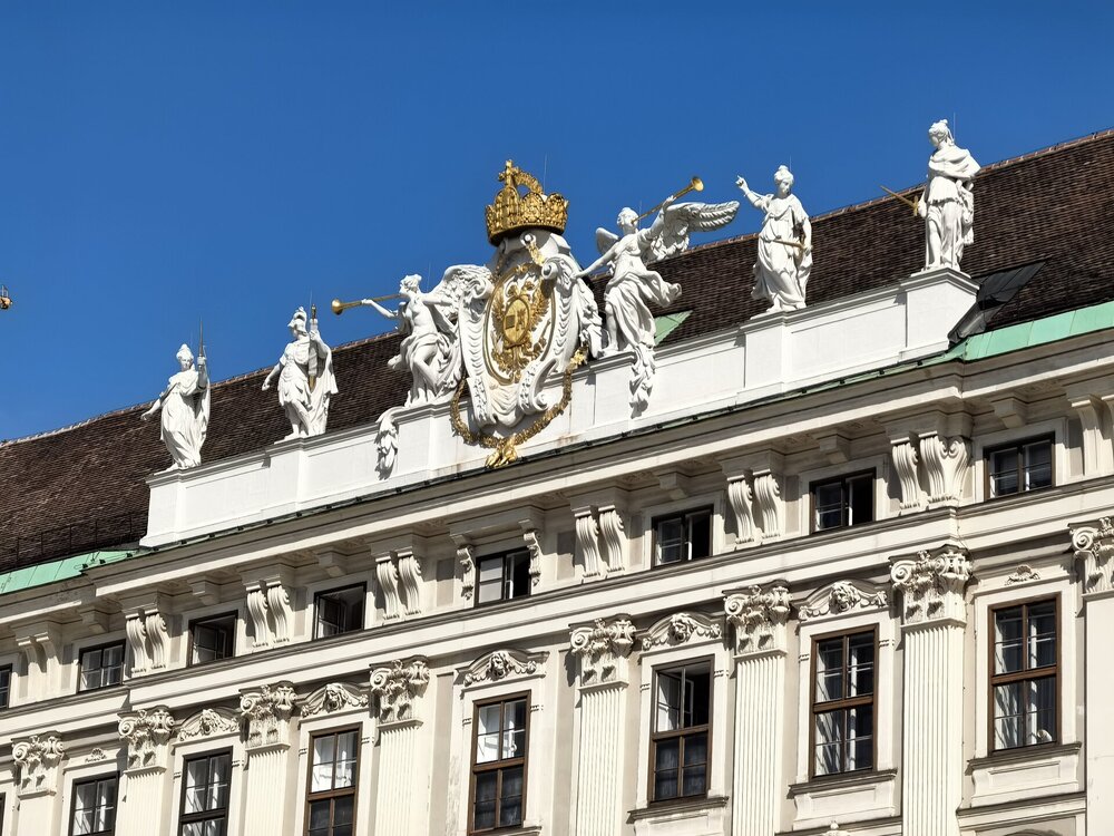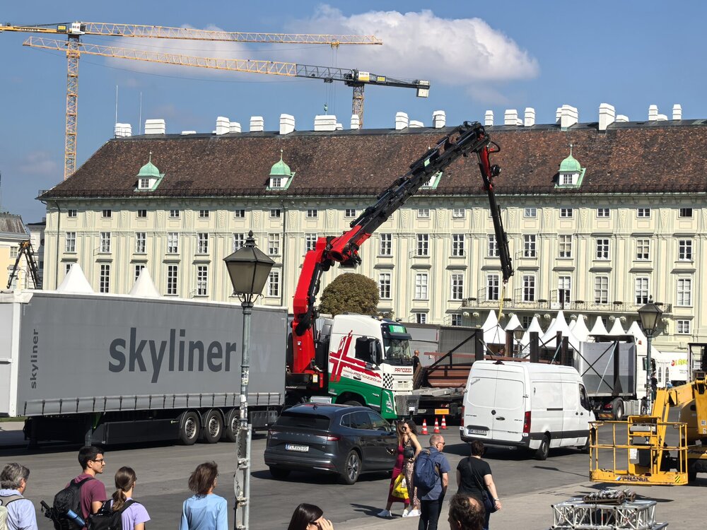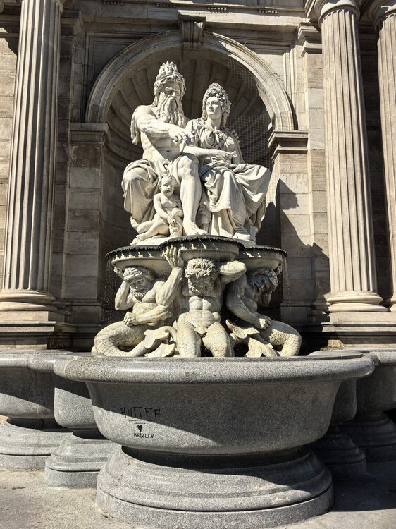 Через 15 минут нас высаживают уже на площади Марии Терезы. Танцую от счастья. А вот она и сама Как и полагается, экскурсия начинается от Хофбурга, а тут что-то то ли собирают, то ли разбирают Идём знакомыми дорогами, слушаем про Габсбургов и, конечно, Сиси. Здесь останавливаемся у сохранившейся стены старого храма, искусно вмонтированную в более современное здание. Фотограф тут снимал лав-стори, а я старину. Оставшаяся с войны надпись - квартал проверен. Прямо на русском, да. Я подсмотрела в интернетах дату освобождения Вены - 13 апреля 1945 года. У нас в Воронеже есть аналогичная, аналогично заботливо оставленная и не закрашенная. Выходим на Михаэльплац Костел Святого Михаила 13 века, один из старейших готических храмов города. Известен тем, что тут впервые прозвучал реквием Моцарта на его же поминальной службе. Бывшая придворная кондитерская. Известна тем, что именно здесь был изобретен тот самый торт Захер. Ну как здесь... Здесь учился сын Франца Захера, который именно во время обучения дополнил рецепт своего отца. Того самого торта. Разгорелся спор о месте рождения рецепта, который был решен в судебном порядке не в пользу Демель. И вот мы выходим на Грабен. Как всегда шумная и деловая, перекликающаяся множеством языков. Кафедральный Собор Стефана представлять не стоит. Как всегда величественен. Вокруг как обычно яблоку негде упасть, а вечером площадь превратилась в сцену для спикеров о сложной ситуации в мире.