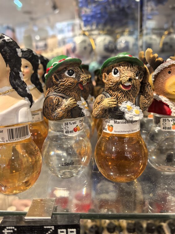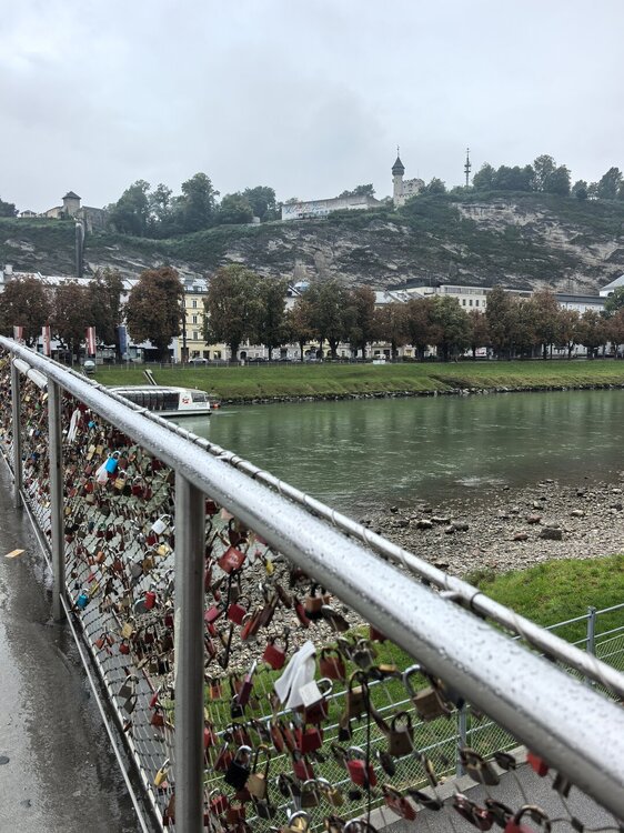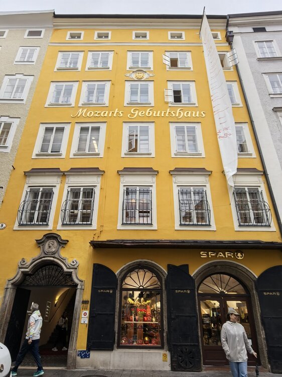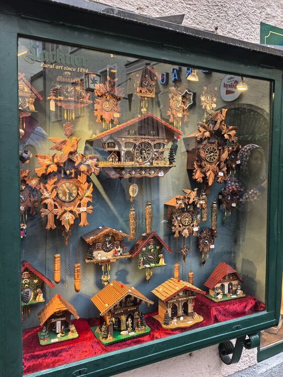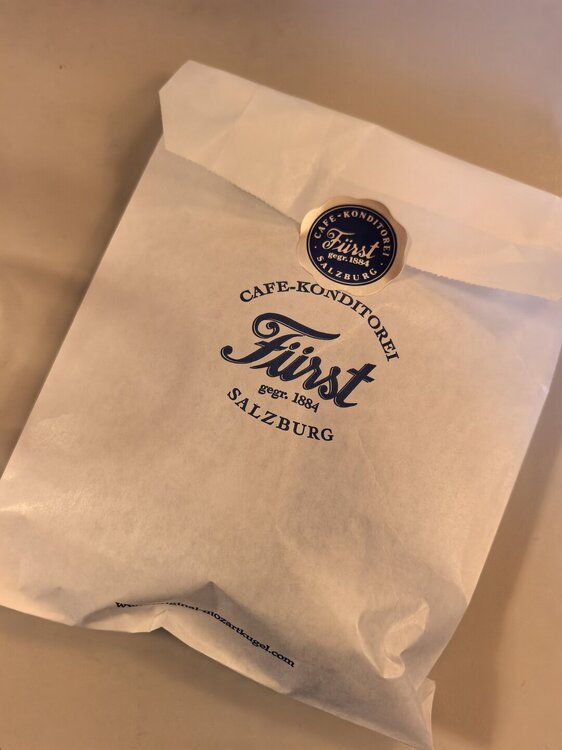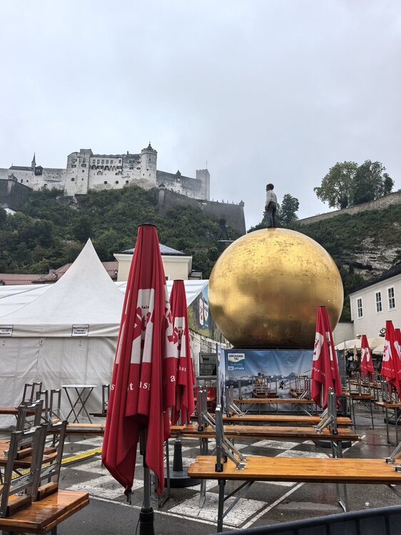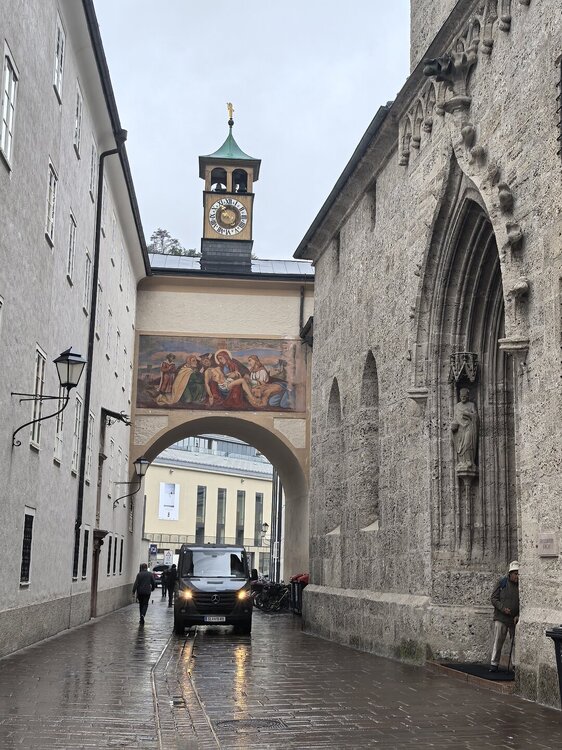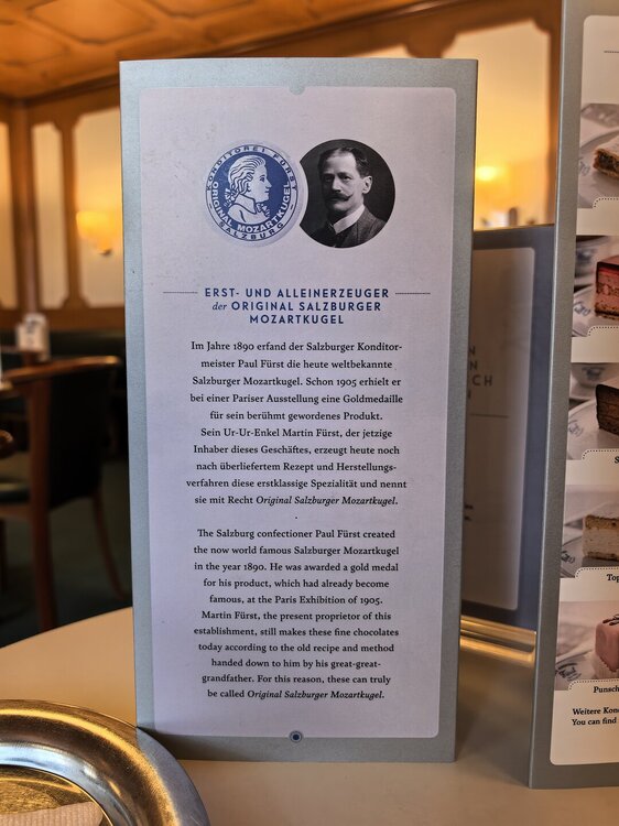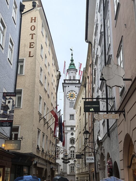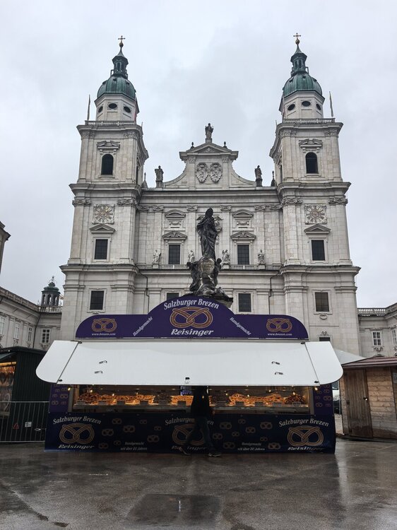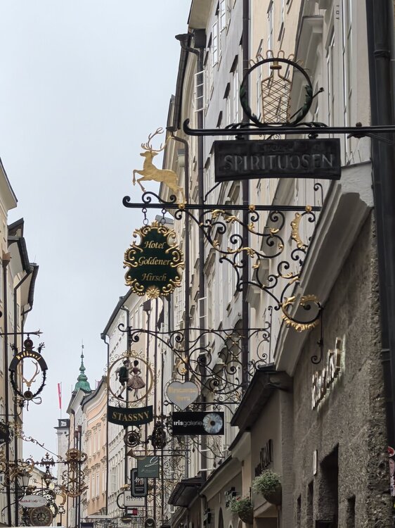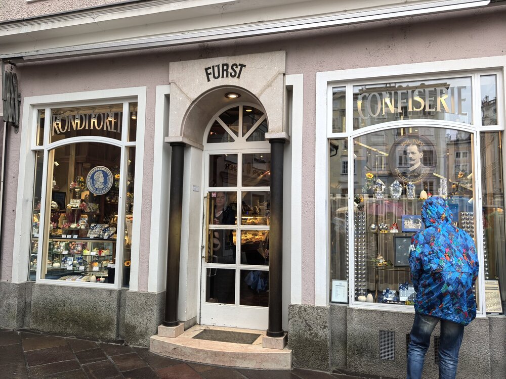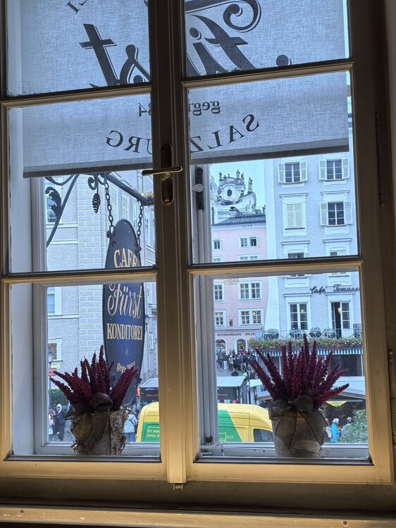 Мы уходим в историческую застройку Зальцбурга, она же торговая. Это мы любим)) А какие витрины манящие! Да ещё хитрые зальцбурчане сделали свои торговые ряды дожде-непроникаемыми. Мальчики могут немного пролистнуть, девочки, смотрим витрины. Мне очень понравилось!) Образ для городского мужчины-охотника)) Ну и всякая всячина. Тут можно и мужчинам посмотреть. Особенно на такие бутылконосители. И руки свободны, и пиво рядом. А это, судя по подтяжкам, одежда для пивного фестиваля как раз)) В одном из сувенирных магазинов встретила магнитики в виде таких часов. Моцарт был бы в шоке... От коммерции тут никуда не деться, а вывески они сделали не менее завораживающими. В Зальцбурге очень узкие улочки, поэтому дома за тобой подсматривают И смотрят сверху вниз А вот и он, дом Моцарта И кафе... Да, то самое, аутентичное, в котором придумали те самые круглые конфеты с изображением Моцарта. Они в серебряно-синей упаковке. Даже если вы купите две конфетки, вам их красиво упакуют. Одна конфетка стоит 2 евро, их можно купить поштучно. К слову упаковка подобных конфет с моцартом в Лидл стоила мне 2,59 евро. НО... Оригинальные конфеты с несколькими пралине, я бы не сказала что там чувствуется марципан, а конфеты из Лидл чистый марципан. Оригинальные конфеты делаются вручную, насаживаются на деревянную палочку и окунаются в шоколад с 60% содержанием какао. Потом это техническое отверстие заполняется шоколадом. Такие конфеты с пупочком получаются. В этом кафе мы решили немного отдохнуть и погреться, это было очень правильное решение. Мой совет, идите сразу на второй этаж, там почти никого нет, а на первое этаже очень шумно. К вам и там подойдут и спросят что вы хотите заказать. Сфотографировала меню для участников форума. Я выбирала десерт по красоте, которую оценила на первом этаже на витрине. Десерты от 5 евро. По поводу этого могу сказать, что коржики весьма твердые, что создает трудности при еде. Но вкусно. В общем кафе нам очень понравилось, уютно и вкусно посидели, обсудили увиденное. Вокруг кафедрального собора была ярмарка, было шумно и весело и, конечно, было много людей. Что изменилось в отрицательную сторону, так то что вход в Собор стал платный. Мы гуляли там абсолютно бесплатно до пандемии, там крестили Моцарта, да и вообще красивый храм, конечно. VID_20250924_100021.mp4 Группа уехала на фуникулере к замку, в небеса и туман, мы же остались здесь. Не знаю, почему-то никак не доберусь до этого замка. Ну погода же... ну не то. В Татрах так шли на верх горы, чтобы посмотреть на Морске око с высоты, а на половине пути обернулись, а там молочная пелена, никаких тебе очей морских))) В общем опять как-то не сложилось, надо возвращаться досматривать)) Какие-то знакомые буквы я там увидела)) VID_20250924_100749.mp4 Конечно, я попробовала этот брецель. Настоящий брецель. Печатный пресс?.. Станком не назовешь)) Позже увидим в Словении такое развлечение для туристов. На площади играли очень веселые музыканты. Не знаю насчет их веселой луши, но допинг у них точно был))) в перерывах они этого и не скрывали. Но, как обычно, только я достаю камеру снимать, так все смолкают.)) VID_20250924_120208.mp4 0% процентов осуждения, 100% понимания. В такой холод в такой одежде сидеть на одном месте сложновато. Немного погуляли подземными ходами Зальцбурга, находящимися в горе. Судя по запаху тут где-то расположена скрытая парковка. И рядом