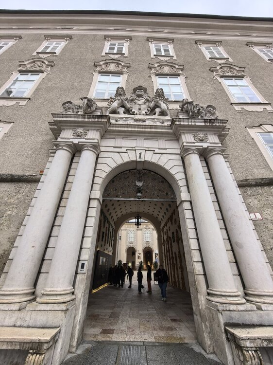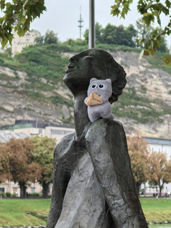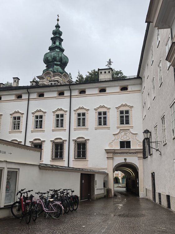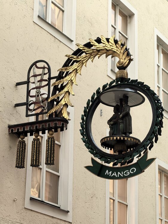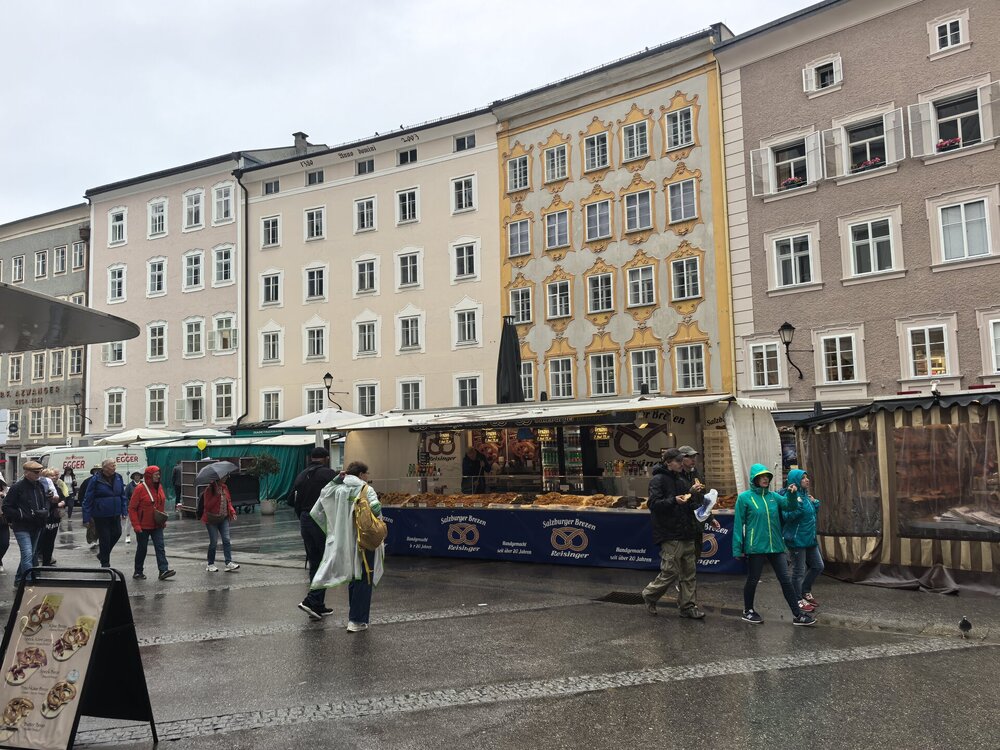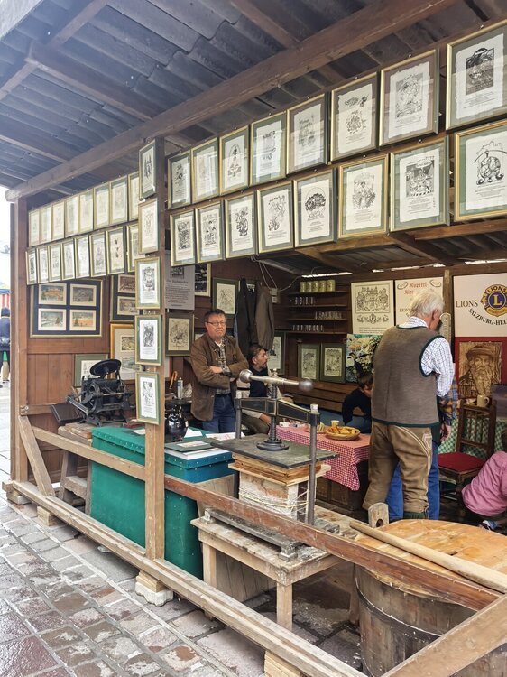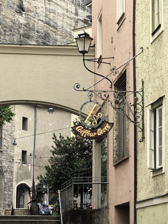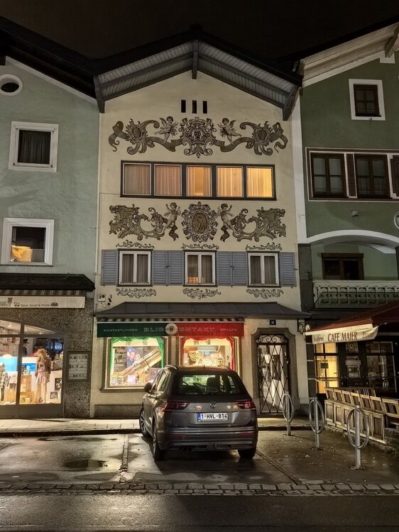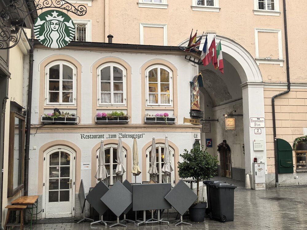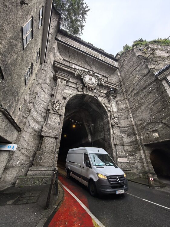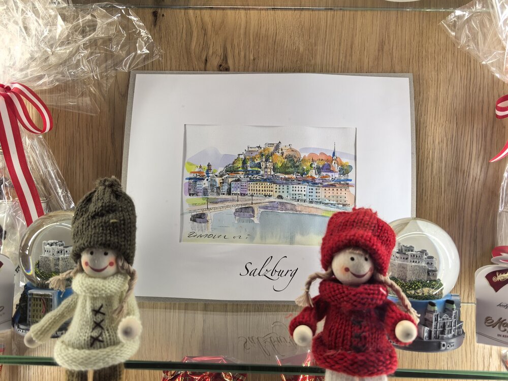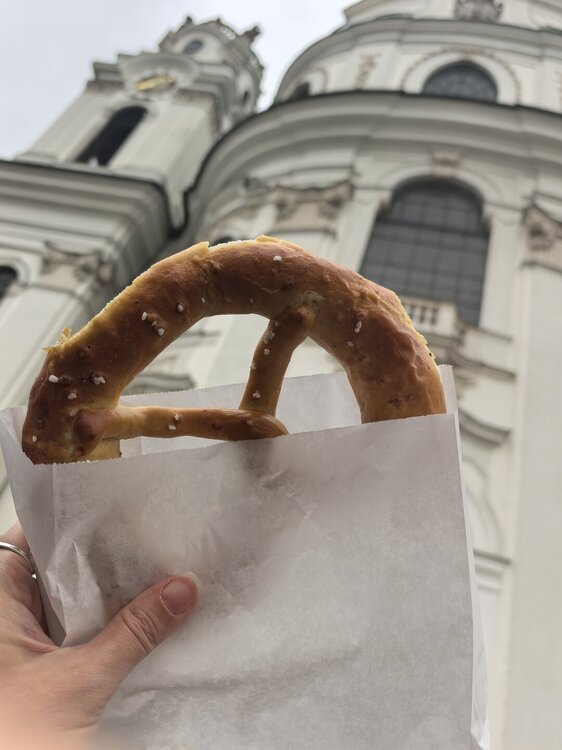 Мы уходим в историческую застройку Зальцбурга, она же торговая. Это мы любим)) А какие витрины манящие! Да ещё хитрые зальцбурчане сделали свои торговые ряды дожде-непроникаемыми. Мальчики могут немного пролистнуть, девочки, смотрим витрины. Мне очень понравилось!) Образ для городского мужчины-охотника)) Ну и всякая всячина. Тут можно и мужчинам посмотреть. Особенно на такие бутылконосители. И руки свободны, и пиво рядом. А это, судя по подтяжкам, одежда для пивного фестиваля как раз)) В одном из сувенирных магазинов встретила магнитики в виде таких часов. Моцарт был бы в шоке... От коммерции тут никуда не деться, а вывески они сделали не менее завораживающими. В Зальцбурге очень узкие улочки, поэтому дома за тобой подсматривают И смотрят сверху вниз А вот и он, дом Моцарта И кафе... Да, то самое, аутентичное, в котором придумали те самые круглые конфеты с изображением Моцарта. Они в серебряно-синей упаковке. Даже если вы купите две конфетки, вам их красиво упакуют. Одна конфетка стоит 2 евро, их можно купить поштучно. К слову упаковка подобных конфет с моцартом в Лидл стоила мне 2,59 евро. НО... Оригинальные конфеты с несколькими пралине, я бы не сказала что там чувствуется марципан, а конфеты из Лидл чистый марципан. Оригинальные конфеты делаются вручную, насаживаются на деревянную палочку и окунаются в шоколад с 60% содержанием какао. Потом это техническое отверстие заполняется шоколадом. Такие конфеты с пупочком получаются. В этом кафе мы решили немного отдохнуть и погреться, это было очень правильное решение. Мой совет, идите сразу на второй этаж, там почти никого нет, а на первое этаже очень шумно. К вам и там подойдут и спросят что вы хотите заказать. Сфотографировала меню для участников форума. Я выбирала десерт по красоте, которую оценила на первом этаже на витрине. Десерты от 5 евро. По поводу этого могу сказать, что коржики весьма твердые, что создает трудности при еде. Но вкусно. В общем кафе нам очень понравилось, уютно и вкусно посидели, обсудили увиденное. Вокруг кафедрального собора была ярмарка, было шумно и весело и, конечно, было много людей. Что изменилось в отрицательную сторону, так то что вход в Собор стал платный. Мы гуляли там абсолютно бесплатно до пандемии, там крестили Моцарта, да и вообще красивый храм, конечно. VID_20250924_100021.mp4 Группа уехала на фуникулере к замку, в небеса и туман, мы же остались здесь. Не знаю, почему-то никак не доберусь до этого замка. Ну погода же... ну не то. В Татрах так шли на верх горы, чтобы посмотреть на Морске око с высоты, а на половине пути обернулись, а там молочная пелена, никаких тебе очей морских))) В общем опять как-то не сложилось, надо возвращаться досматривать)) Какие-то знакомые буквы я там увидела)) VID_20250924_100749.mp4 Конечно, я попробовала этот брецель. Настоящий брецель. Печатный пресс?.. Станком не назовешь)) Позже увидим в Словении такое развлечение для туристов. На площади играли очень веселые музыканты. Не знаю насчет их веселой луши, но допинг у них точно был))) в перерывах они этого и не скрывали. Но, как обычно, только я достаю камеру снимать, так все смолкают.)) VID_20250924_120208.mp4 0% процентов осуждения, 100% понимания. В такой холод в такой одежде сидеть на одном месте сложновато. Немного погуляли подземными ходами Зальцбурга, находящимися в горе. Судя по запаху тут где-то расположена скрытая парковка. И рядом