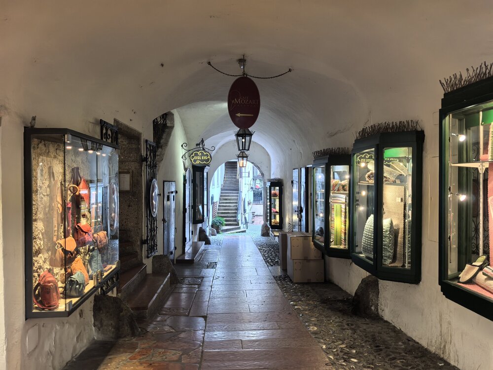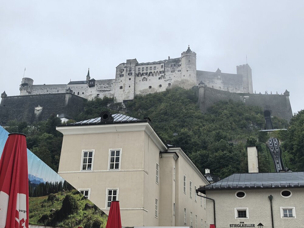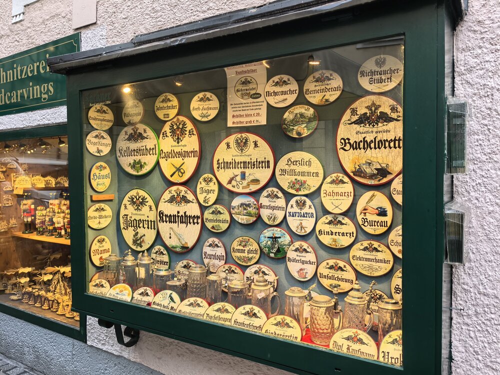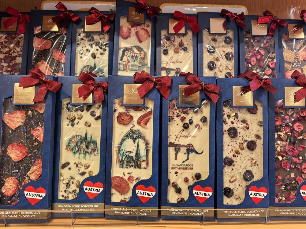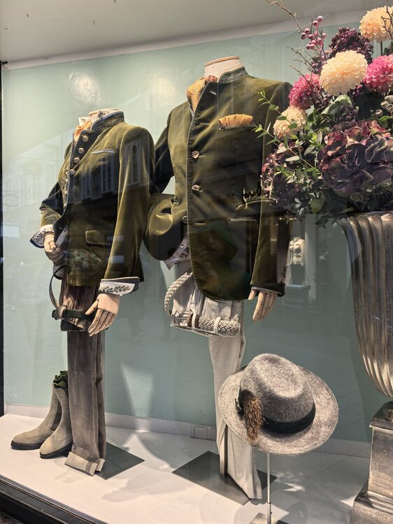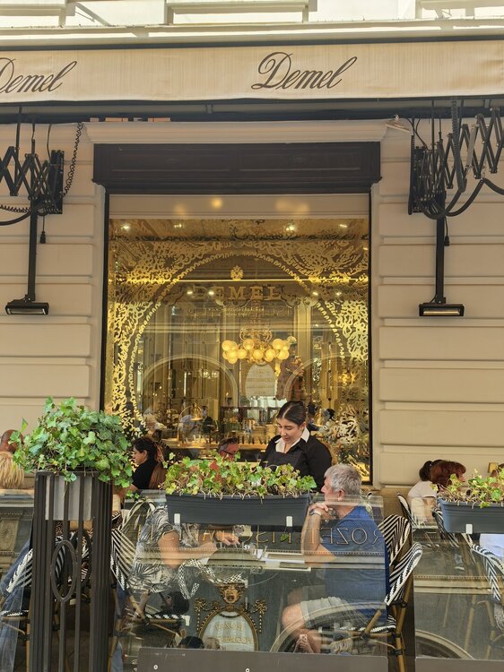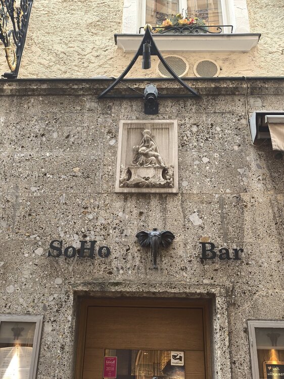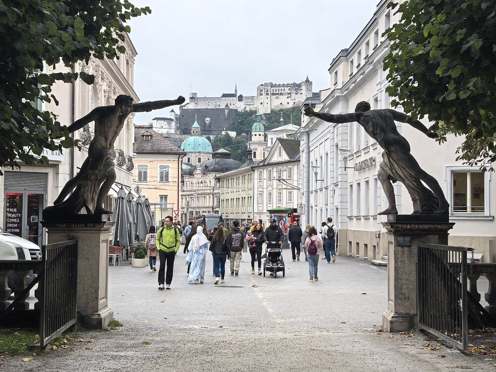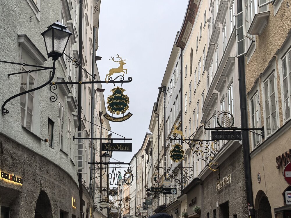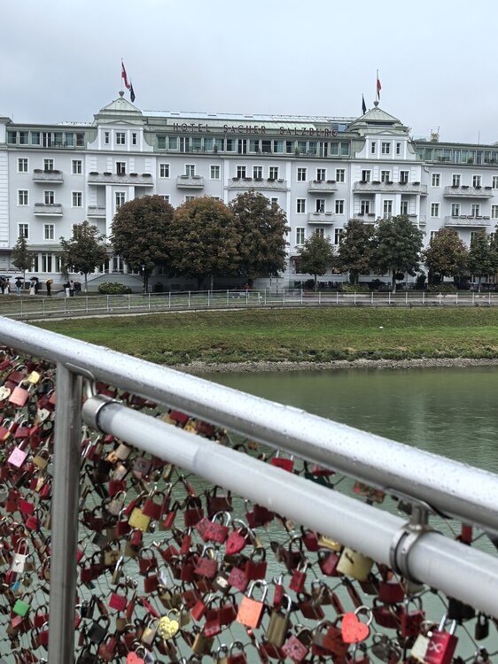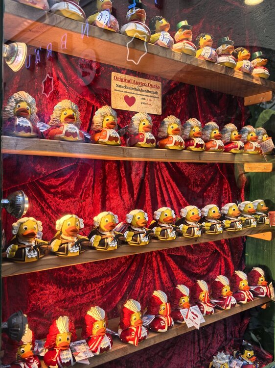 Мы уходим в историческую застройку Зальцбурга, она же торговая. Это мы любим)) А какие витрины манящие! Да ещё хитрые зальцбурчане сделали свои торговые ряды дожде-непроникаемыми. Мальчики могут немного пролистнуть, девочки, смотрим витрины. Мне очень понравилось!) Образ для городского мужчины-охотника)) Ну и всякая всячина. Тут можно и мужчинам посмотреть. Особенно на такие бутылконосители. И руки свободны, и пиво рядом. А это, судя по подтяжкам, одежда для пивного фестиваля как раз)) В одном из сувенирных магазинов встретила магнитики в виде таких часов. Моцарт был бы в шоке... От коммерции тут никуда не деться, а вывески они сделали не менее завораживающими. В Зальцбурге очень узкие улочки, поэтому дома за тобой подсматривают И смотрят сверху вниз А вот и он, дом Моцарта И кафе... Да, то самое, аутентичное, в котором придумали те самые круглые конфеты с изображением Моцарта. Они в серебряно-синей упаковке. Даже если вы купите две конфетки, вам их красиво упакуют. Одна конфетка стоит 2 евро, их можно купить поштучно. К слову упаковка подобных конфет с моцартом в Лидл стоила мне 2,59 евро. НО... Оригинальные конфеты с несколькими пралине, я бы не сказала что там чувствуется марципан, а конфеты из Лидл чистый марципан. Оригинальные конфеты делаются вручную, насаживаются на деревянную палочку и окунаются в шоколад с 60% содержанием какао. Потом это техническое отверстие заполняется шоколадом. Такие конфеты с пупочком получаются. В этом кафе мы решили немного отдохнуть и погреться, это было очень правильное решение. Мой совет, идите сразу на второй этаж, там почти никого нет, а на первое этаже очень шумно. К вам и там подойдут и спросят что вы хотите заказать. Сфотографировала меню для участников форума. Я выбирала десерт по красоте, которую оценила на первом этаже на витрине. Десерты от 5 евро. По поводу этого могу сказать, что коржики весьма твердые, что создает трудности при еде. Но вкусно. В общем кафе нам очень понравилось, уютно и вкусно посидели, обсудили увиденное. Вокруг кафедрального собора была ярмарка, было шумно и весело и, конечно, было много людей. Что изменилось в отрицательную сторону, так то что вход в Собор стал платный. Мы гуляли там абсолютно бесплатно до пандемии, там крестили Моцарта, да и вообще красивый храм, конечно. VID_20250924_100021.mp4 Группа уехала на фуникулере к замку, в небеса и туман, мы же остались здесь. Не знаю, почему-то никак не доберусь до этого замка. Ну погода же... ну не то. В Татрах так шли на верх горы, чтобы посмотреть на Морске око с высоты, а на половине пути обернулись, а там молочная пелена, никаких тебе очей морских))) В общем опять как-то не сложилось, надо возвращаться досматривать)) Какие-то знакомые буквы я там увидела)) VID_20250924_100749.mp4 Конечно, я попробовала этот брецель. Настоящий брецель. Печатный пресс?.. Станком не назовешь)) Позже увидим в Словении такое развлечение для туристов. На площади играли очень веселые музыканты. Не знаю насчет их веселой луши, но допинг у них точно был))) в перерывах они этого и не скрывали. Но, как обычно, только я достаю камеру снимать, так все смолкают.)) VID_20250924_120208.mp4 0% процентов осуждения, 100% понимания. В такой холод в такой одежде сидеть на одном месте сложновато. Немного погуляли подземными ходами Зальцбурга, находящимися в горе. Судя по запаху тут где-то расположена скрытая парковка. И рядом