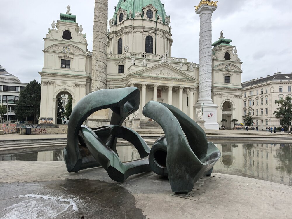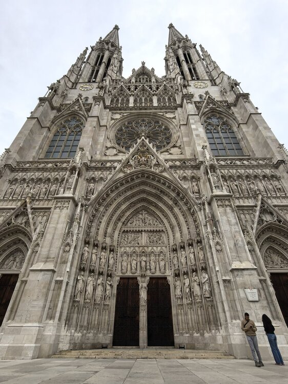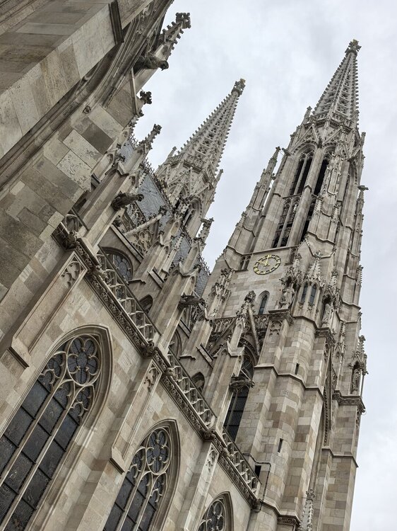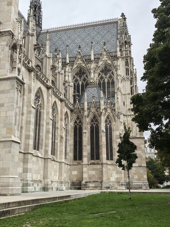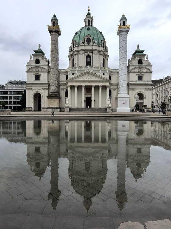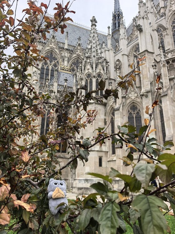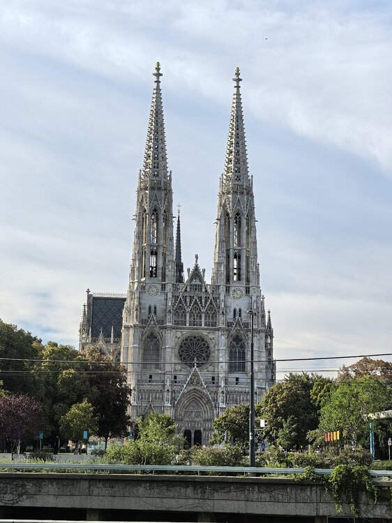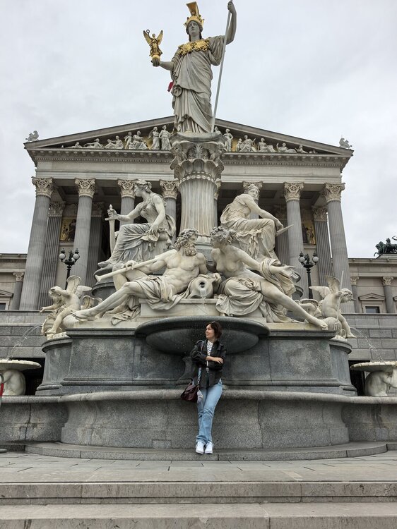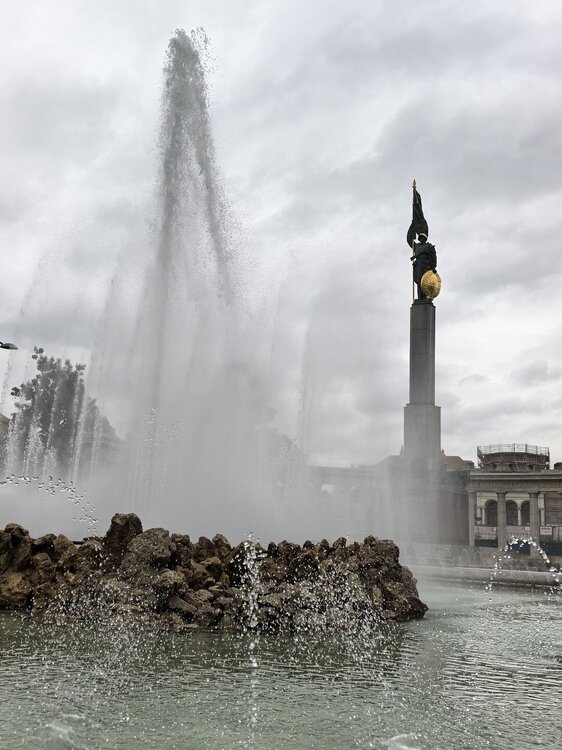 Со следующего дня погода повернула на дождь и холод :) но мы были к этому готовы. От сарафана до пуховика. Вся Вена в нашем распоряжении почти до 16 часов. Группа поехала на экскурсию в Бельведер чуть позже, а пока утром мы высаживаемся на площади Марии Терезы и разбредаемся по своим интересам. НЕ смогла пройти мимо статуи Афины, всё же весенняя Греция ещё ярка в воспоминаниях. И всё также по рингу идем к церкви Обета Как хорошо прятаться от дождя в галереях А вот и она - церковь Обета. Построена за 23 года в честь спасения молодого императора Франца Иосифа при покушении на него в 1853 году. Эта церковь настоящее волеизъявление людей, т.к. деньги на строительство собирались братом Франца Иосифа Максимилианом. Даже не так, не собирались, а люди сами жертвовали деньги на строительство церкви. Храм возведен по проекту молодого архитектора, который обошёл на конкурсе 74 соперника, в неоготическом стиле. По впечатлениям многих людей храм словно парит над Веной из-за своей ажурности. Упс... Жимеш очень хорошо вписался в пейзаж, к тому же ему не холодно, судя по довольной моське лица А внутри царят красота, тишина и величественность Кстати, здесь были брошюрки на русском языке на разные религиозные темы. Налюбовавшись, идем в другую часть города Обычная такая Вена, менее туристическая и совсем не барочная А тут на фото почти любой крупный город РФ)) ну ладно, у нас покамерней будет. Проходим мимо Карлскирхе, построена в 18 веке в честь освобождения от чумы. Действительно очень величественное сооружение. Но с платным входом и требующее косметического ремонта. Выходим к памятнику солдатам Красной Армии, тут всё также взмывает вверх фонтан и смотрится также впечатляюще