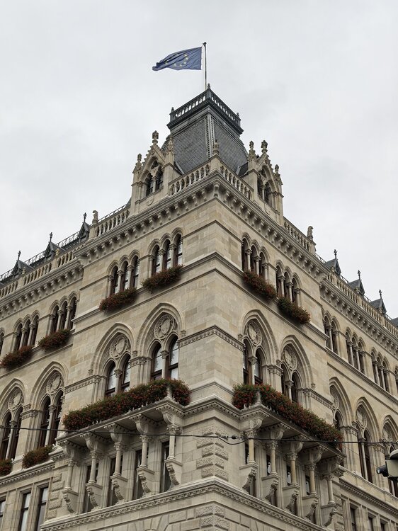 Забежав в отель, снова выходим на прогулку. Кстати, это ресторан в отеле, где по утрам у нас завтраки. А рядом с нашим отелем в парке стоит вот такой необычный ресторанчик. Но, кажется, он больше не работает. Поднимаемся на замковую гору с другой стороны, идём через жилой район исторической части Буды. Здесь лестницы и зелень, зелень и лестницы. Очень симпатично! Выходим к разрушенной церкви Святой Марии Магдалины, стоящей на историческим месте готической часовни, возникшей в 13 веке в честь освобождения от татаро-монгольского ига. Потом пришли турки, и уже выстроенная на этом месте церковь на несколько десятилетий осталась чуть ли не единственно-действующим христианским храмом в округе. Но в мечеть её всё же переделали. Турки ушли и снова храм перестроили. Потом началась Вторая мировая, и это то что осталось от храма. Его даже хотели восстановить, но почему-то работы прекратились. Сейчас башня используется как смотровая площадка (примерно 182 ступени пешком, всё как мы любим в башнях :) шутка) и вроде как есть несколько экспозиций внутри. Мы попали сюда на закате, не каждый турист сюда доходит, почти никого не было, дневной шум уже стих, и эти руины показались очень величественными. Как одинокий монах башня, ставшая свидетелем многих судеб и катастроф, вынуждена нести свой пост как напоминание о прежних временах. Оставили окно костела, чтобы показать объем VID_20250921_190207.mp4 Эта часть Буды остаётся за пределами экскурсий, но нам она понравилась чуть ли не больше. Она не помпезная, она тихая и средневековая. Даже загадочная в свете уличных фонарей. Очень похоже на монахиню И, если днём это здание обращало внимание прежде всего своей крышей, то вечером выходит на первый взгляд готичность строения. Даже некая мрачность и серьезность. Это здание национального архива. А вот как сюда попадают местные. Эти ворота старые, но многократно-перестроенные. Статуя ангела установлена в честь 250-летия освобождения Будапешта от турок. Не могли мы пройти и мимо парадной части Будапешта. Небо сегодня другое, фото тоже смотрятся как-то иначе. Вверху огоньки самолетов. С одной стороны Будапешта они взлетали, а с другой садились. И, конечно, мы завернули к будапештскому Треви, как и рассчитывали, чтобы увидеть его во всей красе без людей. Кстати, наш гид сказала, что буквально перед нашим приездом все фонтаны почистили от брошенных туда монеток. Но.... Фонтаны снова ими уже наполнились по всей видимости))