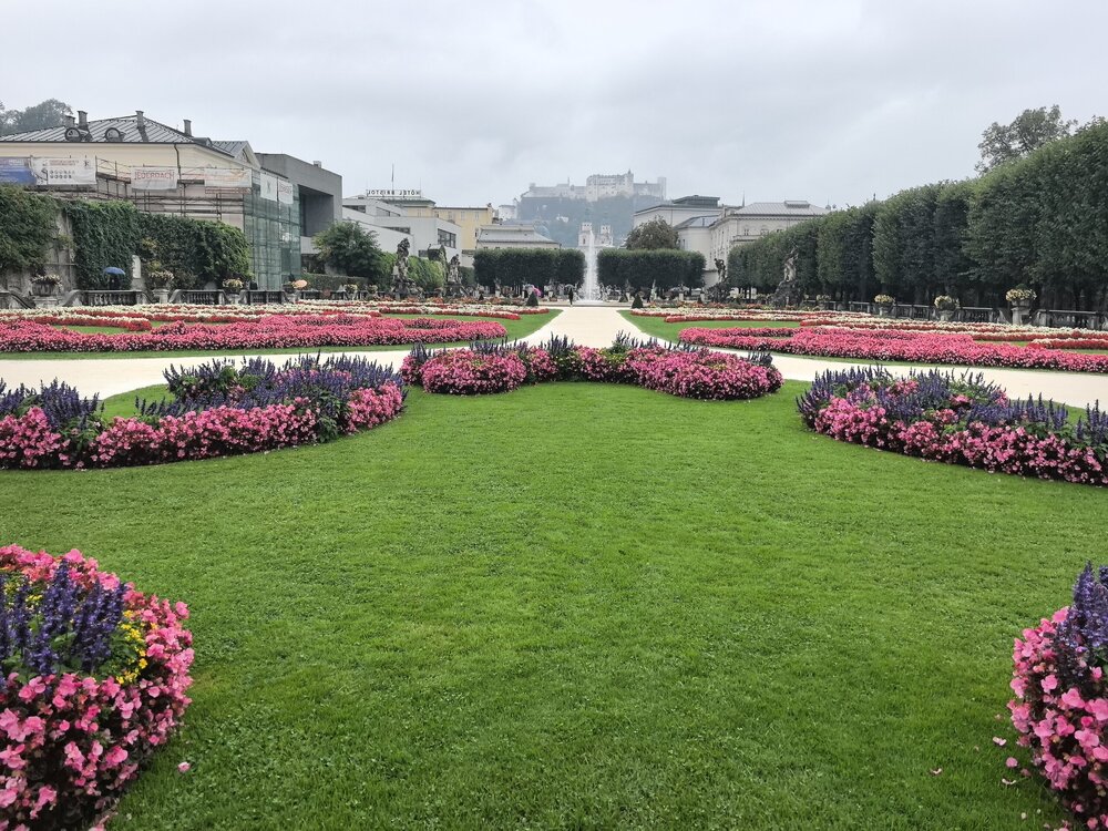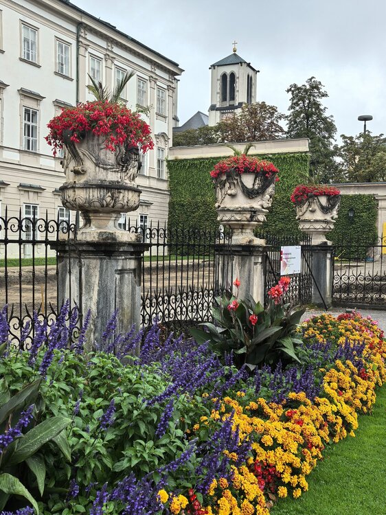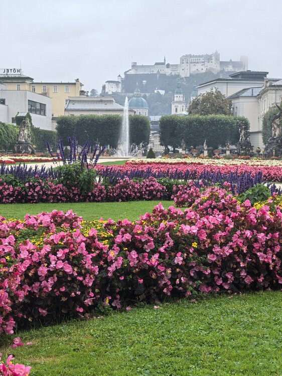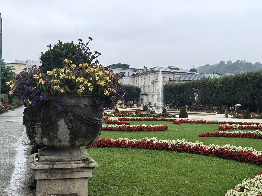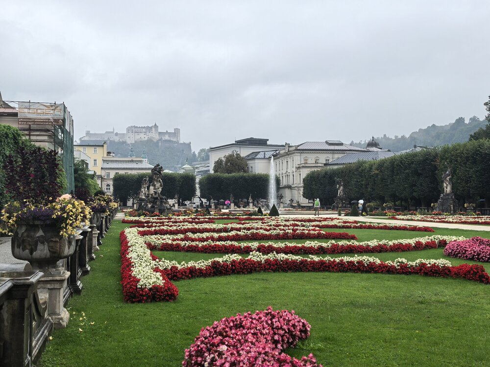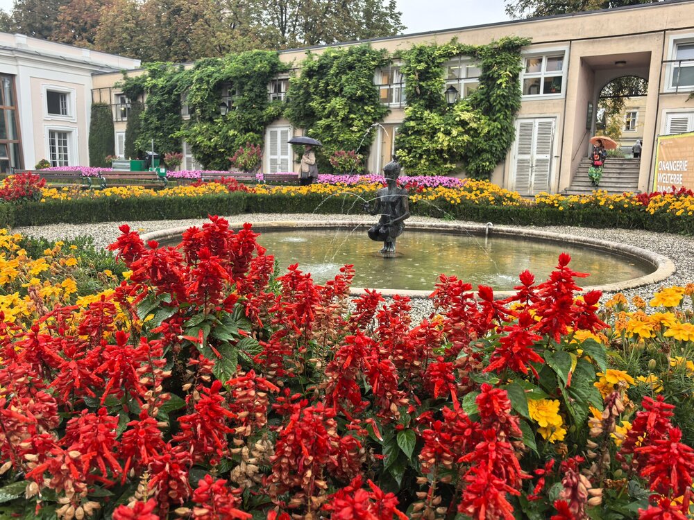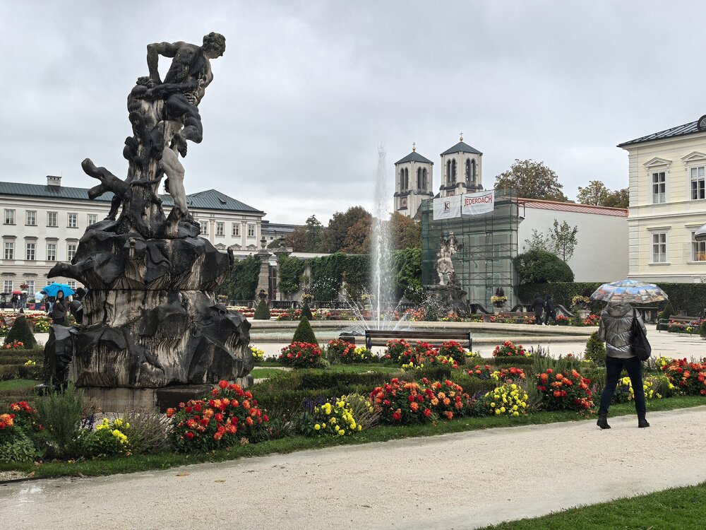 На следующий день уже в 8:58 я делала эту фотографию. Я до сих помню слова нашего гида Андрея, пришедшего на экскурсию в традиционной одежде: "А сейчас, дамы, приготовьтесь, потому что здесь многие женщины на входе падают в обморок от красоты!". Конечно, речь идёт про парк Мирабель. Здесь даже в дождь всё также красиво. Зальцах всё также молчаливо несет свои соленые воды Не уследила за Жимешом, а он уже очаровывает даму! Кажется, она выглядит довольной его обществом.