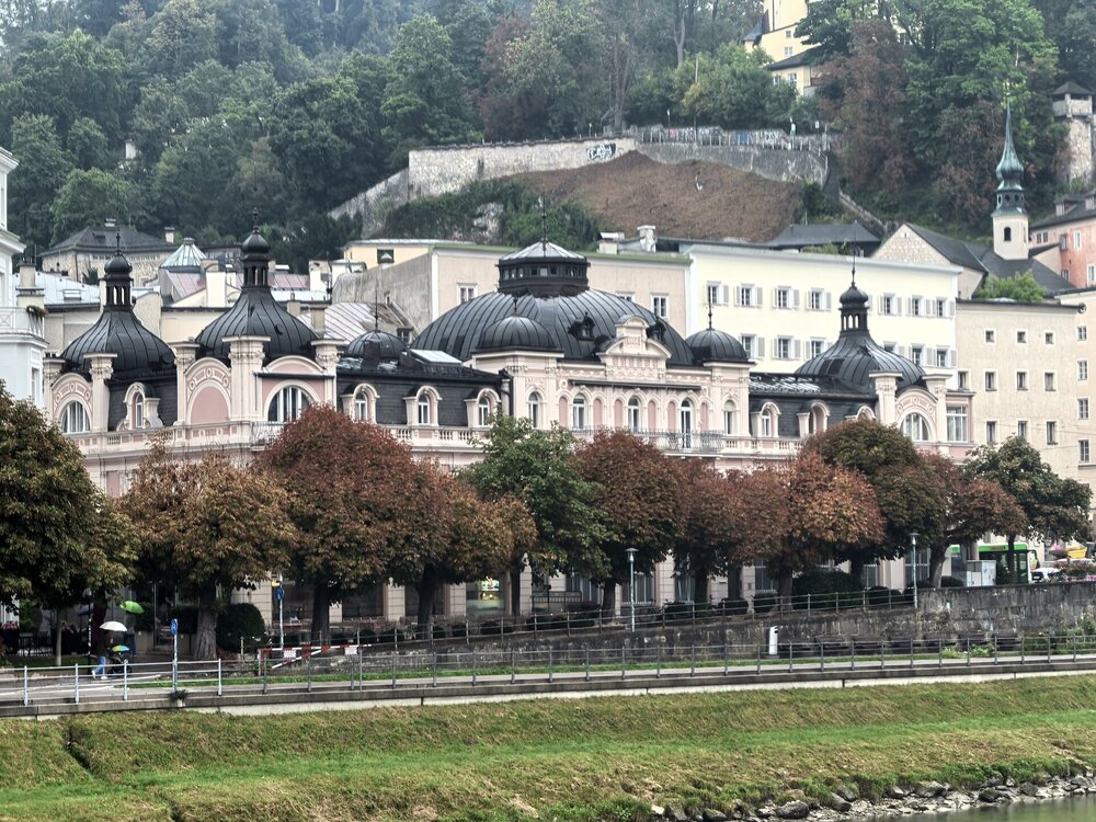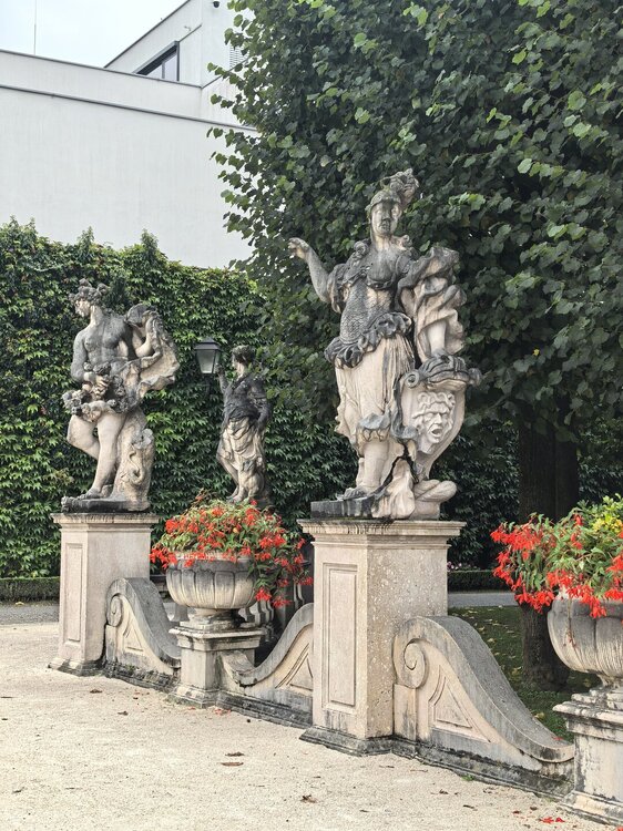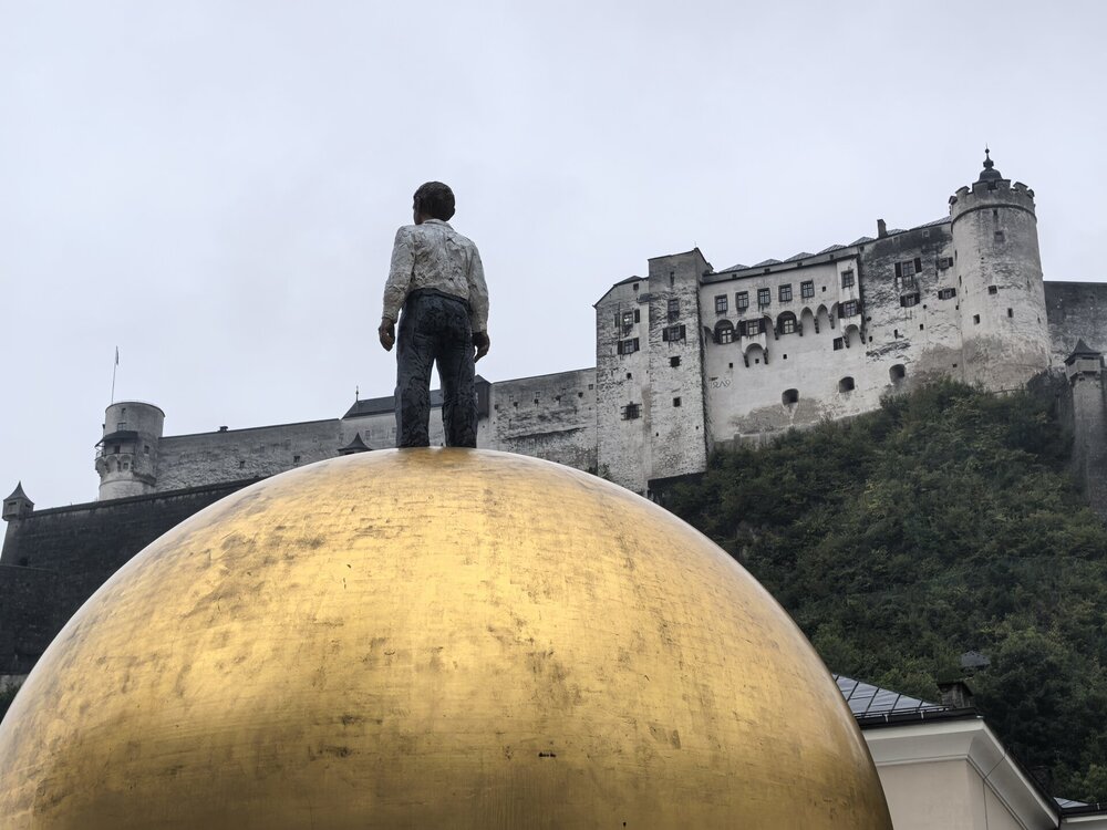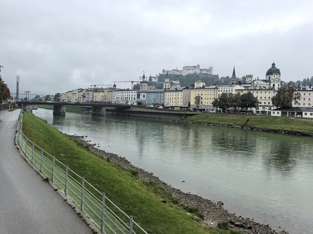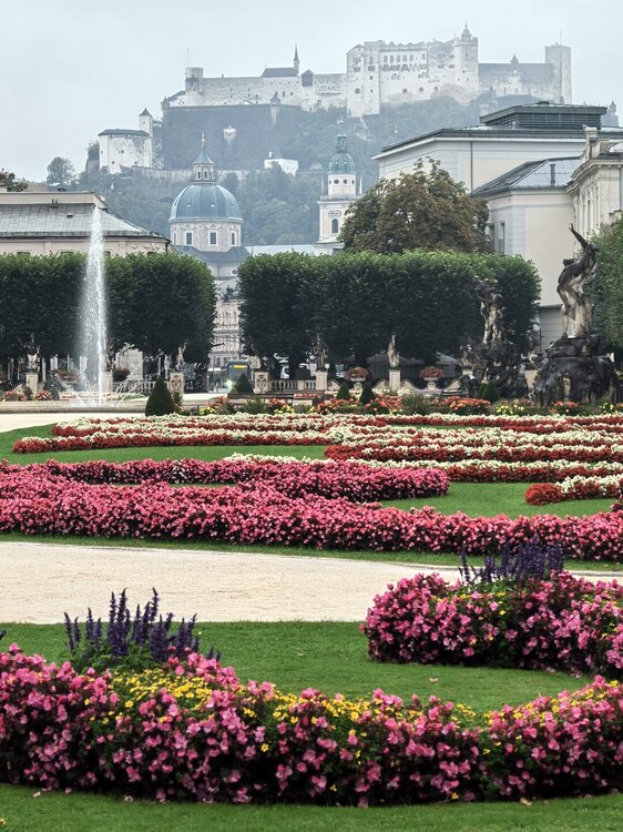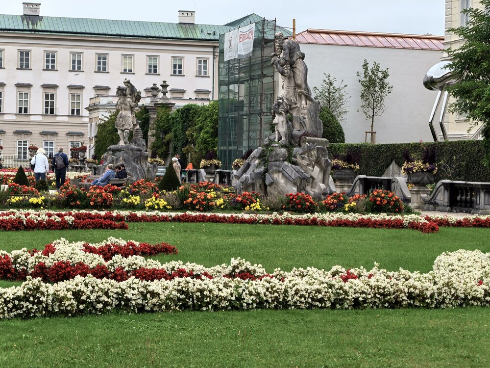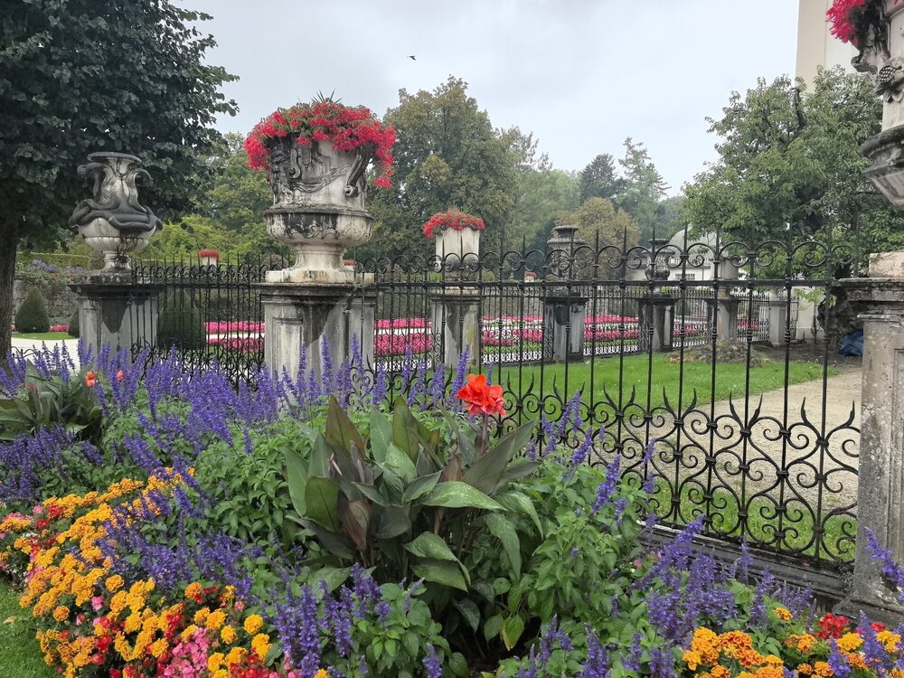 На следующий день уже в 8:58 я делала эту фотографию. Я до сих помню слова нашего гида Андрея, пришедшего на экскурсию в традиционной одежде: "А сейчас, дамы, приготовьтесь, потому что здесь многие женщины на входе падают в обморок от красоты!". Конечно, речь идёт про парк Мирабель. Здесь даже в дождь всё также красиво. Зальцах всё также молчаливо несет свои соленые воды Не уследила за Жимешом, а он уже очаровывает даму! Кажется, она выглядит довольной его обществом.
