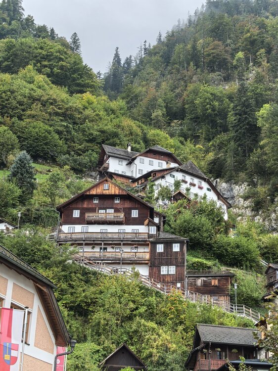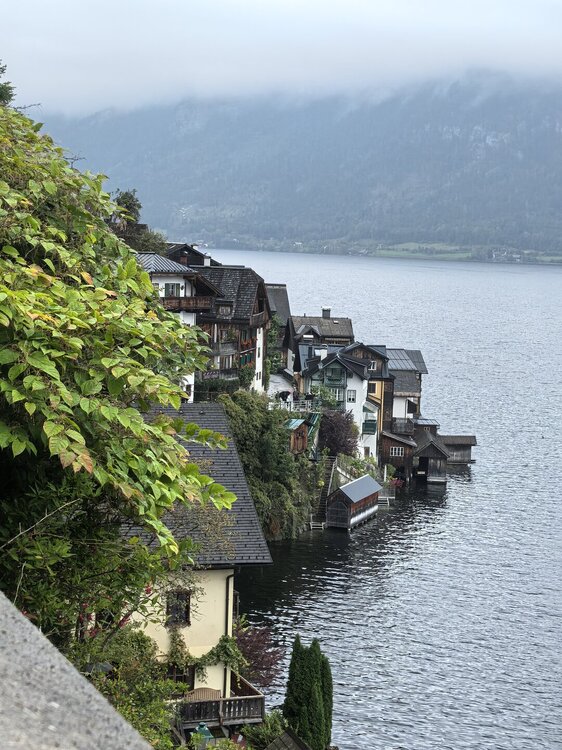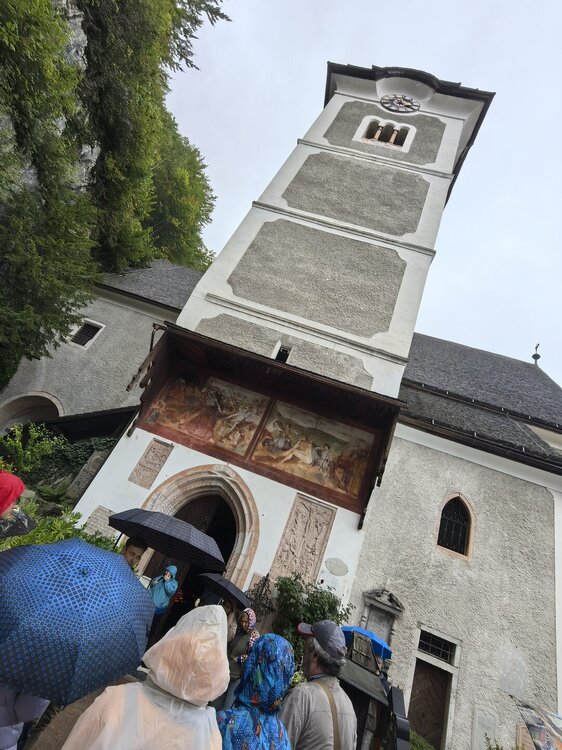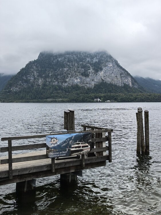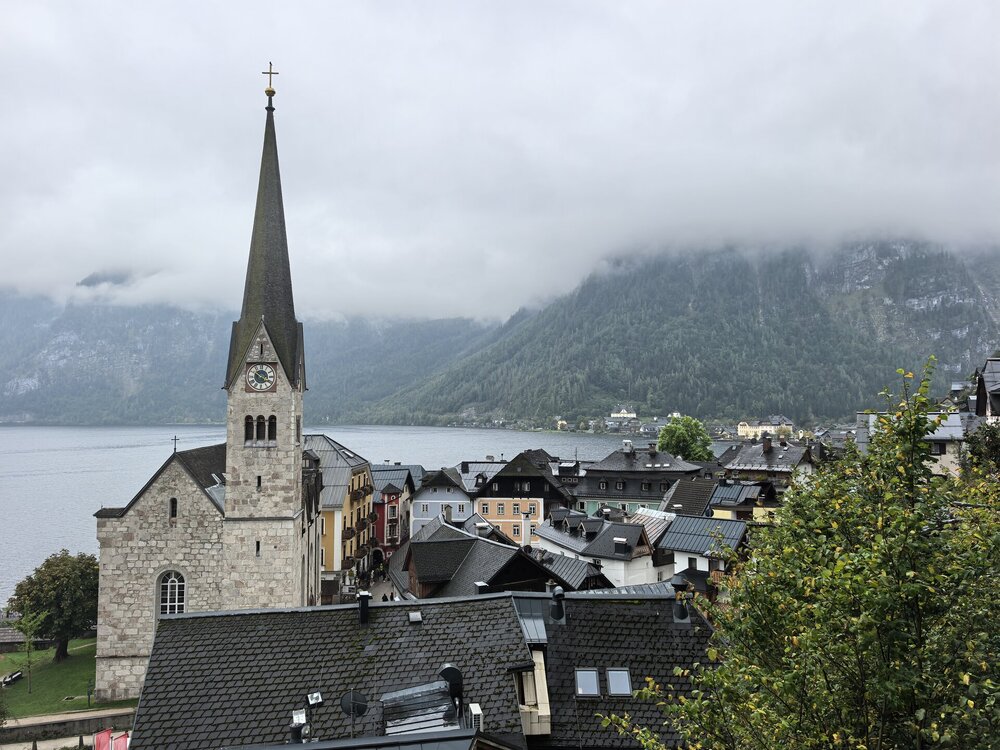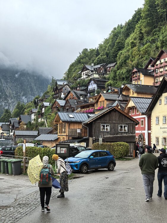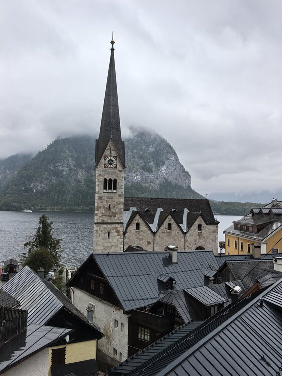 Но это не все точки на карте за сегодня. Мы едем в знаменитый Хальштатт, деревеньку на берегу озера, в которой проживает менее тысячи человека, но её исторический центр находится под охраной ЮНЕСКО. Совсем недавно вышел бессмысленный на мой взгляд фильм "Балерина", где много сцен происходит в этом городе. Посмотрела фильм только из-за видов Хальштатта, Будапешта и Сентендре. VID_20250924_140950.mp4 VID_20250924_141652.mp4 VID_20250924_142714.mp4 Город встречает нас туманом, периодически идёт дождь. VID_20250924_152955.mp4 Это поселение было "открыто" миру только в 19 веке, когда сюда прошла более-менее нормальная дорога вдоль озера. До этого момент до города шли узкие горные тропинки, ну или по озеру. А вообще люди сюда пришли не просто так, ведь здесь находятся соляные шахты возрастом более 2 тысяч лет, т.е. они разрабатывались ещё до нашей эры. Соль прекрасно хранит то что в неё попадёт, поэтому из шахт с свое время достали много интересных прекрасно-сохранившихся объектов. Я помню с посещения шахты в Величке под Краковом как нам рассказывали, что соль по ценности раньше была чуть ли ни как золото. И тот, кто добывал соль, был богат. Здесь микроскопическая и безумно дорогая платная парковка, автобусы приезжают, высаживают туристов и уезжают. А вот и тот вид. По канону, правда, фотографируют с противоположной стороны, там тоже есть смотровая площадка, но таких фотографий полно в интернете, да и оператор Балерины тоже снимал оттуда, мы не пошли, конечно, на ту дальнюю площадку, да и цели такой не было. Вот и памятник добытчикам соли. Носили соль женщины, мужчины были в шахтах. Городок расположился вдоль горы несколькими параллельными улицами, которые как ручейки кое-где пересекаются тропинками от горы. Как и любое подобное поселение, здесь очень живописно. В целом любое расположение домиков рядами друг над другом (будь то Берат, Хальштатт или поселок Рыбачий под родным Воронежем) всегда смотрится необычно и красиво, хотя это и не находка, просто по-другому из-за рельефа никак. Люди, как правило, пытаются украшать свои дома, встречаются даже маленькие палисаднички. Главный символ городка - протестантская церковь 19 века. Как и все храмы этой ветки христианства она очень проста внутри. Ещё здесь расположена церковь в романском стиле, первое упоминание которой датируется 12 веком. Вокруг располагается кладбище, а рядом костница с платным входом. Дело в том, что, конечно, здесь мало земли, и использовать её под кладбище людям показалось глупо, поэтому они нашли такой выход - хоронили сначала традиционным способом, а через 10 лет выкапывали то что осталось, отбеливали черепа, расписывали их, писали имя и годы жизни, и складывали в костницу. Так и приспособились. С появлением крематориев, такой ритуал последний раз проделывался в 90-х годах. Вход в церковь. Внутри красивые резные готические алтари. Они вырезаны в разное время. Сначала появился тот что слева, потом решили сделать тот что справа. К храмам мы шли по верхней улицы, а обратно идём по нижней улице. Рыночная площадь. В сувенирах тут продается соль. Тяжелая и дорогая, небольшая упаковочка в районе 10 евро. Вот и ещё одна моя туристическая цель закрыта - очень давно хотела посетить этот городок. Мы прощаемся в туманным Хальштаттом, но не прощаемся с регионом Зальцкаммергут. Впереди нас ждёт ещё один милый городок.