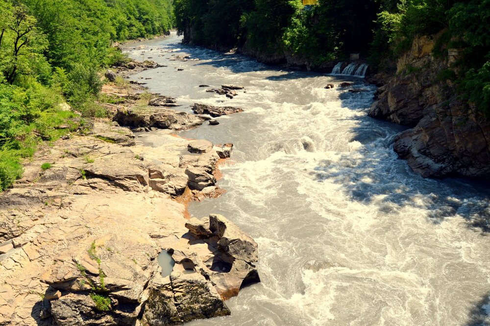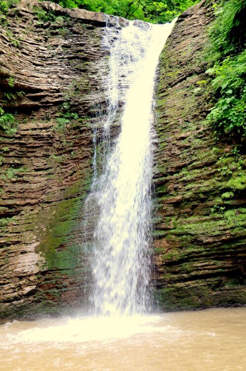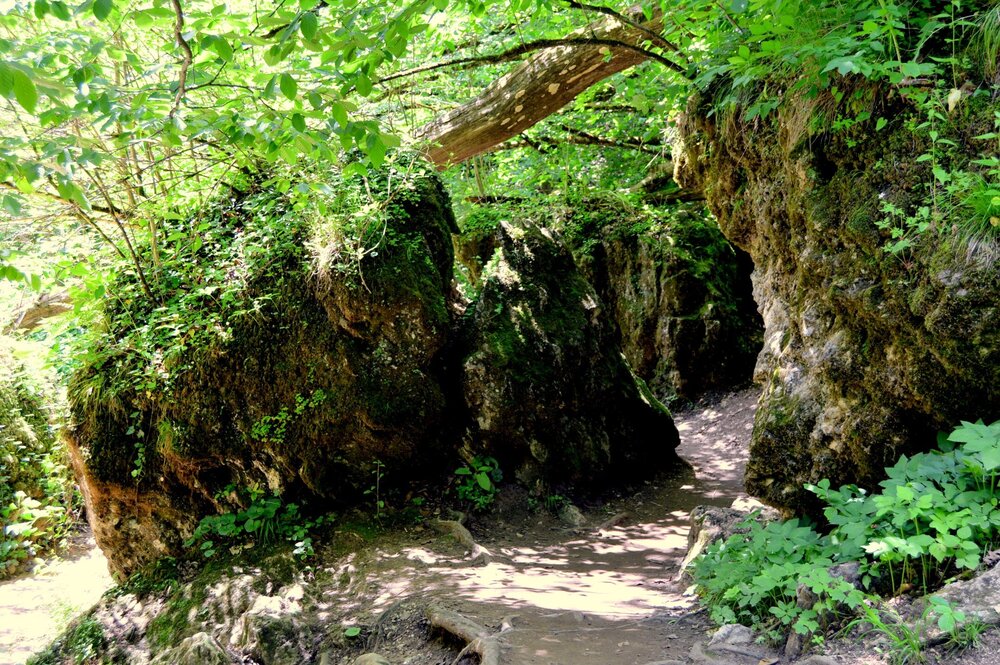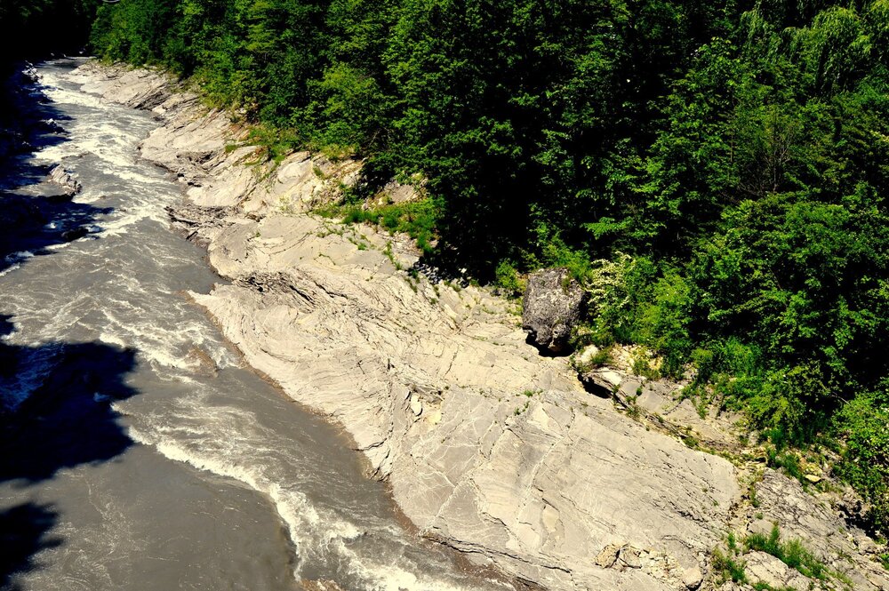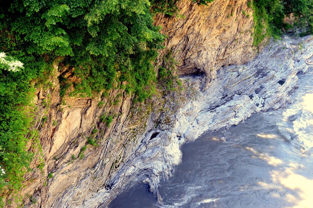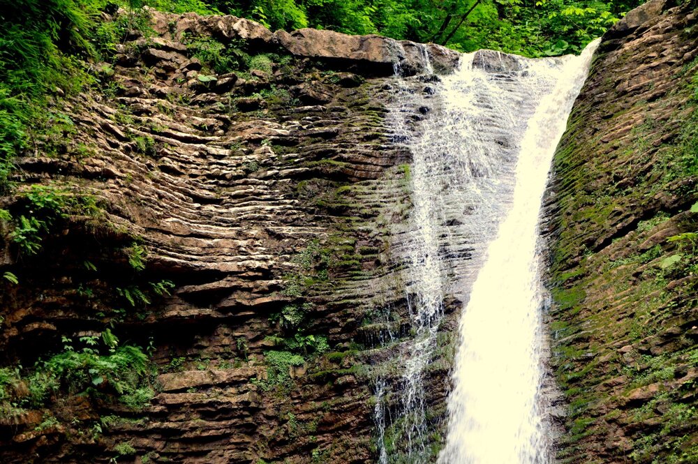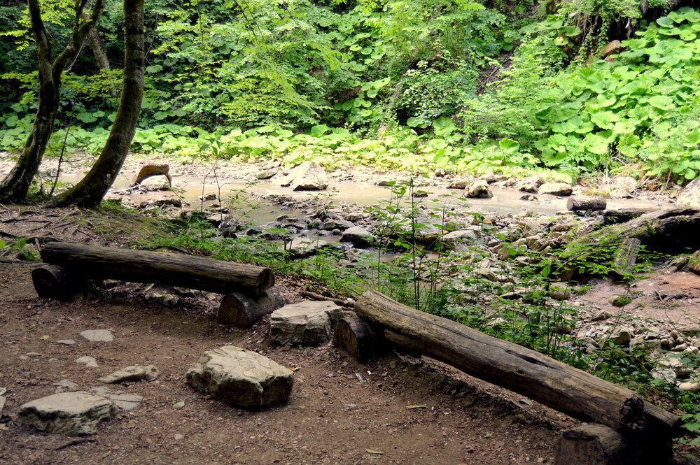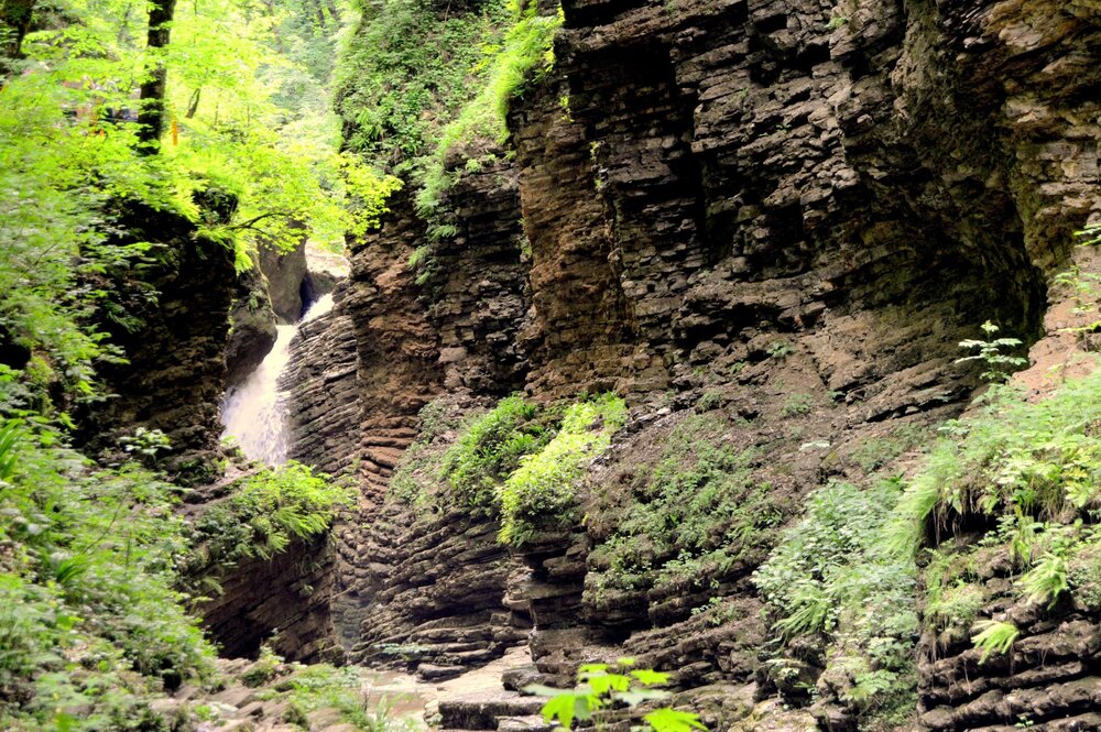 Тропа, выбитая тысячами ног, привела меня к огромной нависшей скале. Туристы когда-то назвали ее «Пронеси, Господи!» Это не случайно - напротив скалы располагался карьер и там производились взрывные работы, от сильной детонации сотрясались скалы, камни падали на тропу. Под навесом скалы увидел огромный грот; здесь зимой и летом всегда сухо и безветренно; сразу за гротом узкая тропинка, прилепившаяся к скале, вывела меня в буковый лес, наполненный свежестью и прохладой. Первый водопад Руфабго был слышен издали - обрываясь с высоты более 6-ти метров, вода падала в озеро. Водопад «Шум» оказался довольно внушительным, спускаться к нему пришлось по приличной лестнице. На этом водопаде я видел больше всего туристов (удобная поляна перед водопадом была обжита людьми несколько тысячелетий тому назад). Здесь туристы ставили палатки, отдыхали, играли в волейбол. Второй водопад не был столь велик и его я прошел едва заметив. Зато третий - остановит любого: огромная каменная глыба, выкованная природой в виде гигантского сердца, перегораживала русло реки. С правой стороны узкий поток воды обрывался в живописное глубокое ущелье. Скалы ущелья, сложенные горизонтально залегающими плитами известняка, поросли мхами и наполняли пространство загадочным эхом; этот водопад туристы зовут «Сердце Руфабго».