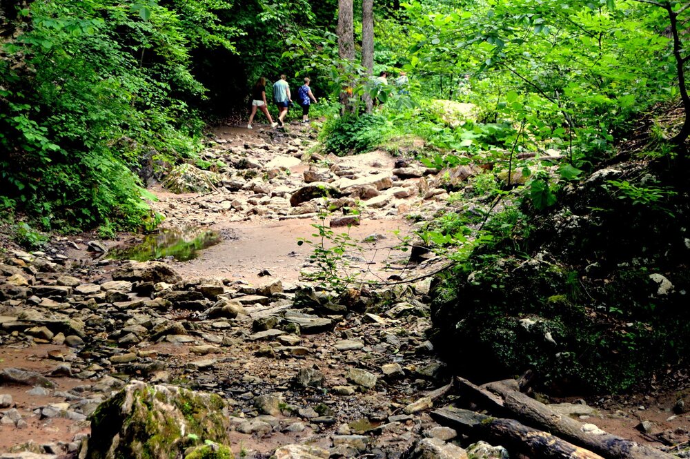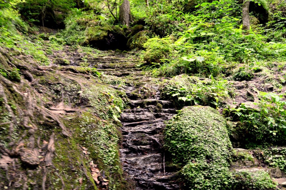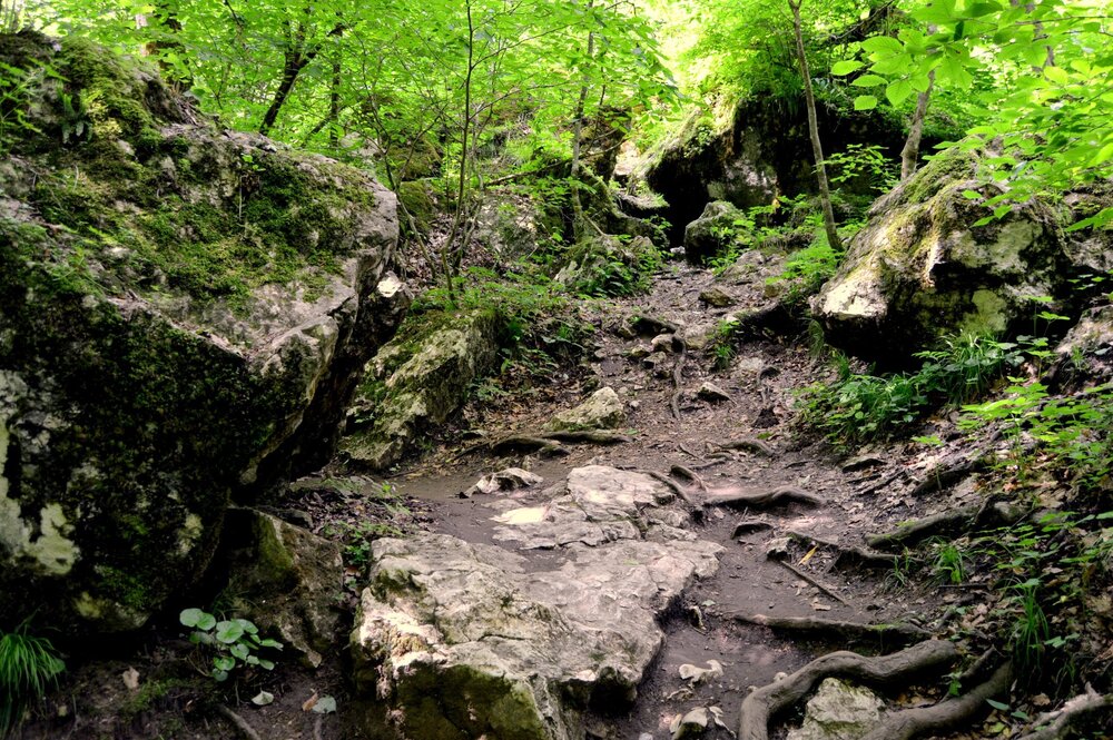 Заблудиться было не возможно, так как тропы маршрутов ярко выражены, поэтому мы ходили друг за другом по обоим маршрутам. В начале маршрутов полюбовались красивым Адыгейским родовым лесом, где высажены преимущественно дубы с табличками (кто их высаживал). Раньше на территории исторической Черкессии существовало много дубовых лесов, ведь дубы являются символом могущества и долголетия. Однако после Русско-Кавказской войны деревьев практически не осталось. Сегодня коренные семьи адыгов (черкесов) возрождают дубовые леса и рощи, высаживая их не только в Адыгейском родовом лесу, но и по всей территории республики. Все дорожки имели весьма цивилизованный вид и можно было смело вертеть головой по сторонам, осматривая окрестности, несмотря при этом под ноги (хотя под ногами тоже можно было встретить кое-что интересное, например, потрясающей красоты корневища). Тропа оборудована мостиками, лесенками, поэтому прогулка была не особо напряженной, хотя, в дождливую погоду надо крепко держаться за перила и следить за тем, куда наступаешь ногой.