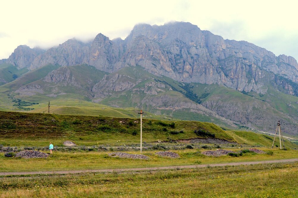 Итак, про экскурсию. В начале дня у меня состоялась хорошая двухчасовая прогулка по столице РСО-А. Затем проголодавшись я на бегу второй раз позавтракал в уличном кафе приличным супом из утки и домашней лапши, бараниной со стручковой фасолью и яйцом, местным хычином (довольно вкусным осетинским пирогом-лепёшкой с сыром и зеленью), запил горячим(!) тархуном, больше похожим на глинтвейн с имбирем. Потом сел в автобус и вместе с группой начал выдвигаться в сторону Фиагдона к Куртатинскому ущелью. Горы встретили меня облачным фронтом; погода не была слишком пакостной, но не предвещала ничего особенно хорошего, затем облачность потихоньку рассеялась, хотя воздух оставался не совсем прозрачным и остовы гор просматривались с трудом. Ехал и мечтал о том, чтобы верховья ущелья оказались в окружении восхитительных пейзажей и открывался вид на снежные вершины; с ощущением, что смогу совершить прогулку по средневековым башням и боевым укреплениям, посетить музей под открытым небом Город Мертвых (Даргавс), находящийся под охраной ЮНЕСКО. Надеялся при ясной погоде увидеть вершину Казбека.