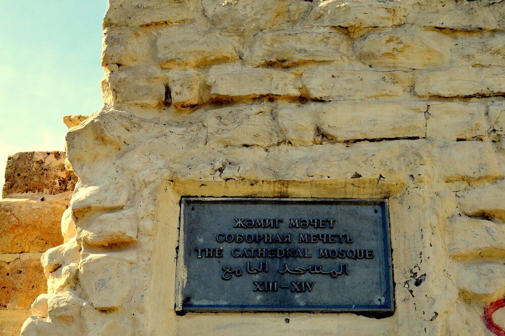 Затем через въезд с северной стороны подъехали к Малому городку, комплексу руин площадью в 7 га, по форме напоминавшему большой прямоугольник. Вход в Малый городок был свободный, но въезд на машинах запрещен, поэтому автобус мы покинули. Считается, что в прошлом это была загородная резиденция ханов. По другой версии, здесь отдыхали торговые караваны, был своего рода древний таможенный пункт. Строительство на территории велось в XIV веке, но было не закончено из-за вторжения Тамерлана. Я подошел к памятному знаку принятия ислама, открытому в 2012 году, который представлял собой восьмигранное сооружение. Купол оформлен позолотой, стены декорированы изысканным орнаментом. Через цокольный этаж по указателям прошел в музей Корана с самым большим в мире напечатанным Кораном (стоимость билета составила 160 рублей). В Музее Корана ознакомился с миниатюрными Коранами, посудой для ритуалов, традиционными головными уборами. Интерес вызвали стены декорированные выдержками из главной книги мусульман и светлые, красиво оформленные залы. В главном зале увидел самый большой в мире Коран (его занесли в книгу рекордов Гиннеса), книга имеет высоту 2-а метра, в ширину - 1,5 метра, вес - 800 килограммов. Редкая драгоценность обтянута телячьей кожей и украшена 18-ю видами полудрагоценных камней.