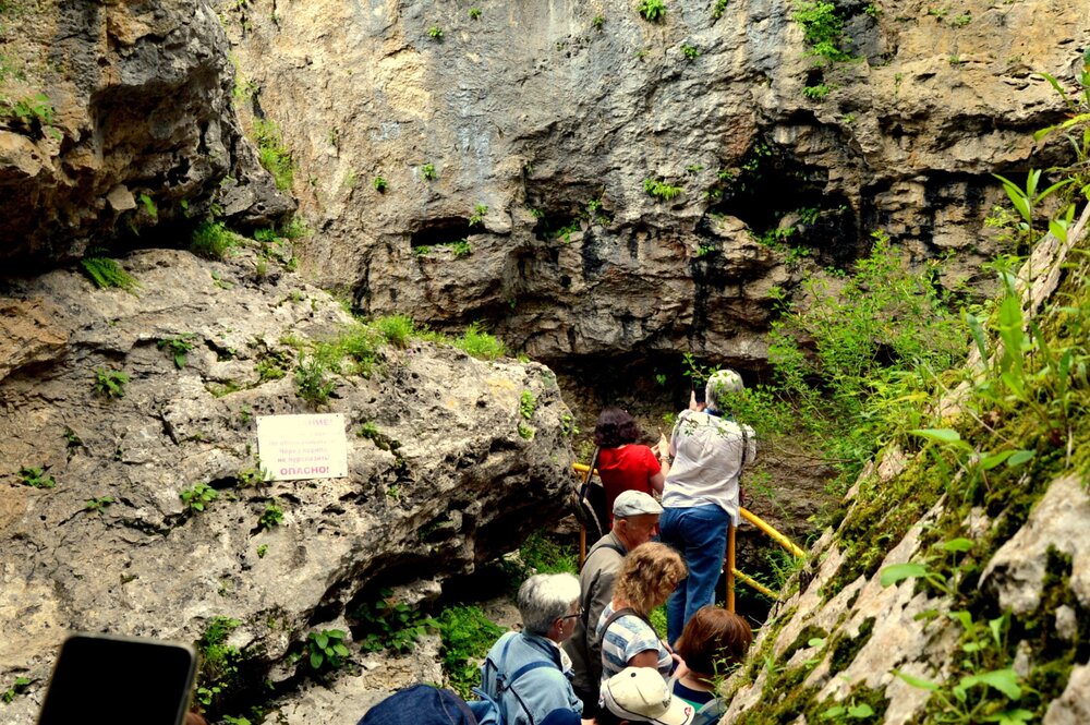 Туристы пережидали взрыв на карьере около родничка, который капельками стекает по скале хребта Азиш-Тау. Мы тоже ловили каждую каплю водицы, так как считается, что родник изливает «божью» росу, оберегающую от камнепада. Когда стоял под каменными сводами, ощущал себя словно в водной пучине - водовороте бурлящих вод реки Белой. Эхо отражаясь многократно от каменных стен, а над головой летали ласточки и сотни маленьких гнезд ютились под каменным козырьком.