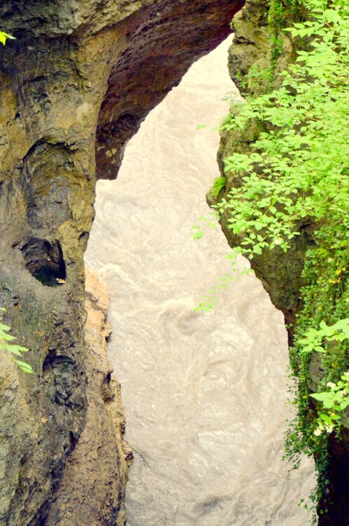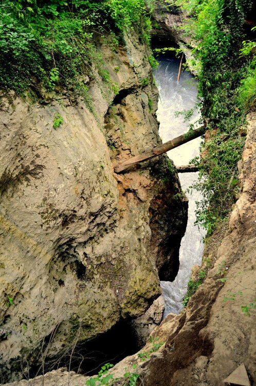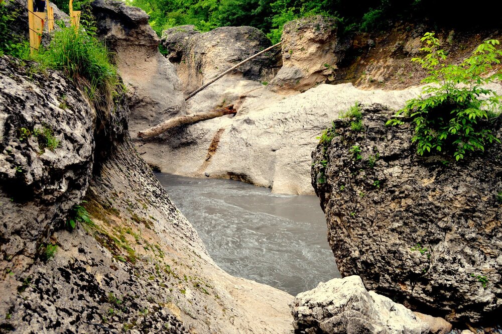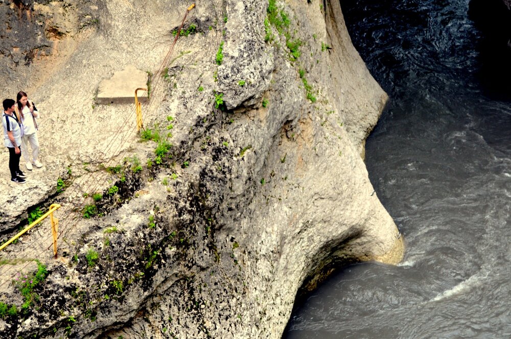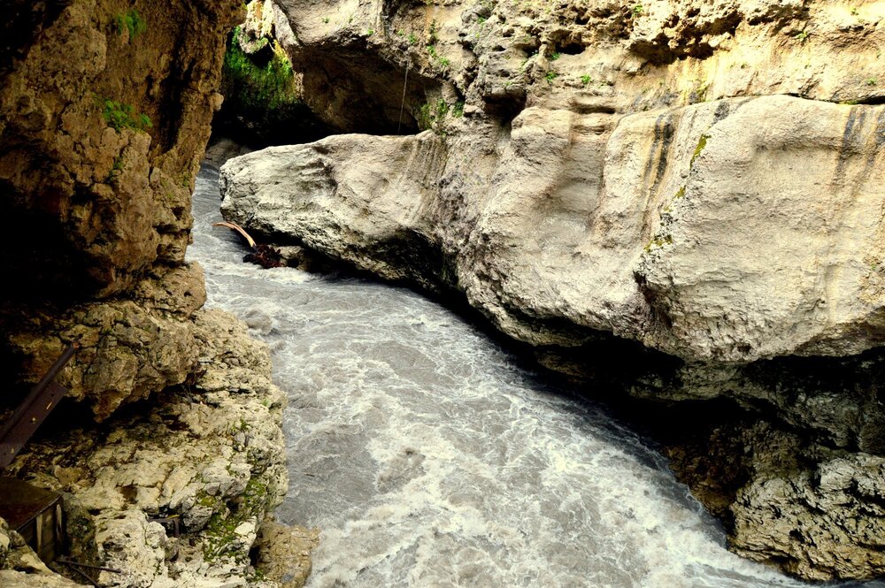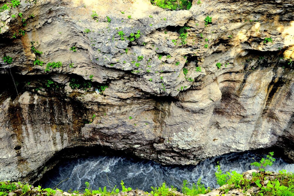 Узкая щель каньона сдавливала бурное течение реки в пенящийся поток. Несколько смотровых площадок, органично расположенных на стенах каньона, позволяли досконально осмотреть чудо-природы, но спуститься к самому урезу воды никто не решался (некоторые смельчаки это делают). Здесь в полумраке я ощутил на лице пенящиеся капли воды, холодные брызги, казалось стою на узкой каменной полочке, а мощный поток, пожалев меня, несется мимо бушуя и рыча. Чуть ниже по течению русло разделилось на два «потока»: один из них (сухой) в советское время был пересыпан строителями и теперь редко посещается туристами, а мокрое русло притягивало к себе любознательных экскурсантов своей красотой и первозданностью.