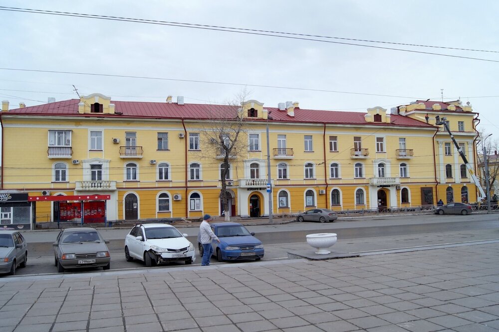 Про возникновение этого квартала в городе ходила шутка-легенда. Говорили, что здесь сбылась мечта Гитлера: немцы и японцы в завершении Второй мировой войны встретились на Урале. Тут, на строительстве квартала, они и встретились на самом деле – в качестве рабочей силы на стройках использовали военнопленных. В прошлом году здесь тоже разгорелась маленькая война между администрацией и жителями домов. Потому что жильцы хотели ремонта, но не хотели расставаться с остеклением балконов, которое часто архитектурный облик фасадов совсем не украшало. Как-то решали эти вопросы в индивидуальном порядке, но ремонт таки начался и к зиме даже почти закончился. Теперь весь квартал радует взгляд солнечно-желтым цветом фасадов. На угловом здании виден барельеф с портретом Жукова, чьё имя носит улица.