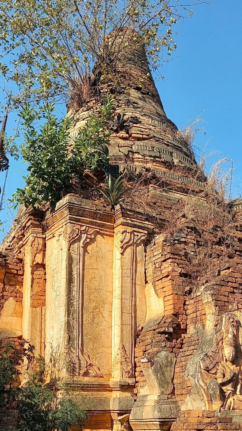 Несколько ранее скопление удивительных религиозных объектов Пагоды Ньяунг Охак я исследовал рядом с лодочной пристанью с таким же названием Ньяунг Охак (переводится как «группа банановых деревьев»). Большинство ступ там не были отреставрированы и находятся в плачевном состоянии, из некоторых попросту растет трава и даже небольшие деревья. Хотя были структуры, которые, на удивление, хорошо сохранились. На них я разглядел первоначальные формы и удивительный декор скульптур и барельефов с небесными существами; кроме того, там были мифологические животные, такие как змеи и чинте, но, преимущественно, они хранили изображения Будды.