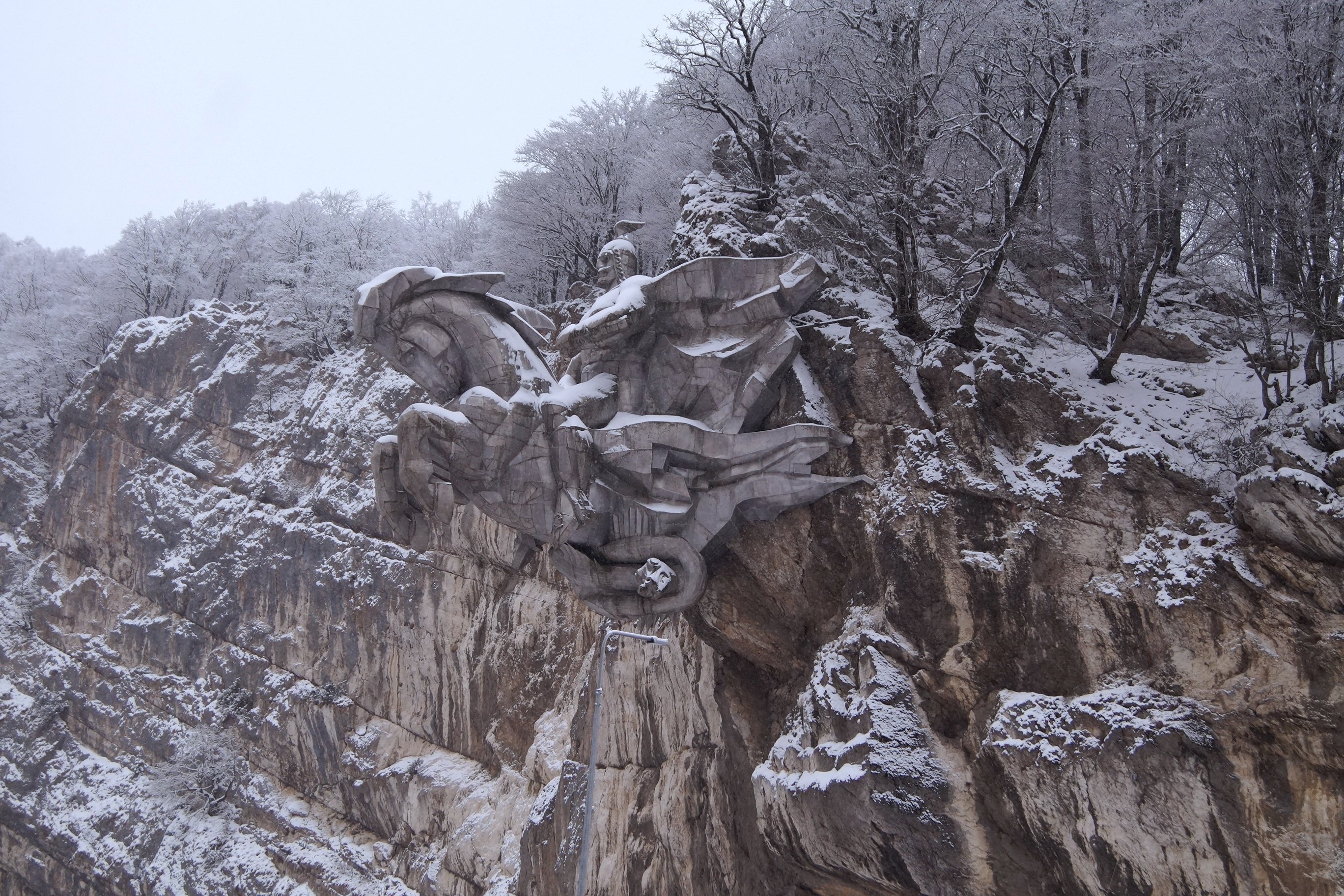 и вот, наконец, останавливаемся, чтобы посмотреть на удивительную статую Уастырджи – воина, словно выскакивающего на коне из скалы. Огромная статуя из алюминия, весящая больше 28 тонн, укреплённая на высоте 22 метра, весьма впечатляет. Говорят, для её установки использовали два вертолёта.