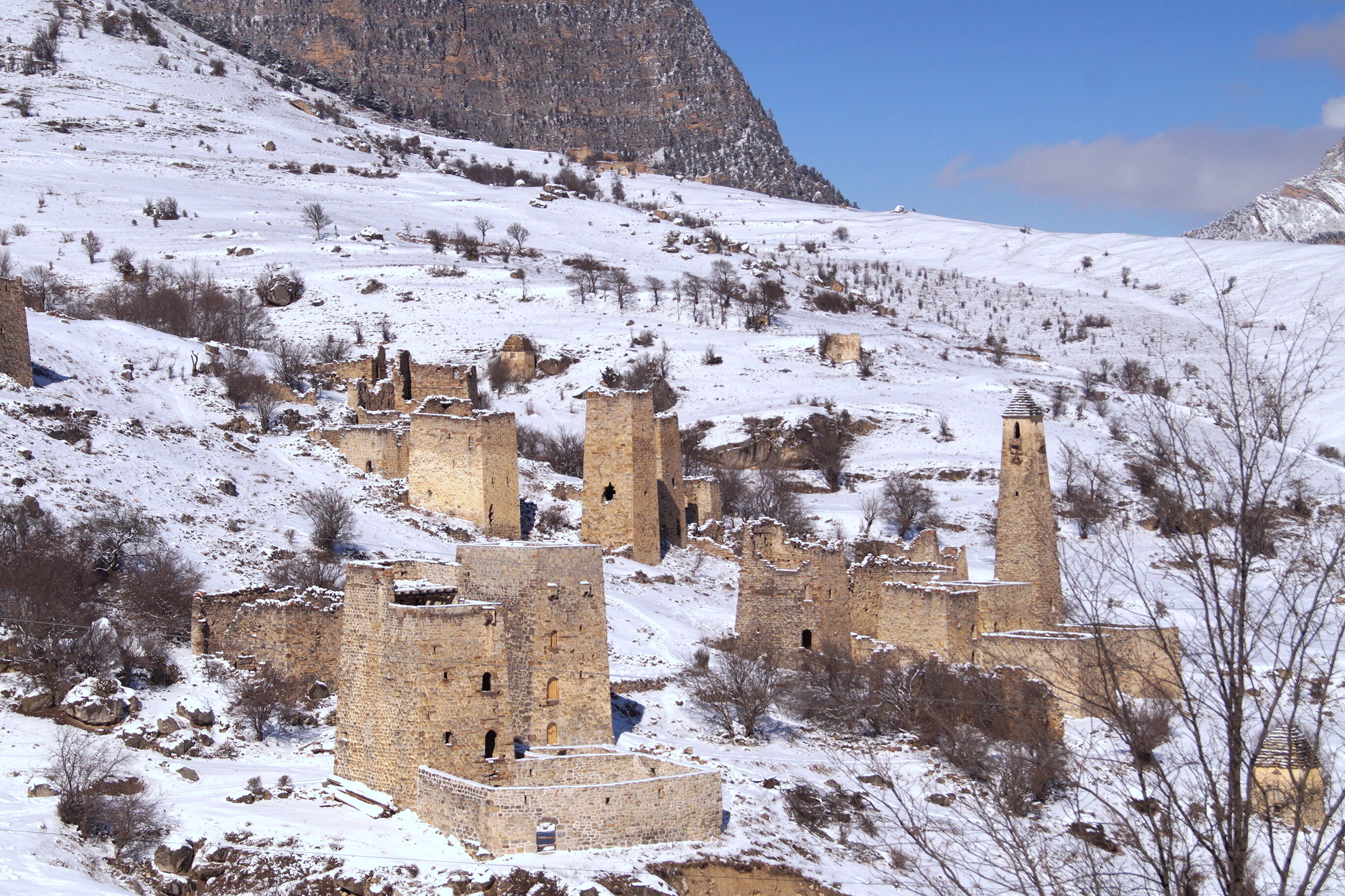 После случившихся за несколько дней до того снегопадов подступы к башенному комплексу надёжно защищали сугробы, дорожки среди которых для туристов никто расчищать и не собирался. Говорю ж, не любят здесь показывать свои сокровища посторонним:) В принципе снег был не так глубок, да и кое-где следы отчаянных туристов виднелись (а может, и не туристов, ибо одна семья в этом городе всё же живёт и сейчас (в современном доме, построенном неподалёку, но иногда принимает гостей, говорят, в отреставрированной древней родовой башне), старший сын в которой является инспектором заповедника Эзри и наблюдает за сохранностью расположенных на его территории башен), я бы пройти рискнула, но никому из нашей мини-группы такая идея даже в голову не стучалась, понятное дело, что меня одну бы ждать никто не стал. Потому я, страдая, пошаталась от машины к смотровой, которую оккупировала более многочисленная группа, приехавшая на туристическом автобусе, сделала несколько кадров и понадеялась в душе, что однажды я все-таки сюда вернусь.