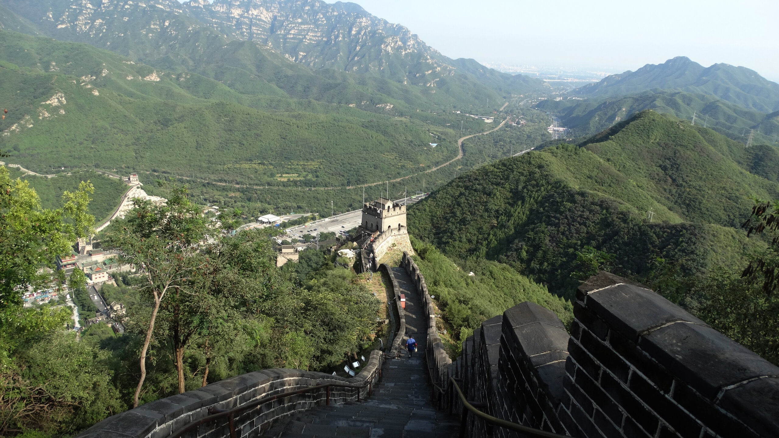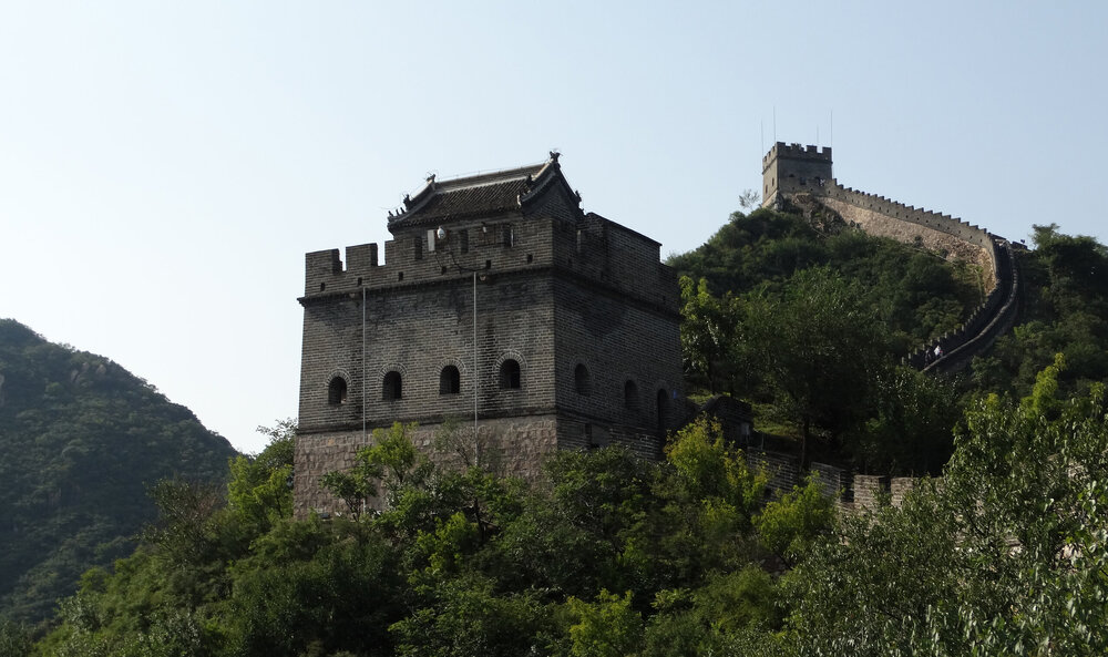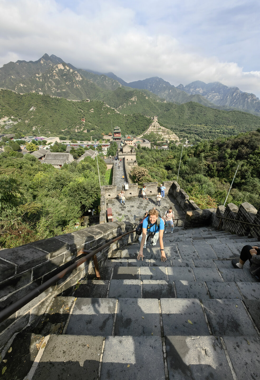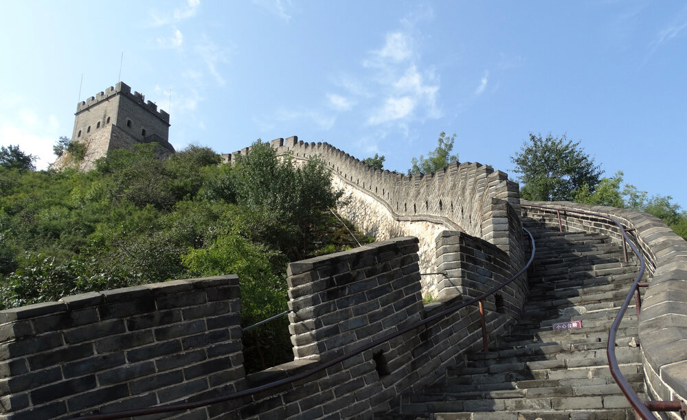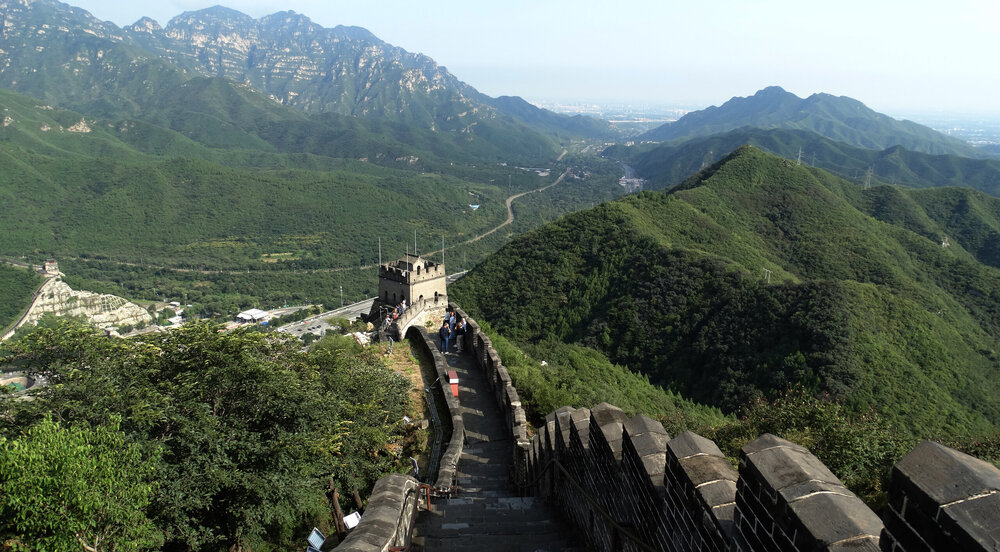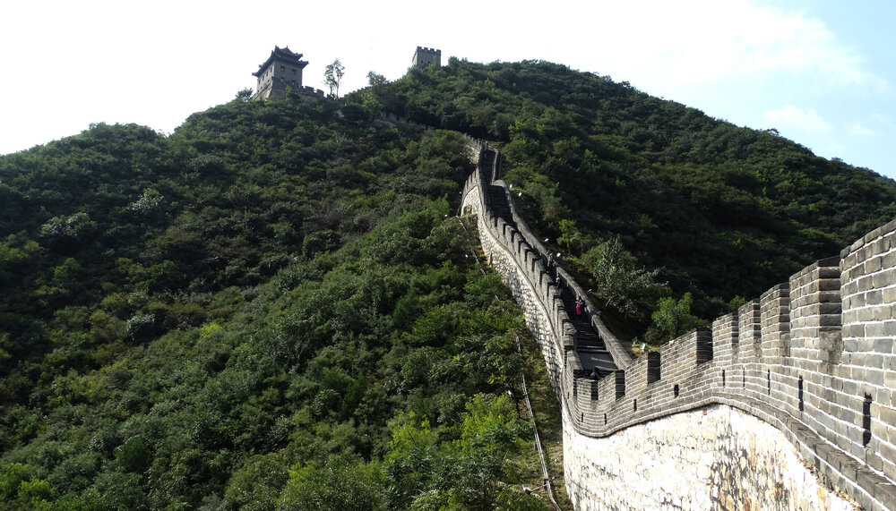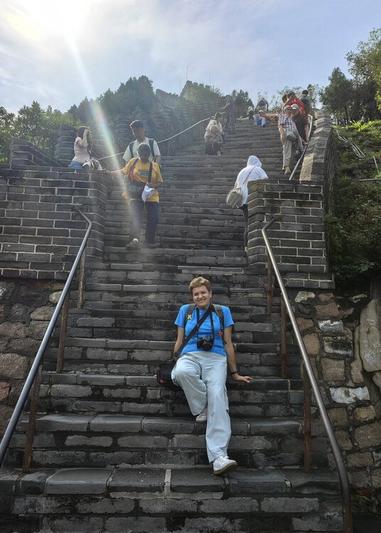 29 балловНас ждет самая известная достопримечательность Китая – Великая Китайская стена – объект всемирного наследия ЮНЕСКО и одно из семи современных чудес света. В настоящее время стена открыта для посещения не полностью, а отдельными участками, рядом с Пекином находятся три из них: Бадалин, Мутяньюй и Цзюйюнгуань. На всякий случай дома изучили все три, но больше хотели попасть на Цзюйюнгуань. Почему? А у него самое труднопроизносимое название. Шучу, конечно, не поэтому. Во-первых, это не просто участок стены, а целый укрепрайон, его даже называют Застава Цзюйюнгуань. В долине, окруженной со всех сторон высокими горами, были построены Северные (Бейгуан) и Южные (Нангуан) ворота, соединенные между собой крепостными стенами. Внутри оставалась значительная территория, на которой мог в безопасности располагаться достаточно большой гарнизон со всей инфраструктурой. Во-вторых, участок круговой. При наличии достаточного времени, можно пройти его весь, не возвращаясь обратно. На самом деле мы так и не поняли, реально это сделать или все-таки где-то проход перекрыт. В-третьих, сюда не ходят рейсовые автобусы, рядом нет железной дороги. А значит, народа должно быть поменьше, чем на популярном участке Бадалин. И еще один большой плюс Заставы Цзюйюнгуань – от парковки до стены не надо подниматься, вы практически въезжаете на стену прямо на автобусе! В принципе, из него можно и не выходить, вы уже покорили Великую Китайскую стену. Есть еще один сюрприз, о котором расскажу, как только мы немного поднимемся по стене. Как вы уже поняли, нас привезли именно на Цзюйюнгуань! Дома мы с Олей договорились, что пойдем на восточную часть Заставы, нам показалось, что там виды красивее, да и высота поменьше. Но Наташа сказала, что группам можно подниматься только по западной ветке, так что идем туда. Так как я большая и ленивая, как панда, а Оля стройная и быстрая, как газель, мы, тоже заранее, решили идти каждая в своем темпе и подняться, сколько получится за отведенные нам два с небольшим часа. Поэтому каждая из нас расскажет вам о своем подъеме отдельно. Итак, стартуем! Сначала стена заманивает вас широким пологим участком, рядом целый городок красивых домиков, идти пока несложно, первую башню проскочили и не заметили, да еще и не слишком жарко. Гиды рассказали, что в первой половине дня здесь был дождь и группы разворачивали, а мы приехали после обеда, вы сами видите, какая замечательная погода. Но если посмотреть вверх, то дальше уже появляются ступени, стена сужается, угол наклона увеличивается. Пока еще прилично выглядим, надо сфотографироваться. Оля убегает вверх, а я решаю, что до следующей площадки точно дотяну, а там посмотрим. Виды отсюда умопомрачительные! Часть группы осталась здесь любоваться пейзажами, а я поднимаюсь дальше. Олю уже и не видно. То, что можно идти в своем темпе, пройти столько, сколько тебе по силам, по самочувствию и по желанию, очень радует. Нужно следить только за временем, а в остальном ты – вольная птица. Тех, кто поднимется еще выше, ждет сюрприз. Оказывается, на участке Цзюйюнгуань есть река! Если не знать об этом заранее, то ее можно и не увидеть. А реки обычно очень оживляют и без того красивый пейзаж. Решаю спускаться и попробовать сходить в другую сторону. Спуск ничем не легче подъема, так как все ступени разной высоты и не получае