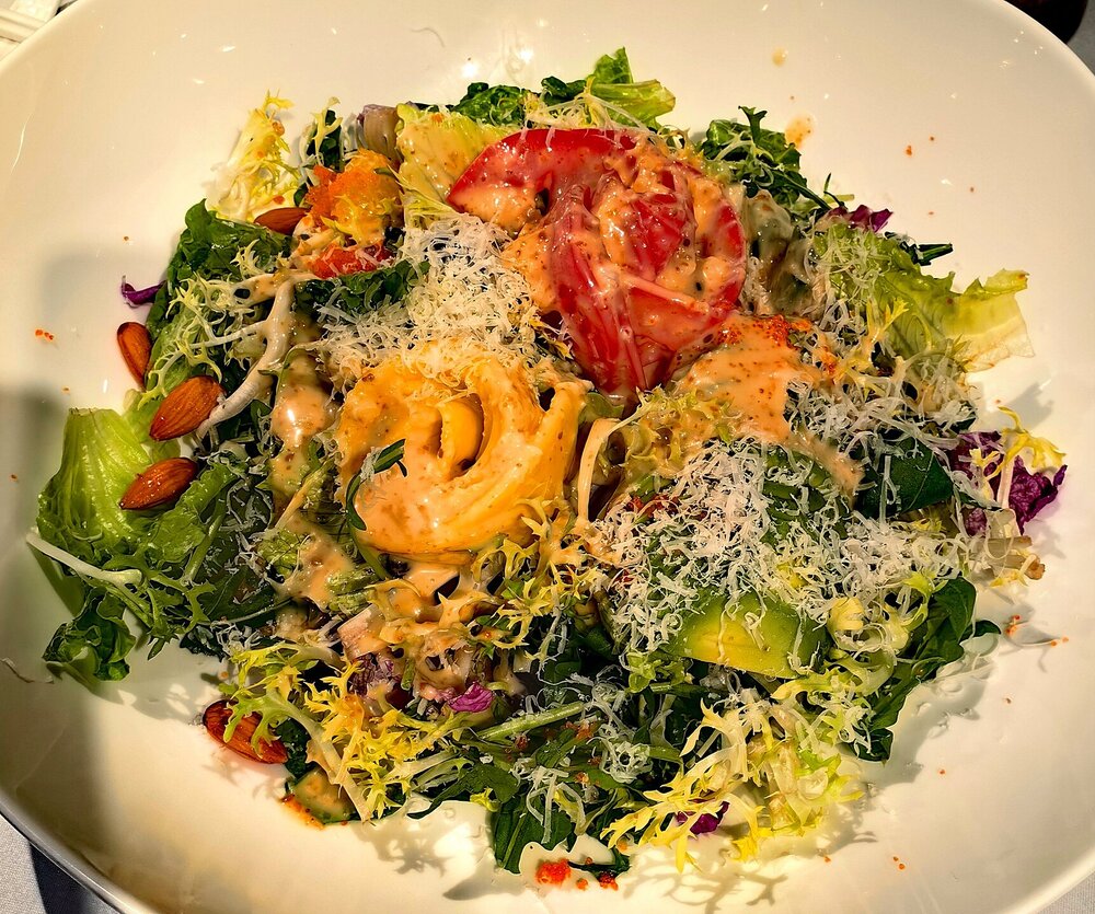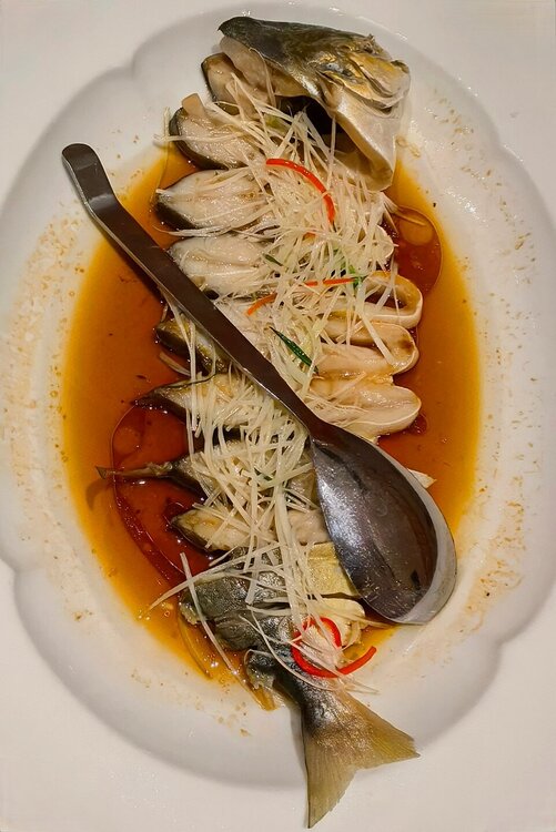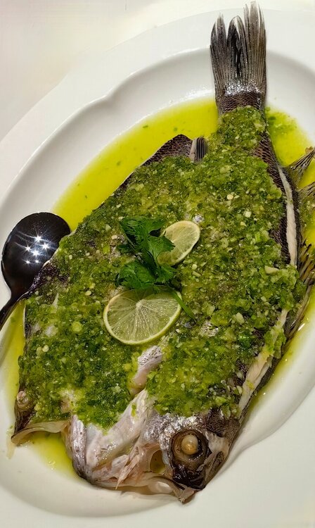 Обед в рыбном ресторане: ассорти из черноморской рыбы (ставридка,кефаль, лосось,барабулька, креветки)мидии со сливками, соус ткемали, соус из кореандра с грецкими орехами, картофель по домашнему,салат из помидоров и огурцов, ассорти из хлеба, лимонад. Всю рыбку не осилили, остатки сложили в кантарки и забрали с собой.24 балла
