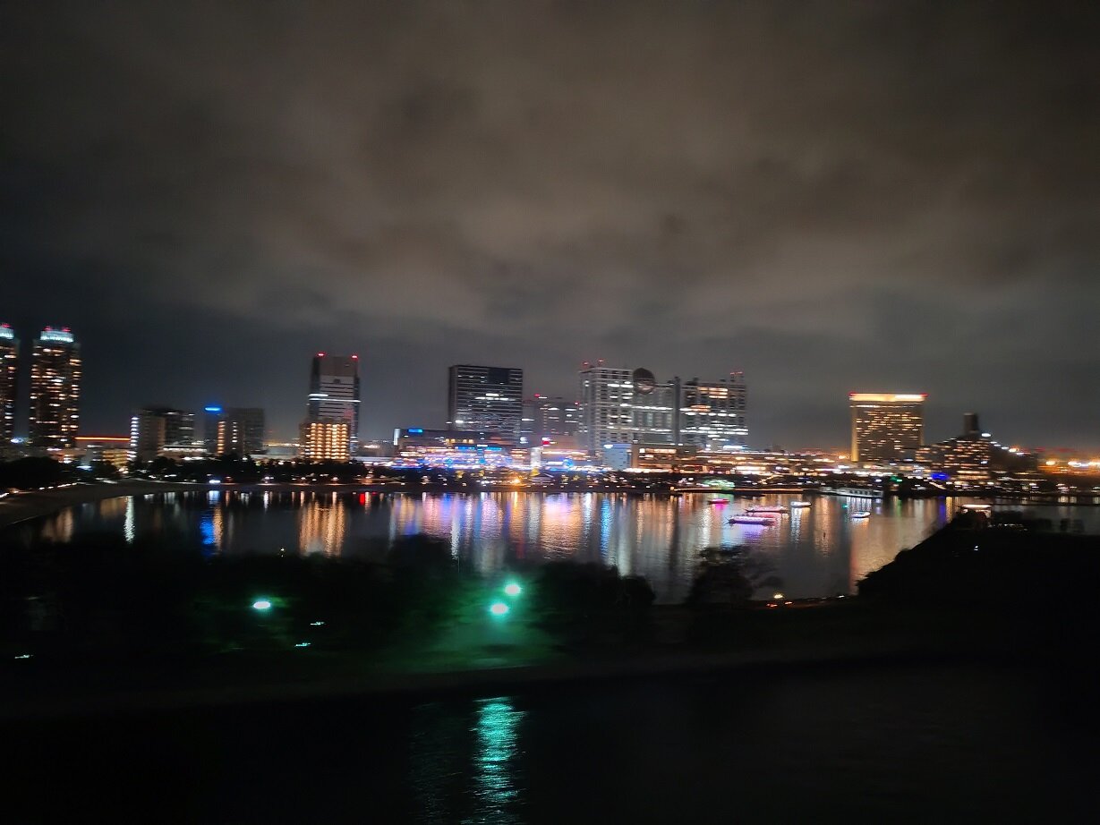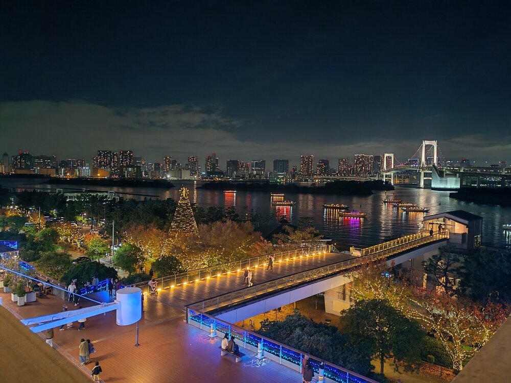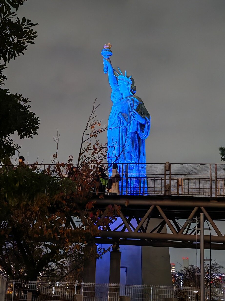 А мы продолжаем знакомство с ночным Токио. 7.mp4 Пока движемся к автобусу, видим статую Свободы, уменьшенная в 4 раза копия знаменитой американки, установленная в парке Сиокаээ, напротив Радужного моста.18 баллов
