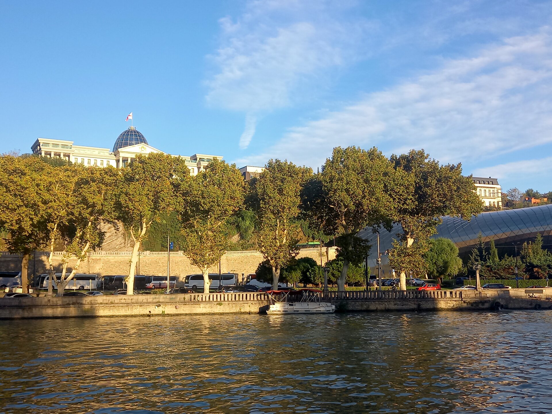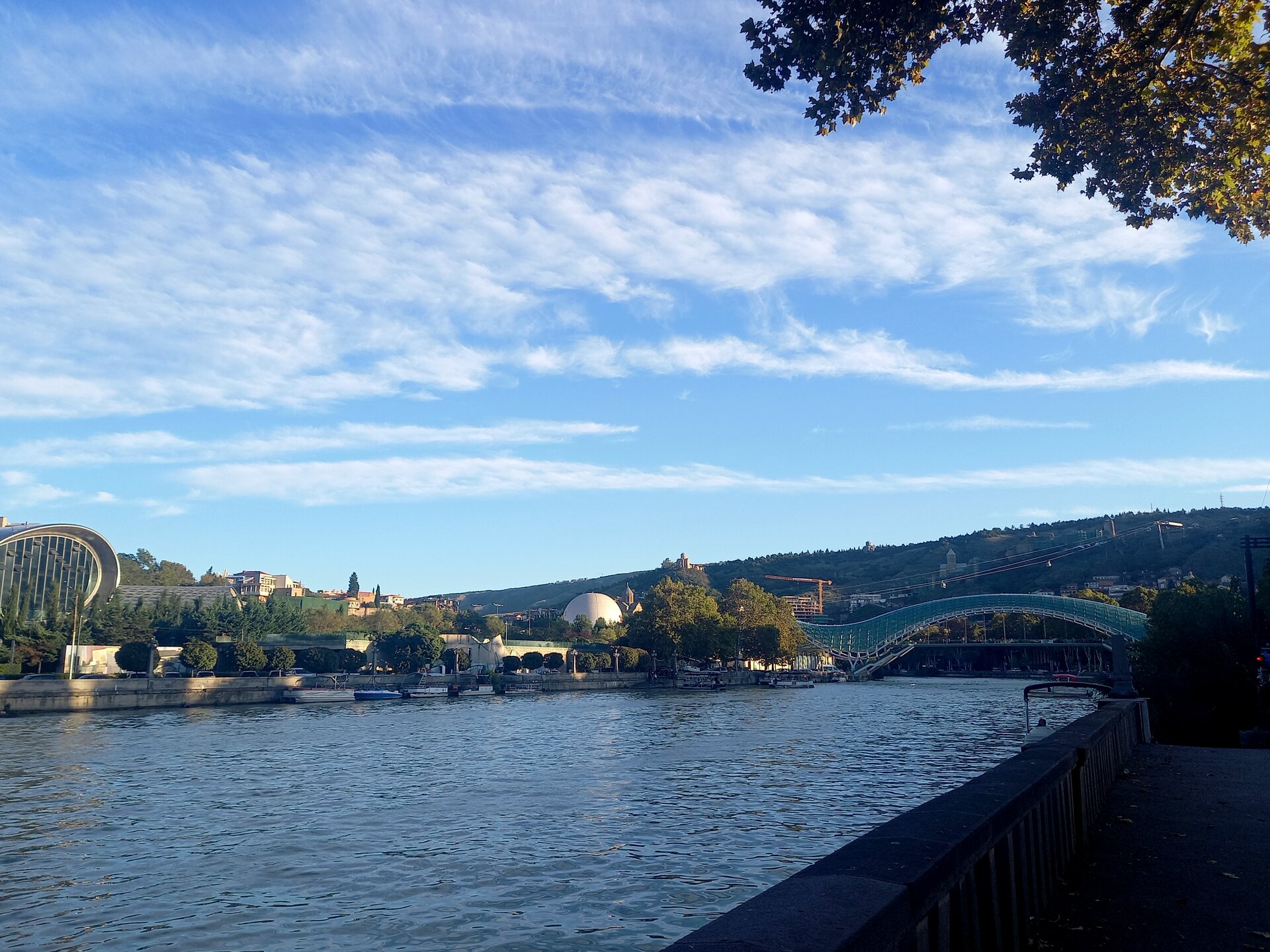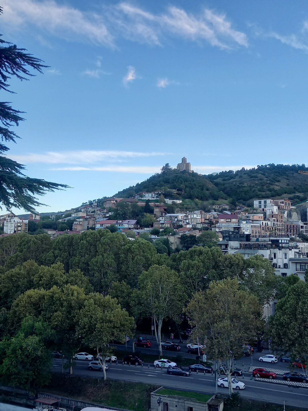 День 11. В Тбилиси. Побродив ещё немного, сделав несколько финальных фото с парковки, я отправилась на поиски Джими. Дорога, по которой мы приехали: Джими нашёлся у припаркованного рядом автобуса - разговаривал с водителем. Как раз он и привёз сюда туристов из Батуми. Распрощавшись с Цхраджвари, едем дальше. Планов никаких больше нет - просто едем до Тбилиси, коротая время за разговорами. Я, конечно же, как всегда, поначалу думала, чем бы таким ещё насытить этот день и эту дорогу, но потом вдруг что-то меня остановило. Подозреваю, то была интуиция и знание себя:)) Догадывалась, видать, что следующий день в Тбилиси я не усижу, так хоть сегодня приехать пораньше, чтобы немного погулять возможность была. В предыдущие-то дни так и не сумела. Поначалу взгляд услаждали желтые поляны вдоль дороги: А потом встали на горизонте цепочкой заснеженные горы - красавец Кавказ: На въезде в Мцхету стояла фантастическая пробка. Она тянулась и тянулась, мы ехали вдоль неё, доехали почти до самого Тбилиси, а она и не думала заканчиваться. Неужели все эти люди хотели как-то поместиться в Светицховели?! Нам как-то взгрустнулось при мысли о том, что Джими через эту пробку надо будет выезжать. И вариантов-то других нет, разве что через Цалку и Паравани? Но такой крюк времени займёт больше, чем в пробке стоять. Я как-то побоялась даже спросить, во сколько ж он с той пробки выехал... На въезде в Тбилиси пришло сообщение в ватсап - в моём гэсте отключили воду, поэтому заселиться надо было приехать в дом с верандой на крыше. Снова мне достался бонус за предыдущие дожди:) Девочки при встрече уже узнали в лицо:)) Попрощавшись с Джими, закинув вещи в номер и переодевшись, я решила дойти до рынка у Сухого моста. Просто вдруг осенило, что на сувениры-то времени впереди нет, надо хоть что-то купить. Догуляла пешком, почти успела: хотя часть продавцов уже складывали свои прилавки, всё-таки успела найти несколько оригинальных, симпатичных вещиц. Обратно пошла через парк Деда Эна, в котором по случаю выходного и прекрасной тёплой погоды яблоку негде было упасть - на газонах устраивали пикники, по фонтанам носились дети, гуляли по дорожкам молодые родители с колясками... чудесно, уютно, душевно: Через мост Мира вышла к Рике: А потом поднялась к Метехи, чтобы посмотреть на закат - надо ж соблюдать традицию:) Одно из любимых мест в Тбилиси, всегда с удовольствием провожу здесь вечера: Когда окончательно стемнело, пошла к тёте Вике поужинать. Вроде и не было в этом дне каких-либо выдающихся туристических подвигов, но вдруг почувствовалась усталость, такая, что из-за стола вставать лень. В очередной раз познакомилась за столиком в кафе с девушкой, разговорились, да так и сидели, вели неспешные беседы, делились впечатлениями и планами. Ни ей, ни мне уходить не хотелось. Когда, наконец, расстались, было что-то около половины десятого. Прихватив с собой хачапури на завтра, я отправилась в сторону дома. Мысли про завтра обо что-то вдруг споткнулись, что-то было не так... Вдруг осенило - куда-то пропал Отар. Обычно вечером накануне уточняем время (и не передумала ли я ехать вообще:)) ), а сегодня тишина... Я было уже хотела начать беспокоиться, а не случилось ли чего, но пара бокалов вина за ужином настраивали на оптимизм и спокойствие. К тому же не хотелось уже ни о чём думать, хотелось в душ и спать. "Ладно, если бы чт