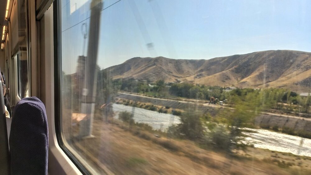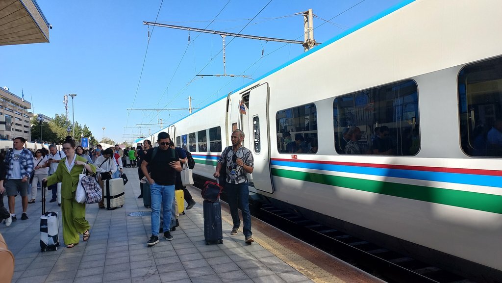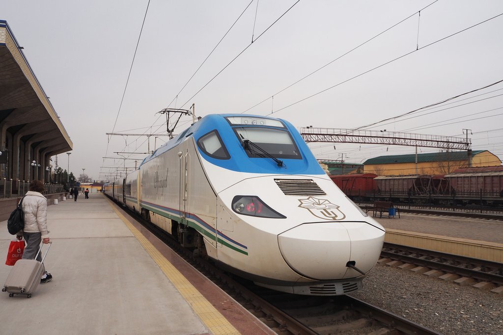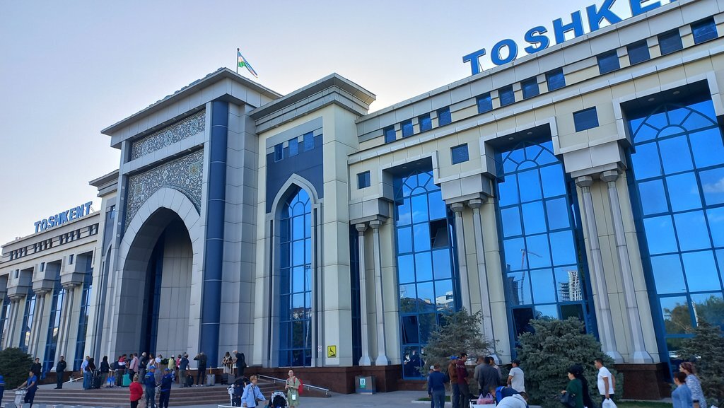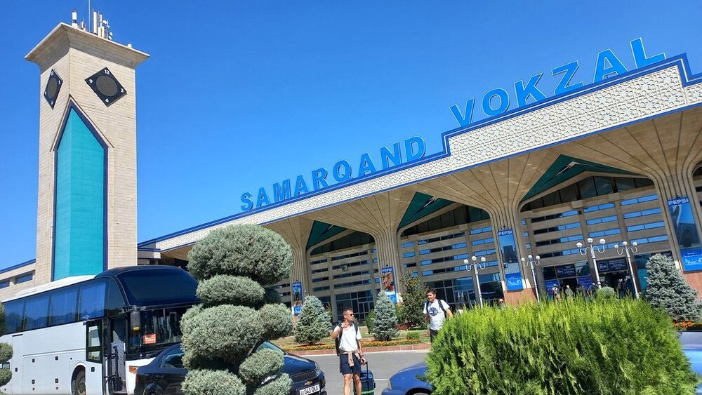 В Самарканд В 7:20 утра на скоростном поезде, который называется, как и наш ташкентский отель "Афросиаб" (в Самарканде раскроется тайна красивого названия) едем в Самарканд. Вокзал, как и аэропорт, тоже недалеко от отеля: Время в пути 2.5 часа. Поезд комфортный, быстрый, вроде всего 1 остановка была (или две?): фото локомотива из инт-та: Пейзаж за окном довольно унылый, солончаковый. Только немного местами оживляется горами, то отступающими, то подбирающимися к дороге: Пересекли Сыр-Дарью, которая здесь еще достаточно полноводна, но потом не доходит до Арала, а растворяется в пустыне. А еще проехали через Тамерлановы ворота, но сфотографировать не успели. Эти ворота - наиболее узкая часть ущелья реки Санзар недалеко от Самарканда, через которые проходит автомобильная и железная дороги. Существует красивая легенда: " почти 700 лет назад Тамерлан со своей 200 000 армией подошел к ущелью между хребтами Мальгузара и Нуратау. И остановился, поняв, что войску не пройти - слишком узок был переход. И тогда приказал Тамерлан расширить ущелье. Воины, как муравьи, работали день и ночь, разрушая скалистую породу, вывозя камни. Работа спорилась, ущелье расширялось, пока не уткнулись они в огромную глыбу. Ничем не могли воины разрушить огромный камень. Тогда Тамерлан призвал своего колдуна, требуя силой духа разбить камень. Тот посоветовал привезти из аула пастуха, который обладал неимоверными способностями. И пастух, действительно, взглядом разбил этот камень, расчленив его трещиной. Дальше было уже делом техники - проход был расчищен. Так появились ворота между двумя горными хребтами "Тамерлановы ворота". На скале есть две древние таблички, на которых написано: 1425 год. «С помощью Господа Бога, великий султан, покоритель царей и народов, тень Божья на земле, опора постановлений сунны и закона Божеского, государь, вспомоществующий вере, Улугбек–Гурган (да продлит Бог время его царствования и правления) предпринял поход в страну джетов и монголов и от того народа возвратился в эти страны невредимым, в 828 новолунном году». 1571 год. «Да ведают проходящие пустыню и путешествующие по пристанищам на суше и воде, что в 979 году происходило сражение между отрядом вместилища халифата, тени Всевышнего, великого хана Абдулла–хана, сына Искандер–хана, в 30 000 человек боевого народа, и отрядом Дервиш–хана и Баба–хана и прочих сыновей. Сказанного отряда было всего: родичей султанов до 50 000 человек и служащих людей до 400 000 из Туркестана, Ташкента, Ферганы и Дешт–и–кипчака. Отряд счастливого обладателя звезд одержал победу. Победив упомянутых султанов, он из того войска предал стольких смерти, что от убитых в сражении и в плену в течение одного месяца в реке Джизакской на поверхности текла кровь. Да будет это известно» - во втором случае речь про того самого Абдулла-хана II из династии Шейбадиндов, который построил в отвоёванном у местных феодалов Ташкенте медресе Кукельдаш близ Чорсу. Была когда-то ещё и третья надпись: «Николай II в 1895 году повелел: «Быть железной дороге!». В 1898 году исполнено.» - только не на скале, а на бронзовой табличке, не пережившей революцию. Ну, и вся остальная доступная поверхность ворот знатно отвандалена надписями типа "Подумаешь, Тамерлан с войском, главное, Киса и Ося были тут тоже". Выходим на вокзале Самарканда: Наш автобус уехал в Самарканд еще с веч