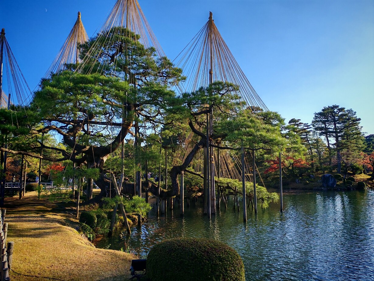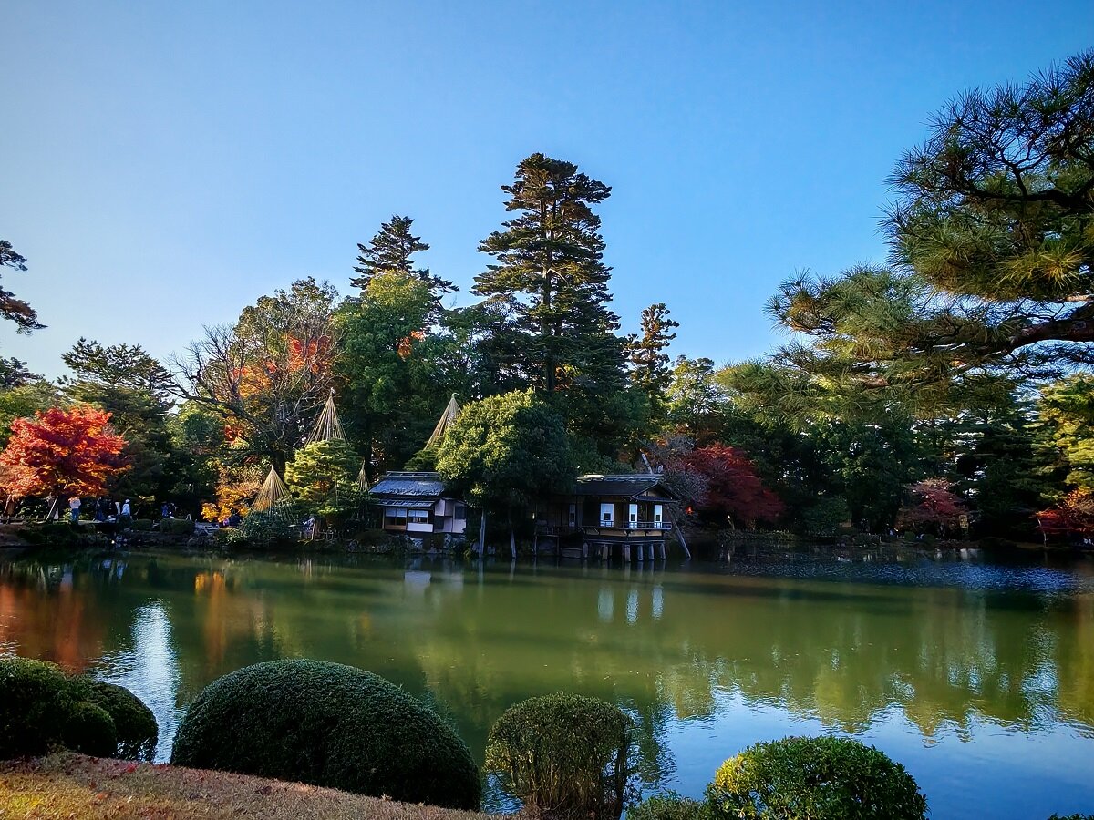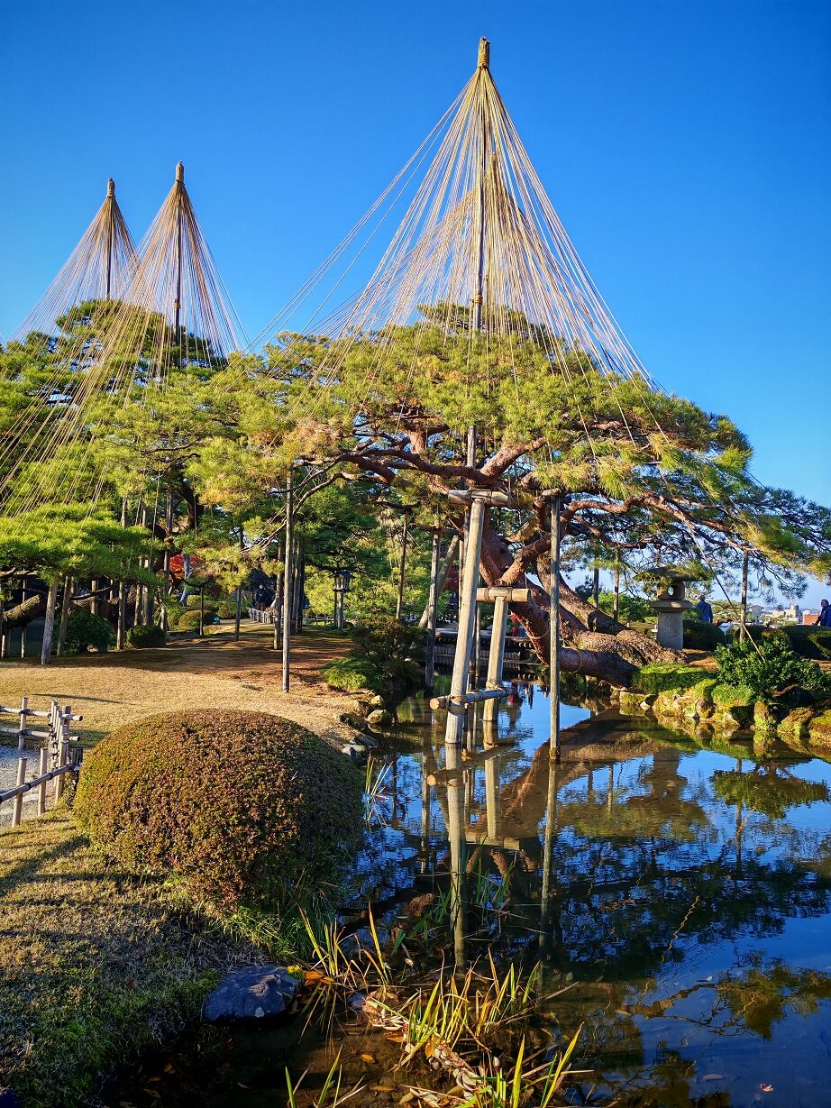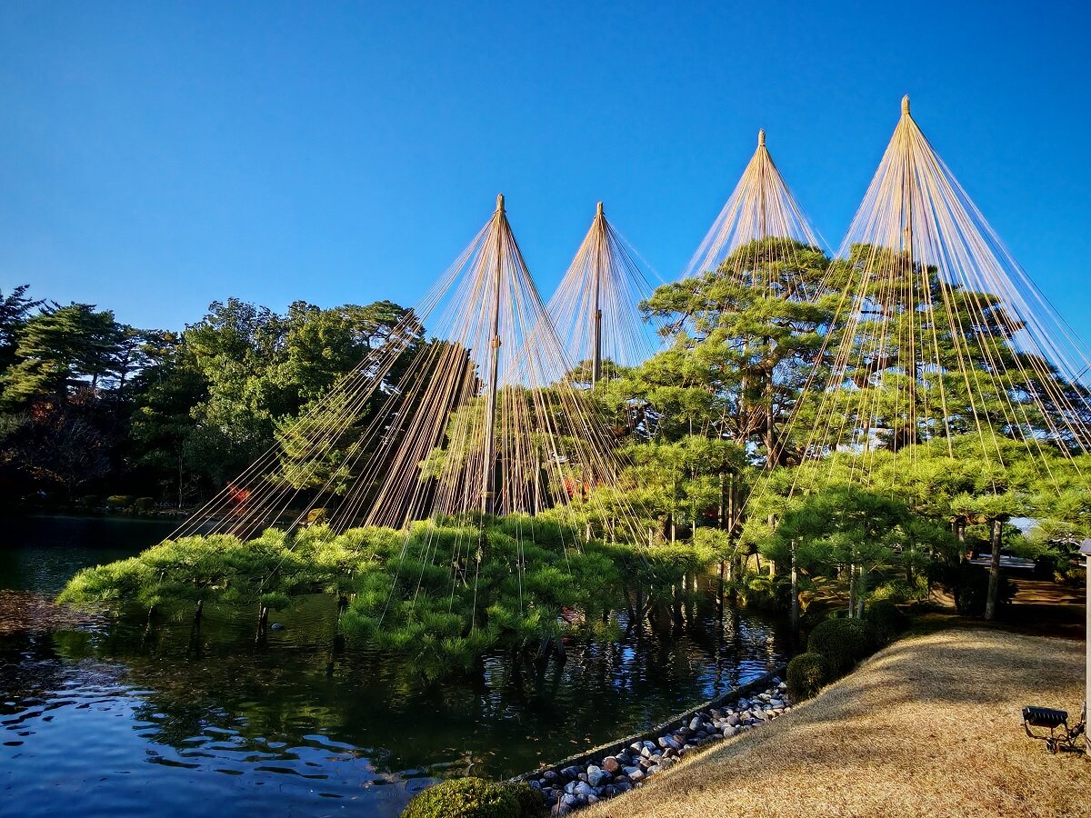 Зимой деревья укрепляют с помощью специальных верёвок, натянутых к вершине столбов, чтобы защитить ветви от тяжёлого снега (система называется юкицури). Чайный домик Югао-тэй — старейшее здание в саду, построено в 1774 году14 баллов