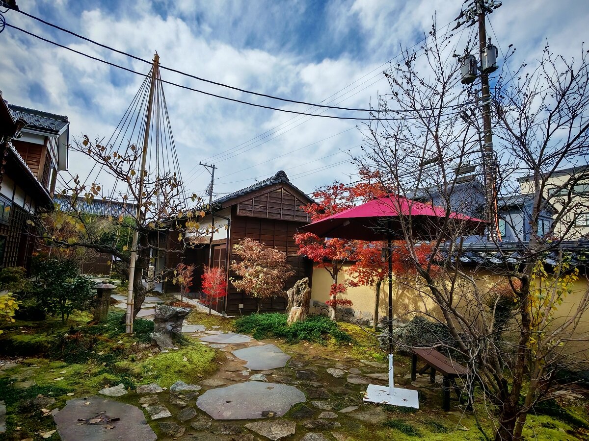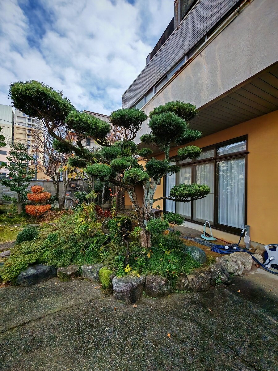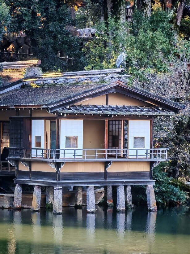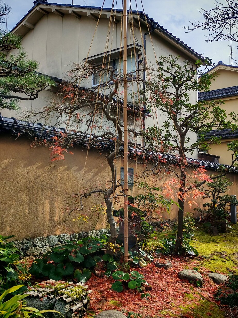Зимой деревья укрепляют с помощью специальных верёвок, натянутых к вершине столбов, чтобы защитить ветви от тяжёлого снега (система называется юкицури). Чайный домик Югао-тэй — старейшее здание в саду, построено в 1774 году14 баллов