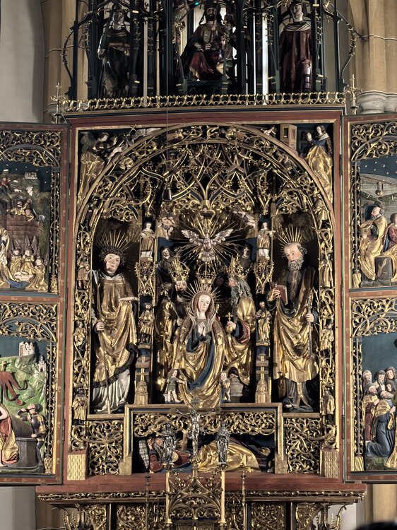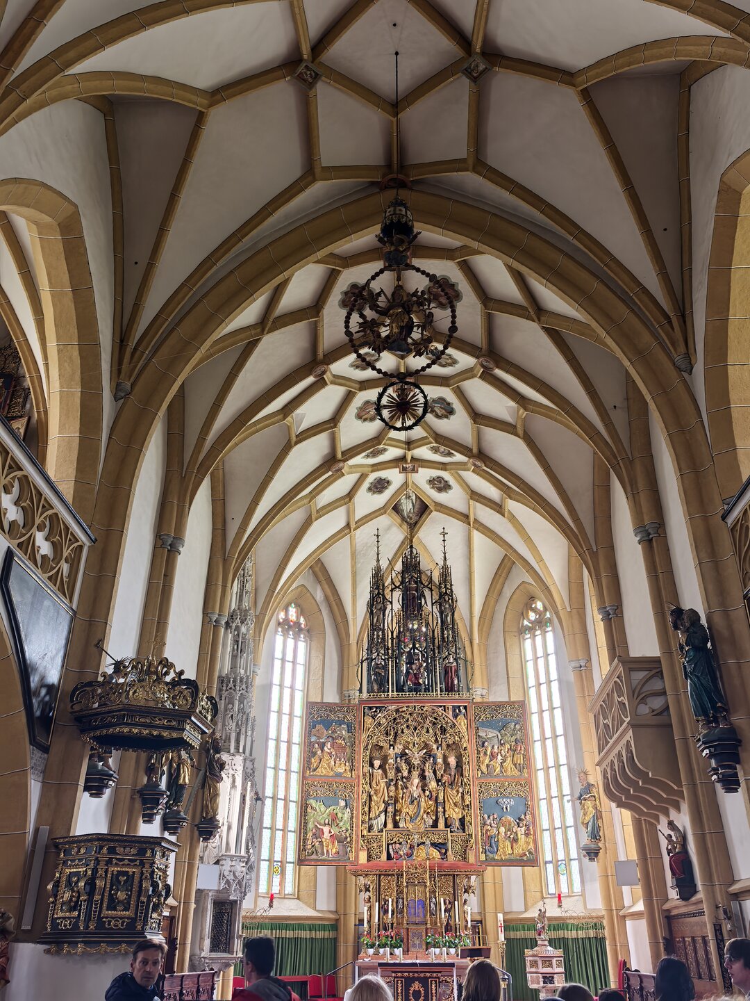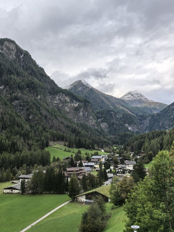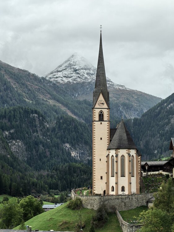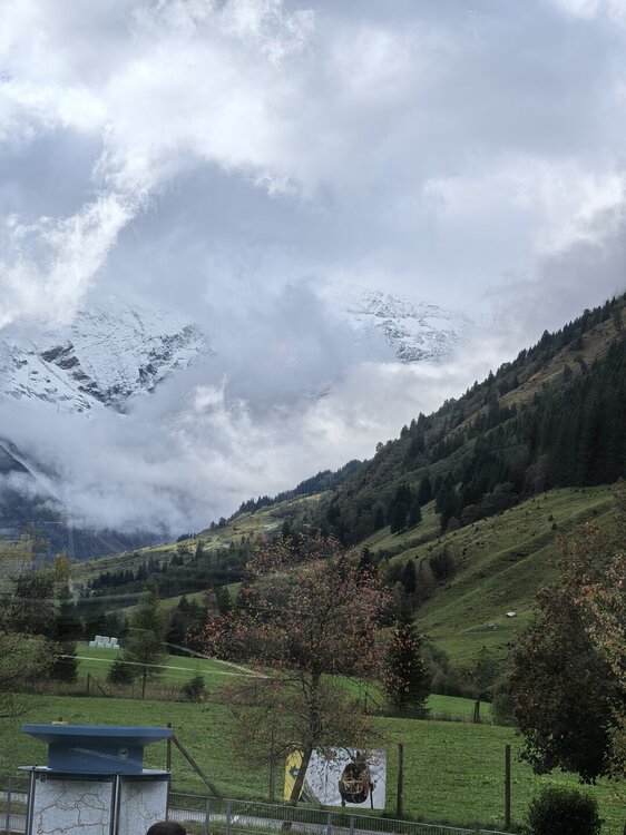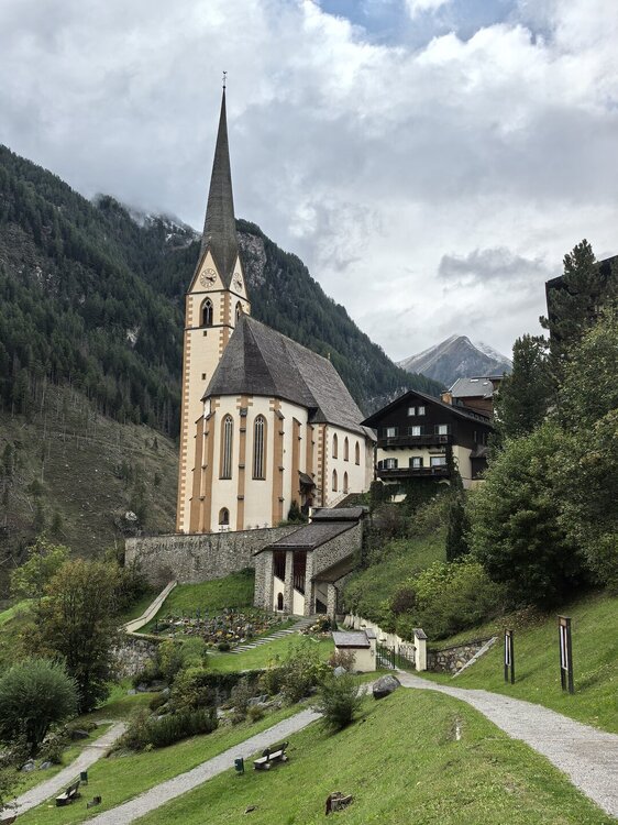 После обеда нас ждёт спуск с высоты. Разыгралась метель, но уже через минут 20 снег сменился зеленой травой. Мы делаем остановку в коммуне Хайлигенблут, это допзаезд от Олега. Чем она знаменита кроме того, что её жители ежедневно могут наблюдать красоту? Вот такой готической церковью св. Винценца на фоне горы Гросглокнер (её не видно). VID_20250925_151957.mp4 Здесь хранится реликвия - Святая Кровь Христа, и легенда гласит, что датский рыцарь Брициус вёз её к себе домой, а для сохранности вшил капсулу себе в ногу, но не довёз как вы уже поняли по храму. И, якобы разрезав ногу, это капсулу нашли, а рыцаря похоронили в склепе при сначала часовне, а теперь церкви на месте обнаружения. Рыцаря засыпало лавиной аж в 914 году и нашли его по трем колоскам, взошедшим на месте его гибели под снегом. Церковь же была отстроена в камне как мы сейчас её и видим в 15 веке. Мы спускались в склеп к этому славному рыцарю, его надгробная плита как раз иллюстрирует метод скрытия капсулы с Кровью Христа - на ноге изображен разрез. На гербе города изображены эти три колоска. В церкви сохранился резной алтарь 16 века. Чем ещё интересен городок? Когда-то здесь добывали золото и другие полезные ископаемые, о чем нам говорит этот памятник. Сейчас же здесь всё связано с туризмом и альпинизмом. В общем очень живописный городишко, а какой там воздух!!! Жаль, фото не передают этого. А пока мы возвращаемся альпийскими дорогами на равнину. VID_20250925_160410.mp4 Этот вечер нам подарил очень живописный закат. VID_20250925_174534.mp4 По дороге Олег предложил допзаезд, но не набралось нужное количество желающих :( Очень жаль! Судя по звукам на галерке автобуса, там был самосуд над теми кто не не захотел допзаезд 😂 Поэтому нас завезли в биллу, а потом мы поехали в отель Ибис на берегу озера. Очень интересная концепция отеля, от вдоль трассы, но живописно, тут же под одной крышей с ним кафе самообслуживания и не только, куда можно зайти любому страждующему, а вход в отель по магнитным ключам и расположен он весь на первом этаже, что очень удобно. Но самое главное меня ждало там утром! А пока пошёл дождь, и мы решили остаться в отеле, ведь завтра нас ждёт Словения! Вид из окна.16 баллов