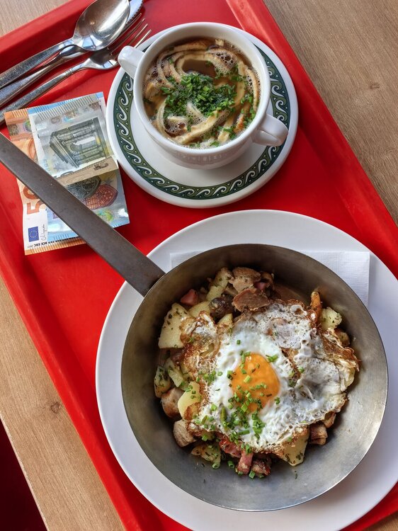 Самая высокая точка этой дороги, которую мы проезжали, была перевалом 2500 метров. В какой-то момент мы спустились и снег почти отступил, а потом снова начали подниматься. Мы заехали на обед в туристический комплекс. Там чего только нет, даже музей, и огромная парковка для легковых авто прямо в скале. Наш обед выглядел прямо как в известной песне "Хочешь за окошком Альпы?.." Здесь расположен ледник, который тает, образуя такие озера. Олег помог каждому с заказом, т.к. в немецком мы не сильны)) Суп дня что-то вроде мясного бульона с добавлением резаных блинов. Жирненько, всё как и нужно чтобы согреться в горах :) А сковорода с нарезкой жареной колбасы,сальцем и картошечкой, и всё это прикрыто глазуньей. Мы её ждали дольше всех, но оно того стоило. Обед обошелся около 20 евро. А за окном и по дороге такая красота! Альпы - это по-любви ❤️ VID_20250925_125423.mp4VID_20250925_125533.mp4VID_20250925_125753.mp4VID_20250925_132325.mp4VID_20250925_132413.mp418 баллов