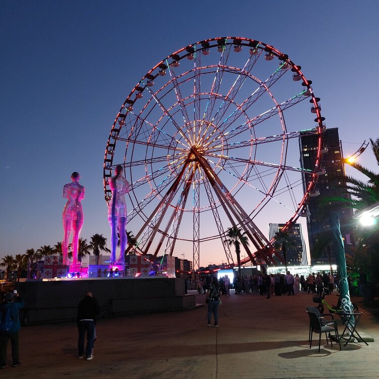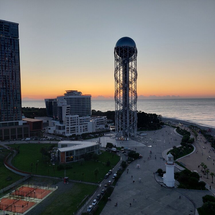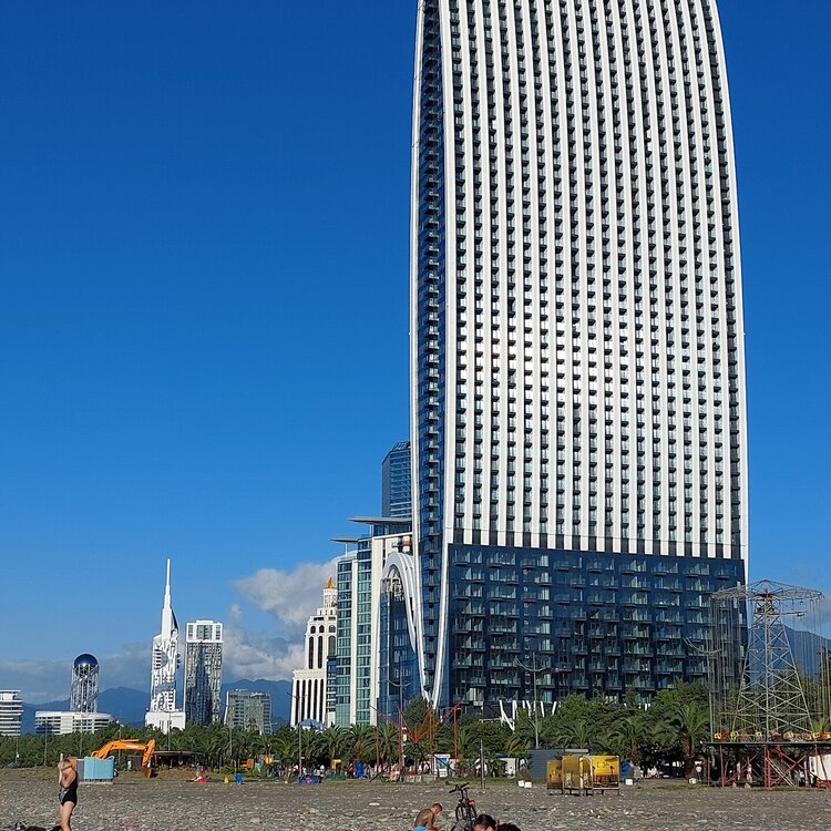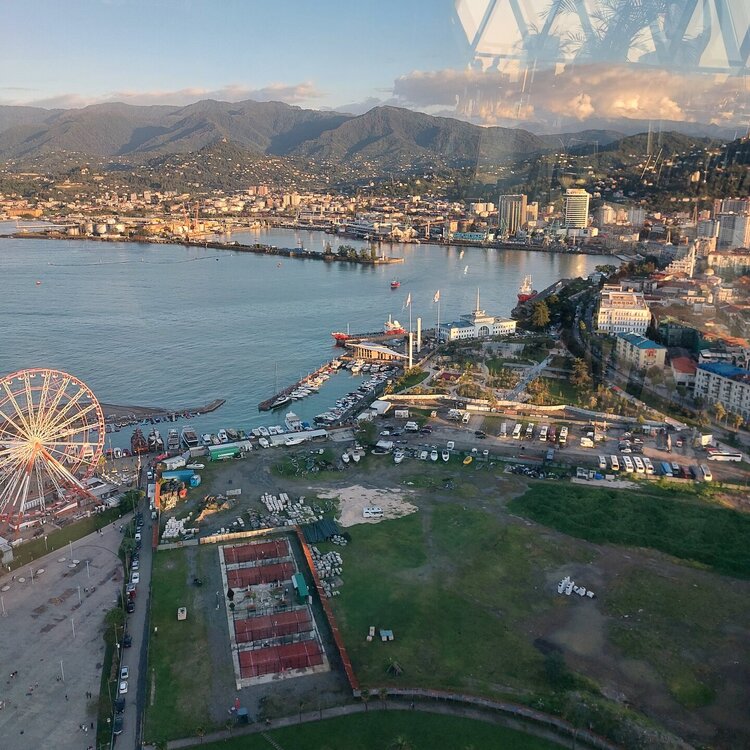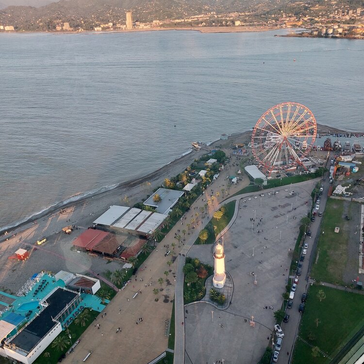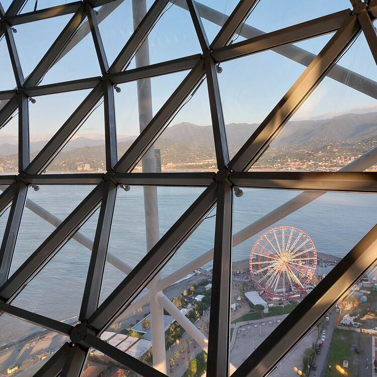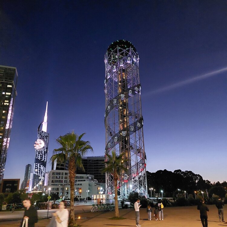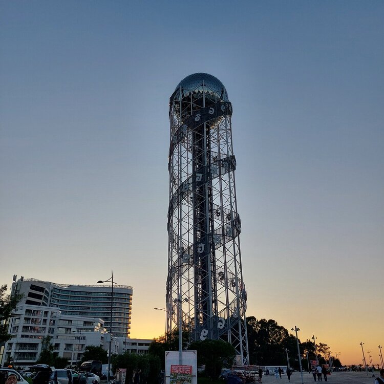 Пообедав, мы с Машей вернулись в отель, правда поблудили немного, сначала пошли не в ту сторону. У Маши дальше были свои планы. Я же переоделась , потому как стало значительно теплее и пошла по прямой к морю, что бы прогуляться по набережной в сторону Парка Чудес. Очень хотелось подняться на Башню Азбуки и покататься на колесе обозрения. Набережная Батуми протянулась на расстоянии 7 км. Если по ул.Грибоедова от отеля выйти к морю, то налево набережная тянется на расстояние 2,5км мимо красивых небоскребов. Если пойти направо , то до Колеса обозрения и памятника АЛИ и НИНО, башни Азбука идти примерно 4,5 км. К сожалению после проливных ливней, сошедших селей, сильного ветра и шторма пляж выглядел вот так. Убирать весь этот выброшенный мусор никто не спешил🙄. На пляже ,что напротив нашего отеля довольно крупные камни, я их даже галькой назвать не могу. Специально на фото поставила ногу в кроссовке, чтобы можно было размер оценить. Что радовало, по всей набережной, каждые 10 метров стояли скамейки. Поэтому очень приятно гулять, всегда можно присесть и отдохнуть. Башня Азбуки или Алфавита «Башня Алфавита») — архитектурное сооружение в Батуми, символизирующее уникальность грузинского алфавита и языка. Башня находится в северной части Приморского бульвара.Ее высота 130 м и она хорошо видна с любой точки в окрестностях. Второе популярное название — башня грузинского ДНК. Башня расположилась по соседству с высокими отелями, активно строящимся небоскребом, финансируемым президентом США Дональдом Трампом, колесом обозрения, движущейся статуей Али и Нино Батумскую башня ДНК построена недавно: в 2012 году. Архитектором выступил испанец, Альберто Доминго Кабо. Благодаря его творению, в Батуми появился не просто символ города. Башня показывает любовь и почитание грузинами родного языка: конструкция по всей высоте обвита лентами с 33 буквами грузинского алфавита, внешне напоминающими ДНК. По изначальному проекту, в башне должны были уместится: телестудия, обсерватория, смотровая площадка и вращающийся вокруг оси шикарный ресторан. Что пошло не так неизвестно. Но ничего из этого в башне не появилось. Сейчас в здании есть только ресторан с рейтингом 3,8 баллов из пяти. Отзывы ну очень спорные. Цены…… Самый простой коктейль стоит от 1000 руб, мороженое от 900 руб. еду в меню даже смотреть не стала. Подняться на башню можно на лифте за 20 лари. В расписании написано что работает с 11:00 до 00:00ч. Но иногда бывает закрыто без объяснения причин. Сначала поднимаешься на лифте до верхней площадки. 20250921_183921.mp4 Там нужно пересесть на другой лифт, который привозит вас в ресторан. 20250921_184226.mp4 Посмотрите какое в этой части набережной спокойное море. И галька здесь мелкая, заход в море лучше. 20250921_184737.mp4