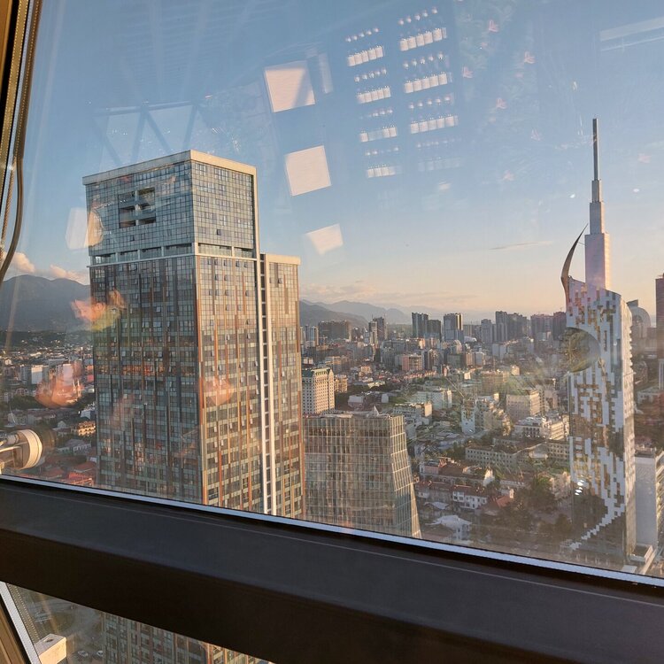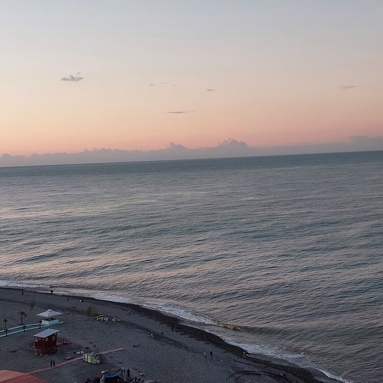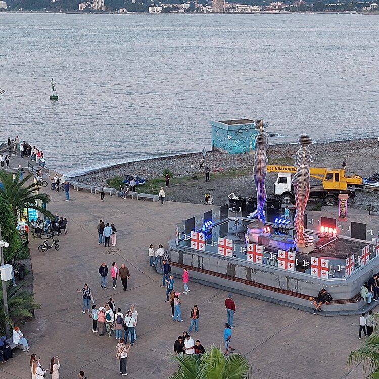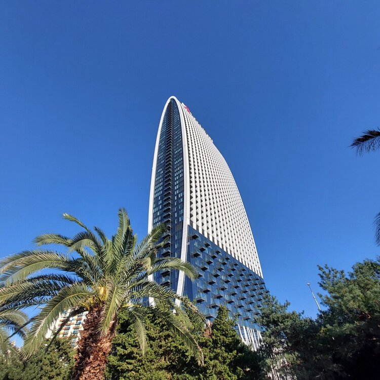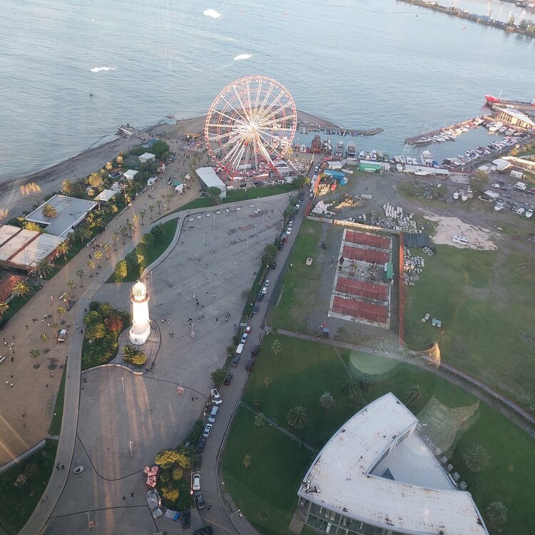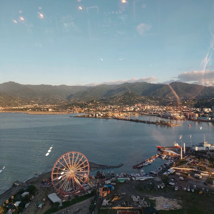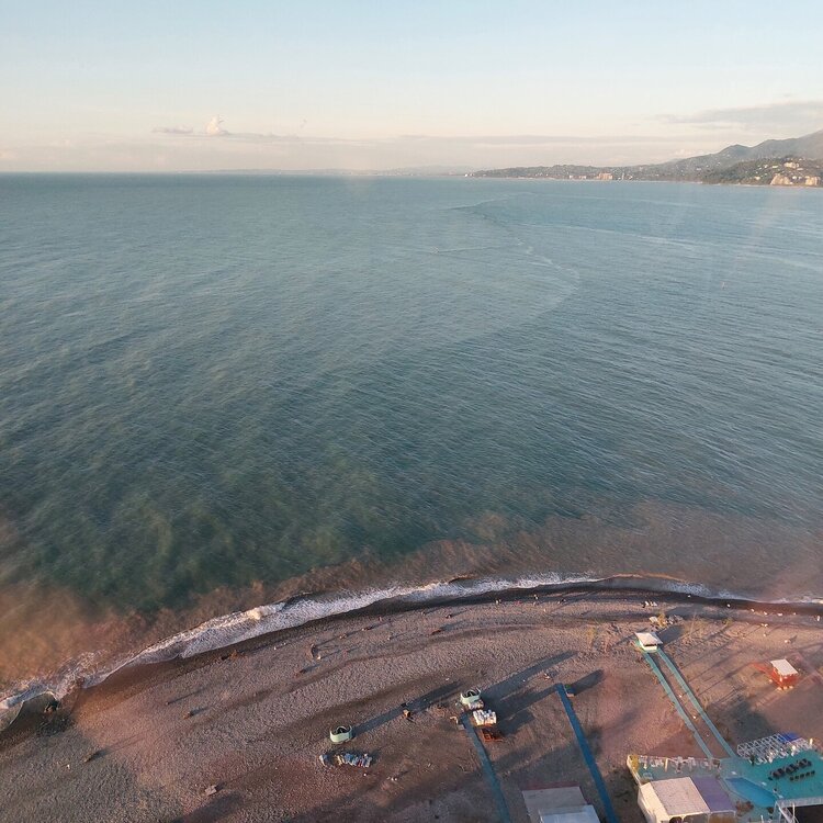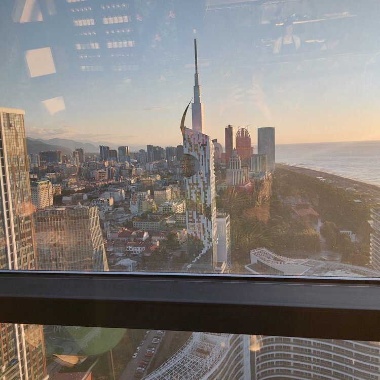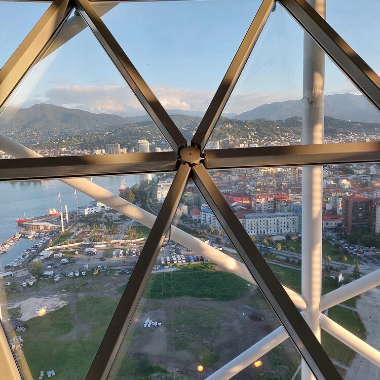 Пообедав, мы с Машей вернулись в отель, правда поблудили немного, сначала пошли не в ту сторону. У Маши дальше были свои планы. Я же переоделась , потому как стало значительно теплее и пошла по прямой к морю, что бы прогуляться по набережной в сторону Парка Чудес. Очень хотелось подняться на Башню Азбуки и покататься на колесе обозрения. Набережная Батуми протянулась на расстоянии 7 км. Если по ул.Грибоедова от отеля выйти к морю, то налево набережная тянется на расстояние 2,5км мимо красивых небоскребов. Если пойти направо , то до Колеса обозрения и памятника АЛИ и НИНО, башни Азбука идти примерно 4,5 км. К сожалению после проливных ливней, сошедших селей, сильного ветра и шторма пляж выглядел вот так. Убирать весь этот выброшенный мусор никто не спешил🙄. На пляже ,что напротив нашего отеля довольно крупные камни, я их даже галькой назвать не могу. Специально на фото поставила ногу в кроссовке, чтобы можно было размер оценить. Что радовало, по всей набережной, каждые 10 метров стояли скамейки. Поэтому очень приятно гулять, всегда можно присесть и отдохнуть. Башня Азбуки или Алфавита «Башня Алфавита») — архитектурное сооружение в Батуми, символизирующее уникальность грузинского алфавита и языка. Башня находится в северной части Приморского бульвара.Ее высота 130 м и она хорошо видна с любой точки в окрестностях. Второе популярное название — башня грузинского ДНК. Башня расположилась по соседству с высокими отелями, активно строящимся небоскребом, финансируемым президентом США Дональдом Трампом, колесом обозрения, движущейся статуей Али и Нино Батумскую башня ДНК построена недавно: в 2012 году. Архитектором выступил испанец, Альберто Доминго Кабо. Благодаря его творению, в Батуми появился не просто символ города. Башня показывает любовь и почитание грузинами родного языка: конструкция по всей высоте обвита лентами с 33 буквами грузинского алфавита, внешне напоминающими ДНК. По изначальному проекту, в башне должны были уместится: телестудия, обсерватория, смотровая площадка и вращающийся вокруг оси шикарный ресторан. Что пошло не так неизвестно. Но ничего из этого в башне не появилось. Сейчас в здании есть только ресторан с рейтингом 3,8 баллов из пяти. Отзывы ну очень спорные. Цены…… Самый простой коктейль стоит от 1000 руб, мороженое от 900 руб. еду в меню даже смотреть не стала. Подняться на башню можно на лифте за 20 лари. В расписании написано что работает с 11:00 до 00:00ч. Но иногда бывает закрыто без объяснения причин. Сначала поднимаешься на лифте до верхней площадки. 20250921_183921.mp4 Там нужно пересесть на другой лифт, который привозит вас в ресторан. 20250921_184226.mp4 Посмотрите какое в этой части набережной спокойное море. И галька здесь мелкая, заход в море лучше. 20250921_184737.mp4