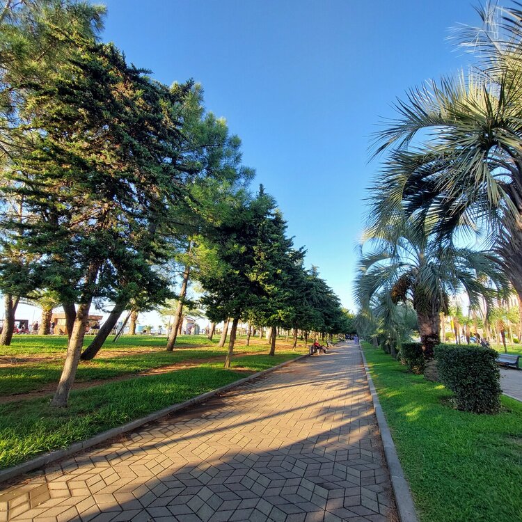 К 12 часам дождь стал затихать. Тут как раз позвонила Маша и предложила добежать до Батуми-молл и чем сидеть в номере прогуляться хотя бы по торговому центру. Быстро собрались, вышли из отеля и дождь практически кончился. Ура!!! Так как Маша вчера в Трабзон не ездила и они весь день гуляли по правой части набережной, то сегодня мы с решили пойти гулять в левую часть , предварительно забежав в Батуми-молл. К тому моменту , когда мы дошли до моря, дождь совсем кончился , вышло солнце и небо стало такое голубое… Но море продолжало штормить….. 20250921_141330.mp4 20250921_141747.mp4 На этой аллее стоят такие столики со скамейками, под столиками есть место для зарядки телефонов.