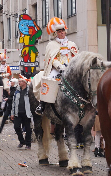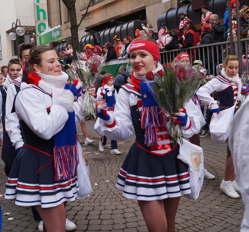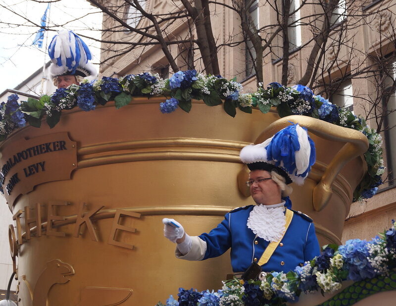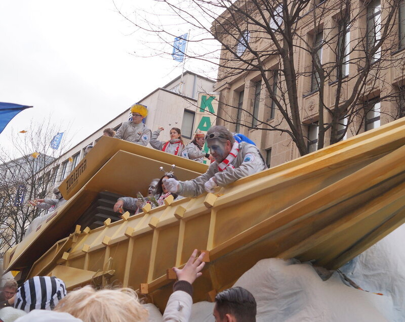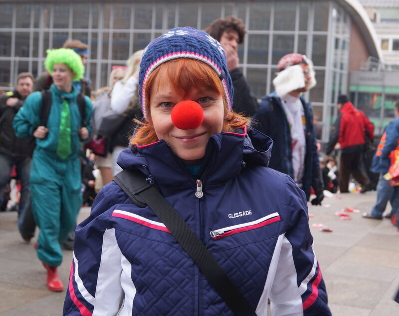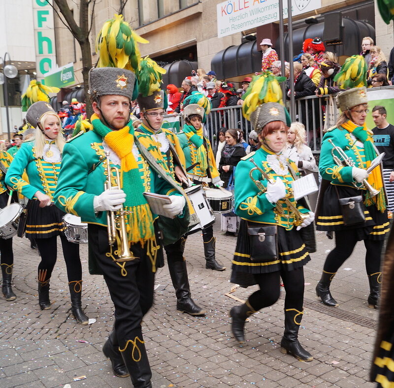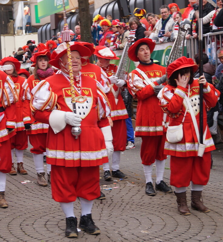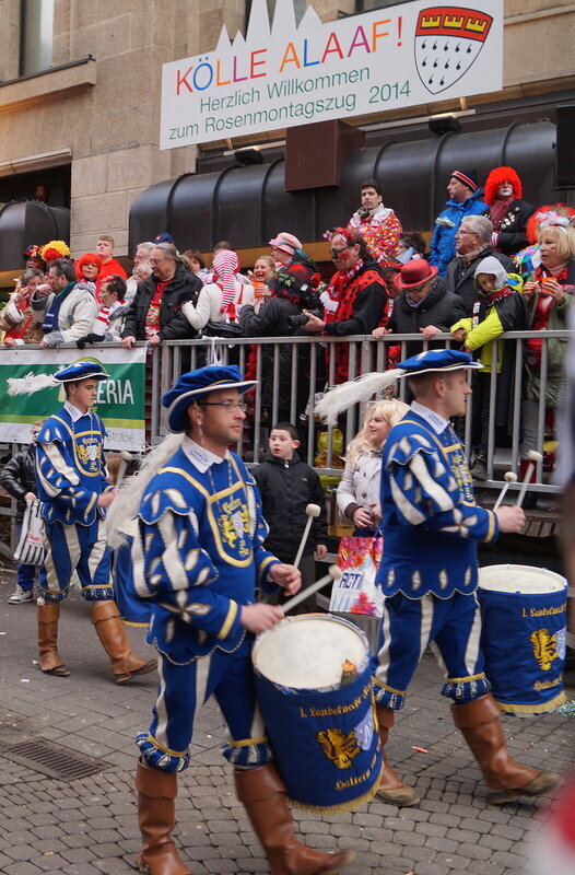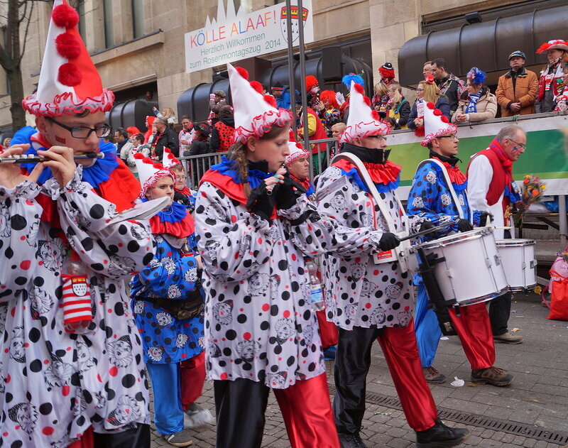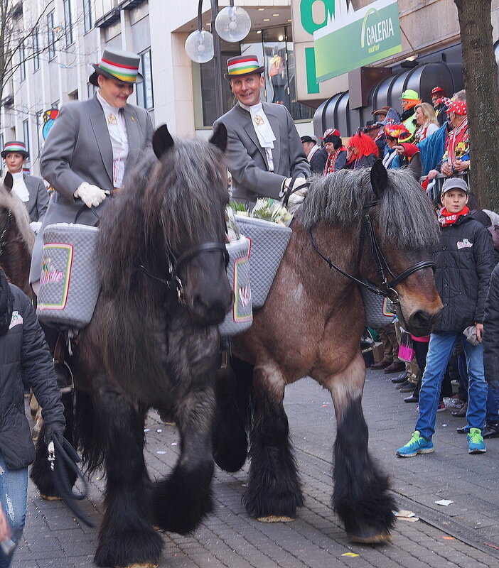 Скажу сразу, Кёльн я почти не видела. Уже ранним утром большая часть центра была перекрыта, а собор, к великому моему сожалению, вовсе отгородился от карнавальной вакханалии закрытыми дверями. Поэтому фото города не будет, если есть у кого-то, попрошу добавить. У меня же будут карнавальные персонажи:) Карнавал традиционно проводится в Розовый понедельник и представляет собой шествие, проходящее следующим образом: впереди идёт человек с табличкой, на которой название общины и год, с которого она участвует в карнавалах. На некоторых табличкой есть 1800-ые годы, т.е это старейшие участники с самого начала проведения (1823 г), они идут первыми. В составе общины проходят музыканты, участники в карнавальных костюмах, часто с эмблема общины, иногда едут конные участники или повозки. На них часто большие куклы или прочее оформление на злободневные политические, спортивные, общественные сюжеты. Традиционными персонажами карнавала считаются Принц, Крестьянин, Дева, Епископ, их модно увидеть часто в разных вариациях. Шествие сопровождается периодически звучащим лозунгом: "Кёлле аллаф!" (примерное згачение - "Да здравствует Кёльн!") Какого-то чёткого принципа объединения в общины нет. Если изначально это были, как правило, соседи по месту жительства или ремесленные артели, то со временем соседи разъехались по разным районам города, но потомственное членство в общине-то осталось! Общин много. Мы простояли около трех часов, мимо нас всё шли и шли, окончания так и не дождались, отправились на поиски воды/перекуса. Зрители тоже все принаряженные, кто-то в полноценных костюмах, кто-то с лидельными яркими элементами - шарфами, шляпами и пр. Совсем не украшенным быть не рекомендуется, добрые кёльнцы помогут украситься, высыпав или брызганув какой-нибудь краски, конфетти и прочего. А ещё зрители приходят с большими сумками и зонтами. Потому что главная прелесть карнавала - это охота за сладостями, которые буквально тоннами разбрасывать участники во время шествия. Догадались, зачем нужен зонт?:) нет, не прятаться от конфет, а ловить их в перевёрнутый раскрытый зонтик:)) от этих зонтов, правда, приходится уворачиваться, дабы не получить по физиономии/фотоаппарату, потому что кёльнцы участвуют в ловле конфет очень рьяно от мала до велика, и особых привилегий для детей я не заметила. А ещё меня покорили лошадки! Такие красавицы вышагивали в клёшах! И сумки размером с ведро видите у них? Это конфеты:) в паузах в движении туда ещё из мешков, что на повозках везут, досыпают. Иногда вместе с конфетами раздают и цветы: