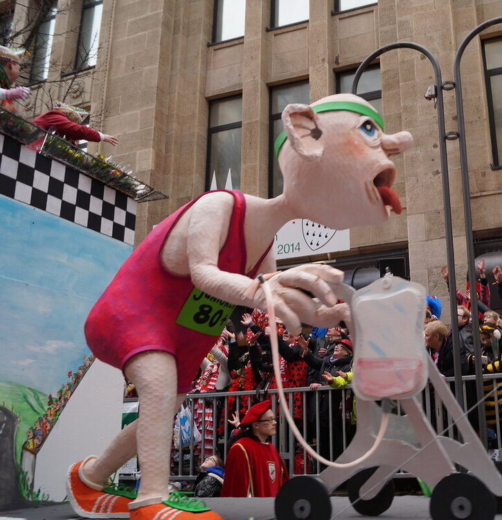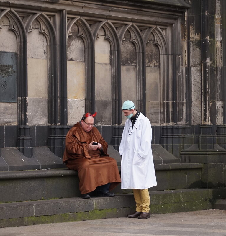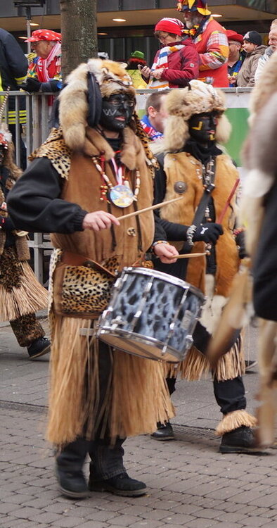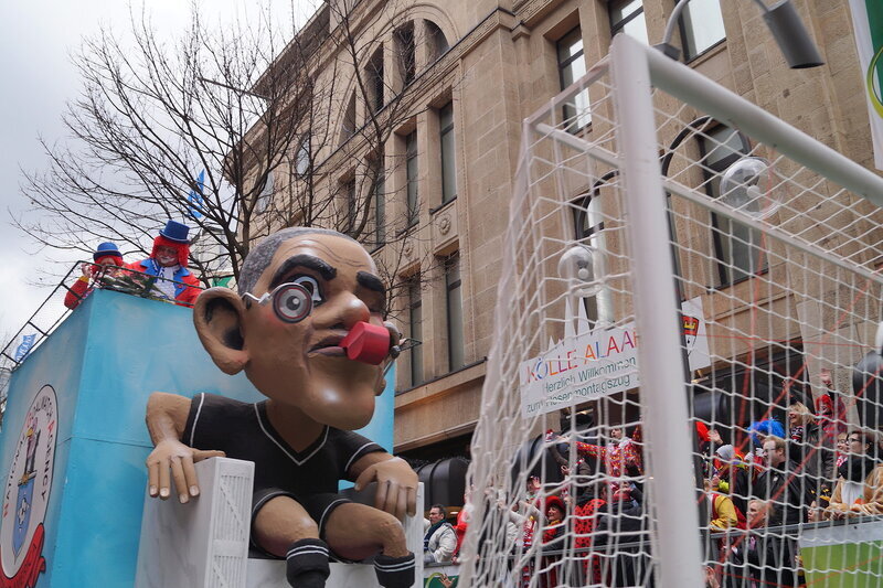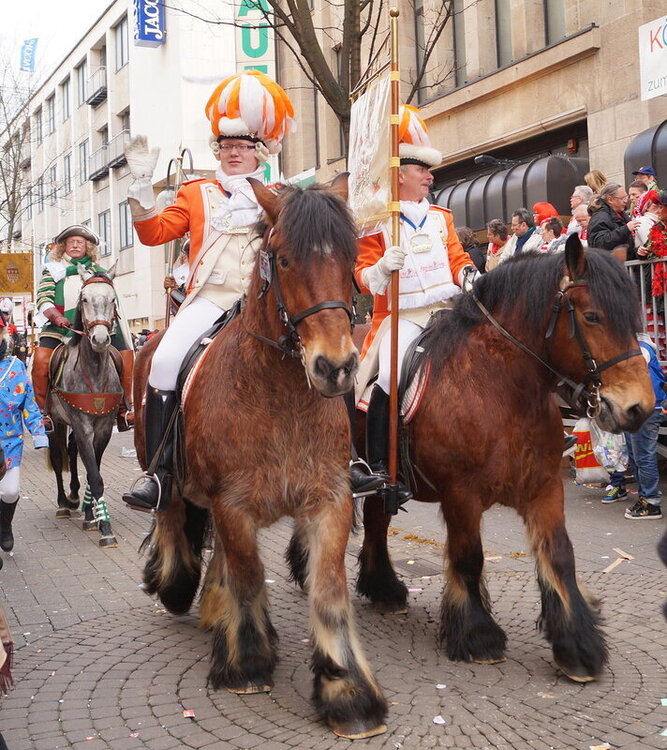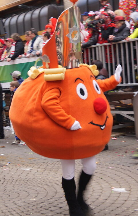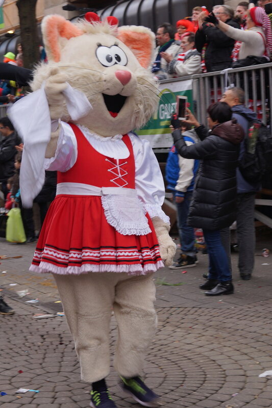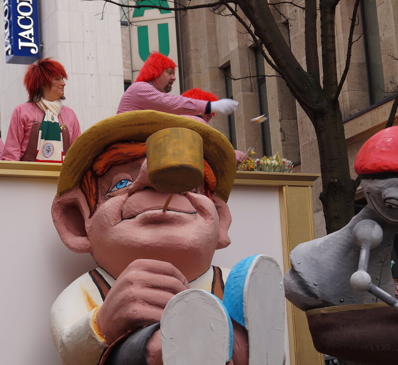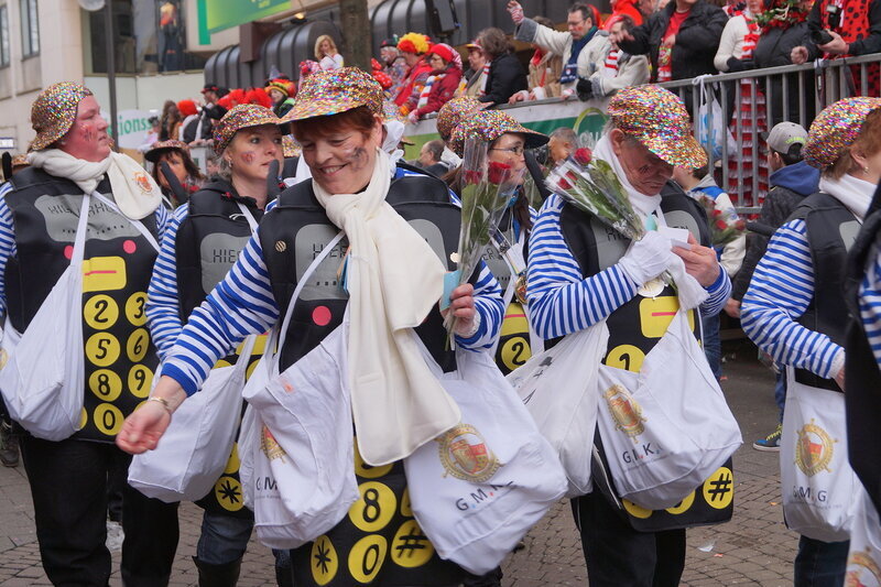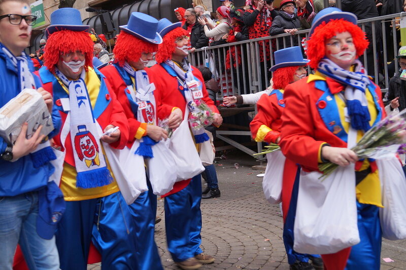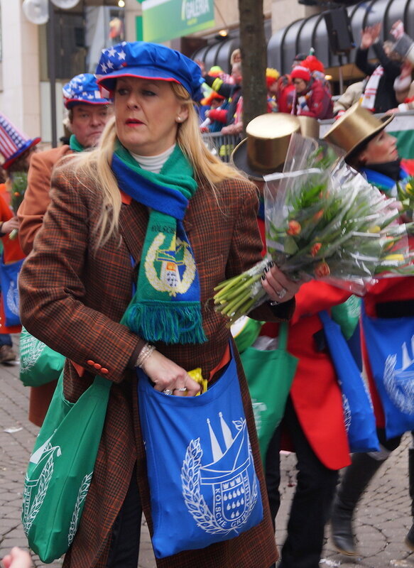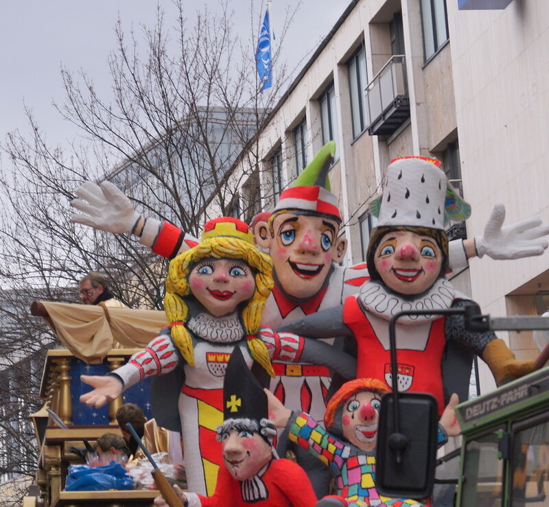Скажу сразу, Кёльн я почти не видела. Уже ранним утром большая часть центра была перекрыта, а собор, к великому моему сожалению, вовсе отгородился от карнавальной вакханалии закрытыми дверями. Поэтому фото города не будет, если есть у кого-то, попрошу добавить. У меня же будут карнавальные персонажи:) Карнавал традиционно проводится в Розовый понедельник и представляет собой шествие, проходящее следующим образом: впереди идёт человек с табличкой, на которой название общины и год, с которого она участвует в карнавалах. На некоторых табличкой есть 1800-ые годы, т.е это старейшие участники с самого начала проведения (1823 г), они идут первыми. В составе общины проходят музыканты, участники в карнавальных костюмах, часто с эмблема общины, иногда едут конные участники или повозки. На них часто большие куклы или прочее оформление на злободневные политические, спортивные, общественные сюжеты. Традиционными персонажами карнавала считаются Принц, Крестьянин, Дева, Епископ, их модно увидеть часто в разных вариациях. Шествие сопровождается периодически звучащим лозунгом: "Кёлле аллаф!" (примерное згачение - "Да здравствует Кёльн!") Какого-то чёткого принципа объединения в общины нет. Если изначально это были, как правило, соседи по месту жительства или ремесленные артели, то со временем соседи разъехались по разным районам города, но потомственное членство в общине-то осталось! Общин много. Мы простояли около трех часов, мимо нас всё шли и шли, окончания так и не дождались, отправились на поиски воды/перекуса. Зрители тоже все принаряженные, кто-то в полноценных костюмах, кто-то с лидельными яркими элементами - шарфами, шляпами и пр. Совсем не украшенным быть не рекомендуется, добрые кёльнцы помогут украситься, высыпав или брызганув какой-нибудь краски, конфетти и прочего. А ещё зрители приходят с большими сумками и зонтами. Потому что главная прелесть карнавала - это охота за сладостями, которые буквально тоннами разбрасывать участники во время шествия. Догадались, зачем нужен зонт?:) нет, не прятаться от конфет, а ловить их в перевёрнутый раскрытый зонтик:)) от этих зонтов, правда, приходится уворачиваться, дабы не получить по физиономии/фотоаппарату, потому что кёльнцы участвуют в ловле конфет очень рьяно от мала до велика, и особых привилегий для детей я не заметила. А ещё меня покорили лошадки! Такие красавицы вышагивали в клёшах! И сумки размером с ведро видите у них? Это конфеты:) в паузах в движении туда ещё из мешков, что на повозках везут, досыпают. Иногда вместе с конфетами раздают и цветы: