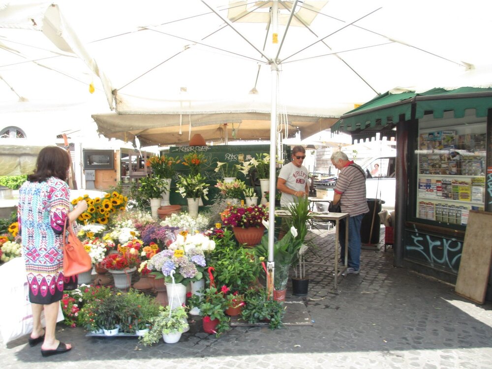 На фотографии памятник Джордано Бруно на Площади цветов и цветочного рынка из июля 2013. На постаменте написано - "Джордано Бруно - от столетия, которое он предвидел, на том месте, где был зажжен костёр". В 2000 году в год 400 летия гибели Бруно, Глава Католической Церкви отказался (!) признать что инквизиция поступила не правильно, тем самым оправдывая её действия. Первая фотография цветов это фотография Светланы, а следующие мои. Обратите внимание на цены: по-моему они существенно подросли. А вот фотографий продуктов у меня нет. Интересно было бы посмотреть, как они изменились за десять лет. И помню свою эмоцию: мне очень не понравилось, что возле памятника такому человеку работает рынок.