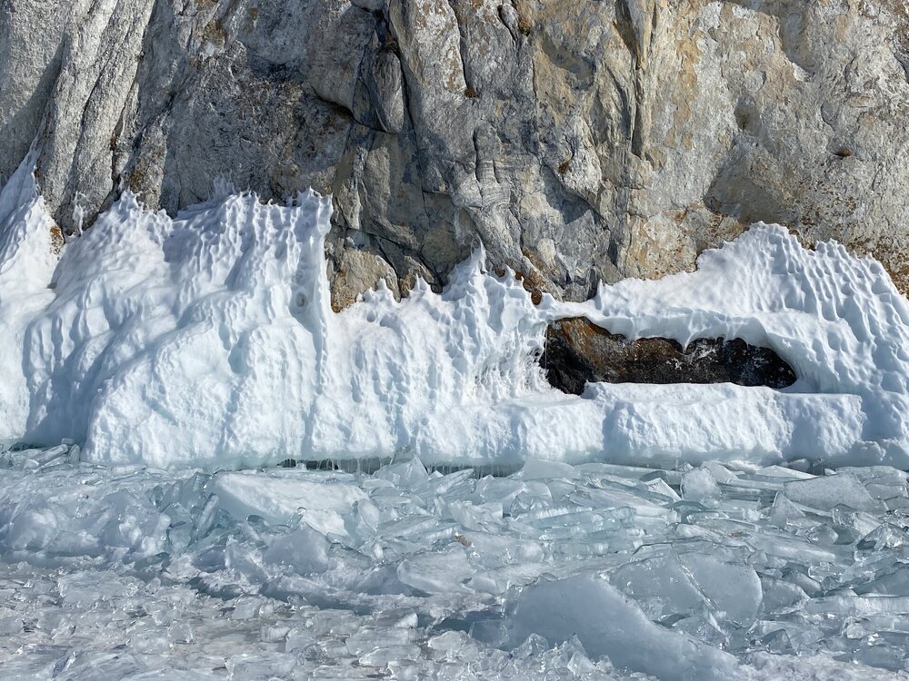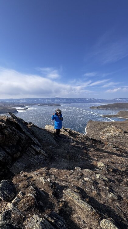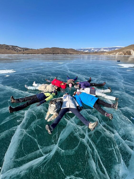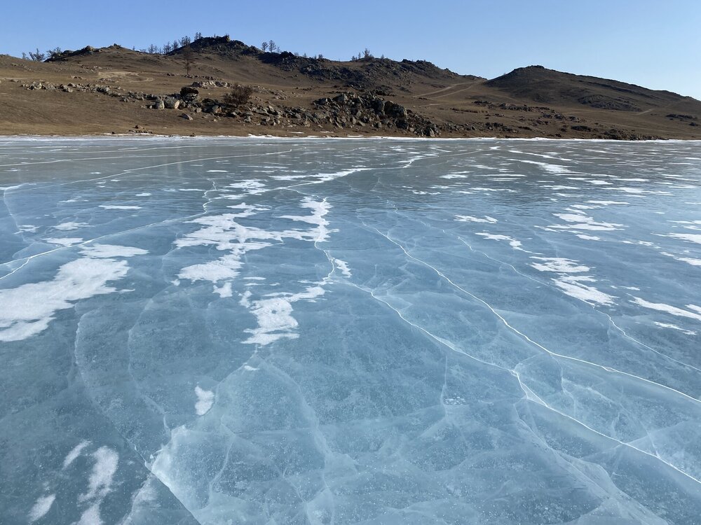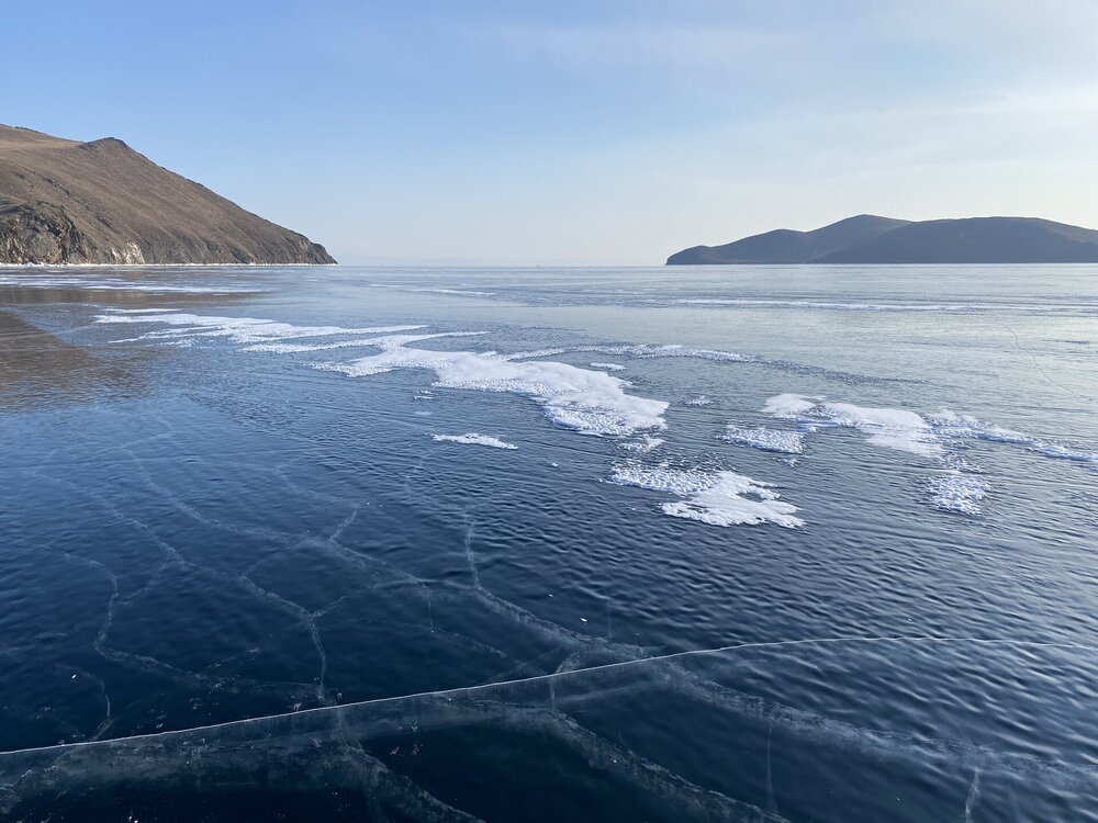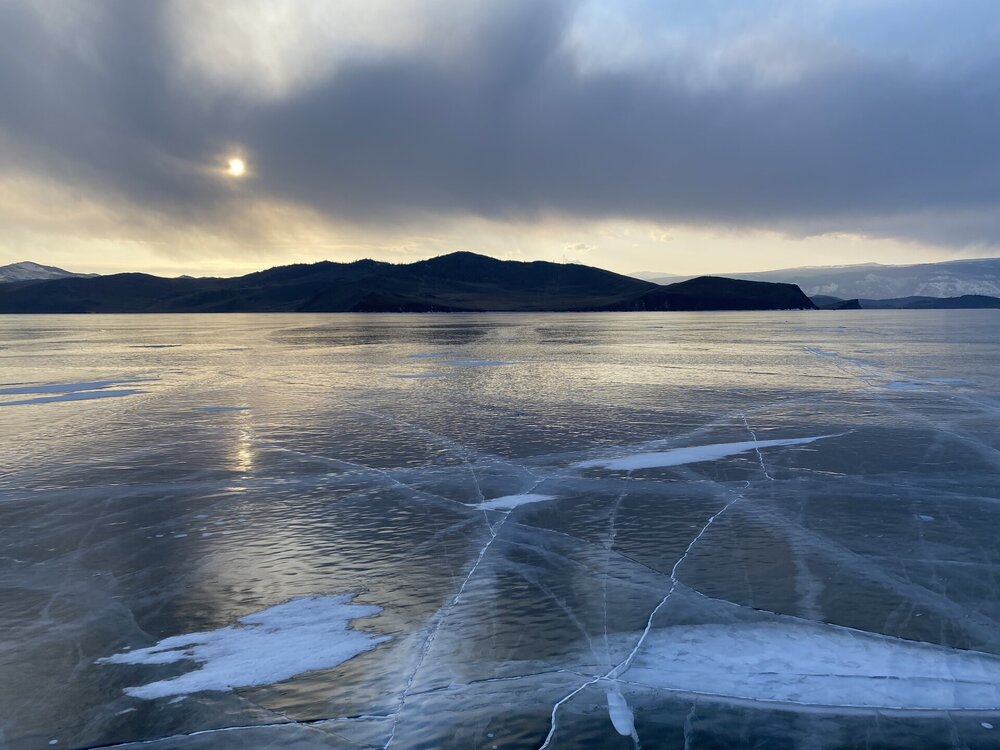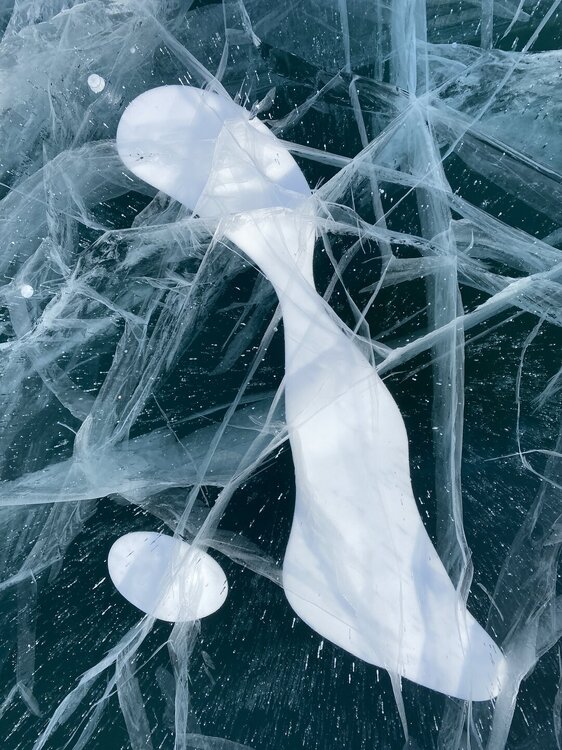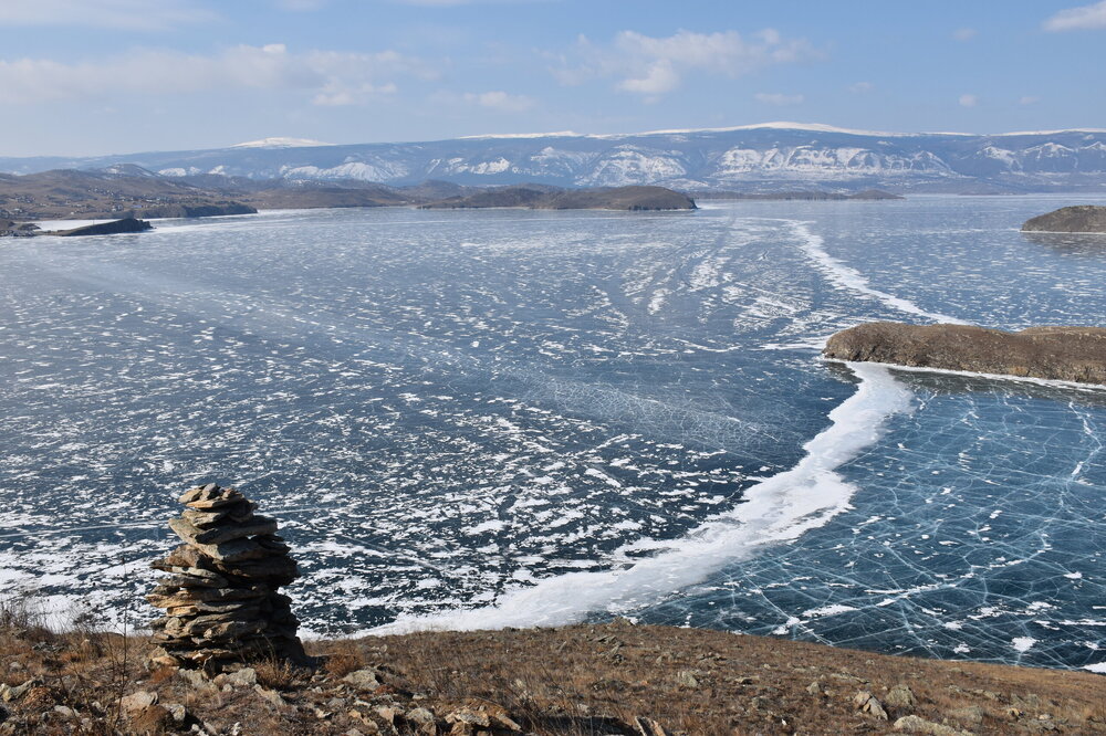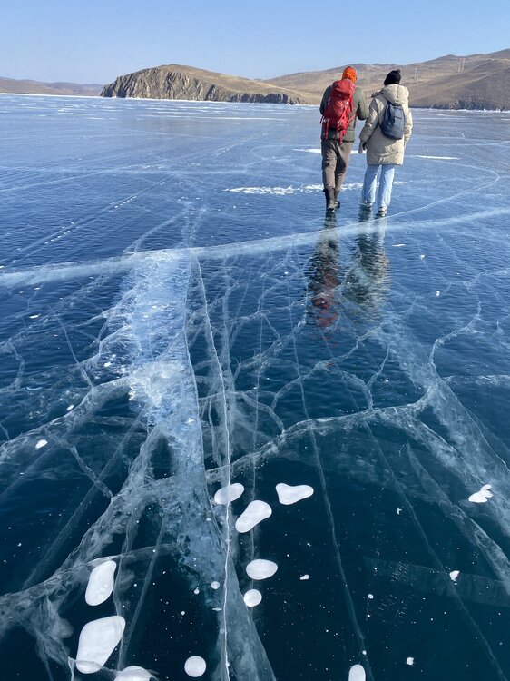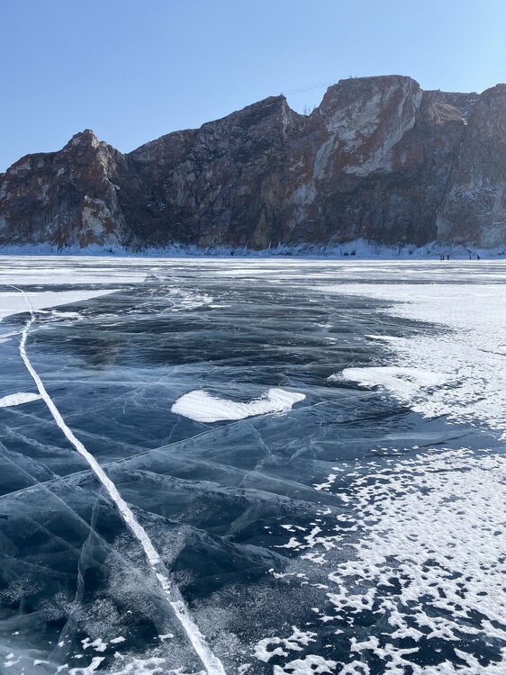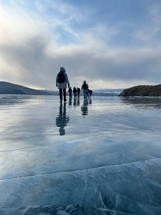 День 4. 12.03.2025 Сегодня наш день снова посвящен Льду! Вчерашний ветер Сарма сдул со льда снег. И если в первый выход было много снежных участков, то сейчас – перед нами почти идеальное зеркальное полотно! Хотя снежные участки для первого выхода – это больше плюс. Они помогали мне не скользить и побороть свой страх. В программе - поход на Мыс Уншуй острова Ольхон, Большое море. Гуляем по новым, весьма живописным окрестностям, а также поднимемся на скалу, что расположена над мысом Уншуй – с её вершины будет очередной, потрясающий вид на ледовую гладь Байкала. Активная часть треккинга: 20,1 км пешком, перепад высот 450-500 м, продолжительность похода 6-7 часов. В этом году лед образовался поздно, он тоньше и больше пропарин, поэтому в Большое море мы не выходим. Но вечером мы взяли дополнительную экскурсию на хивусе, который с легкостью вывез нас на большую глубину. Лед там отличается от Малого моря. Идем мы по проливу Ольхонские ворота. Это небольшой по ширине пролив, разделяющий материк и остров Ольхон. С одной стороны, он уходит в Малое море, с другой – в основную часть Байкала. На бурятском пролив называется Аман, что в переводе означает «рот» или «зёв». Иногда ещё можно встретить старое название – Ольхонский зунд. Длина пролива составляет 8,3 километра – это расстояние от мысов Улан и Кобылья голова до выхода в Большое море Байкала. Ширина наиболее узкого участка Ольхонских ворот – 1,2 километра. Именно на этом отрезке и находится паромная переправа на Ольхон. Средняя глубина пролива составляет 30-40 метров, а у южного входа, в окрестностях мысов Уншуй и Крест, она может достигать 100 метров. Течение здесь не такое, как на остальном Байкале. С северо-западной стороны находится Сарминское ущелье, откуда буйными порывами вырывается сильнейший одноименный ветер. Поэтому вода здесь находится в непрерывном движении, а волны порой могут достигать 5 метров высотой. В 2005 году на дне вдоль пролива Аман был проложен высоковольтный кабель, по которому на остров Ольхон поступает электричество. Ольхонские ворота – необычайно красивое и опасное место. Берега здесь круты и обрывисты, а вокруг них постоянно гоняет ветер и бьются волны. Зимой прибрежные скалы покрываются льдом и превращаются действительно нечто, похожее на сказочные ворота. Не удивительно, что туристы из года в год делают на Ольхонских воротах памятные, красочные фото. На побережье пролива Аман много узких заливов и небольших бухточек. Некоторые из бухт покрупнее – длиной 3-4 километра, но большинство все же совсем маленькие. На материковой части стоит посетить такие бухты, как: Тутай; Куркутская; Базарная. Со стороны Ольхона наибольший интерес представляют заливы Хул и Загли. Они закрыты от ветра и прекрасно подходит для стоянки судов в плохую погоду. Сегодня я выискиваю на льду необычные фигуры.