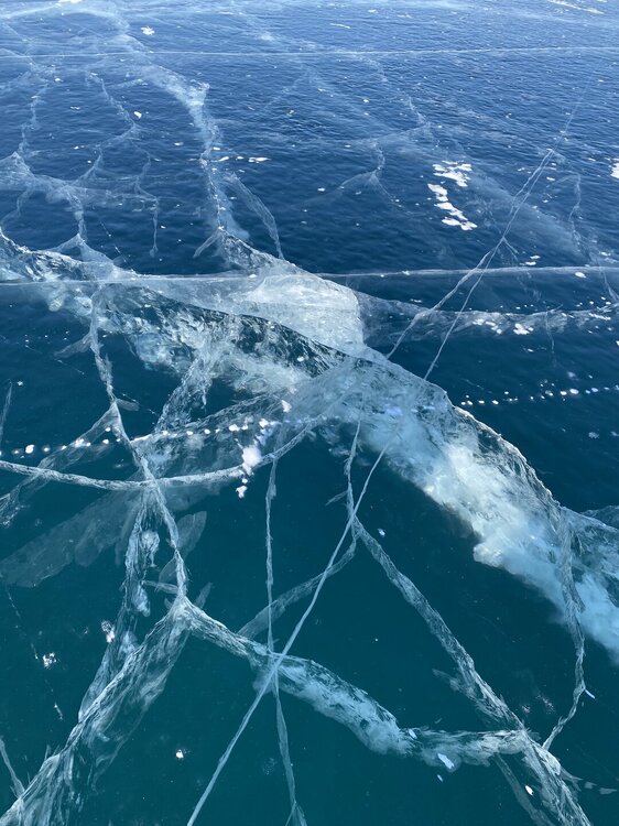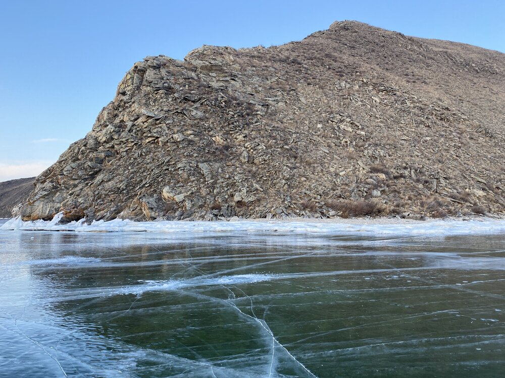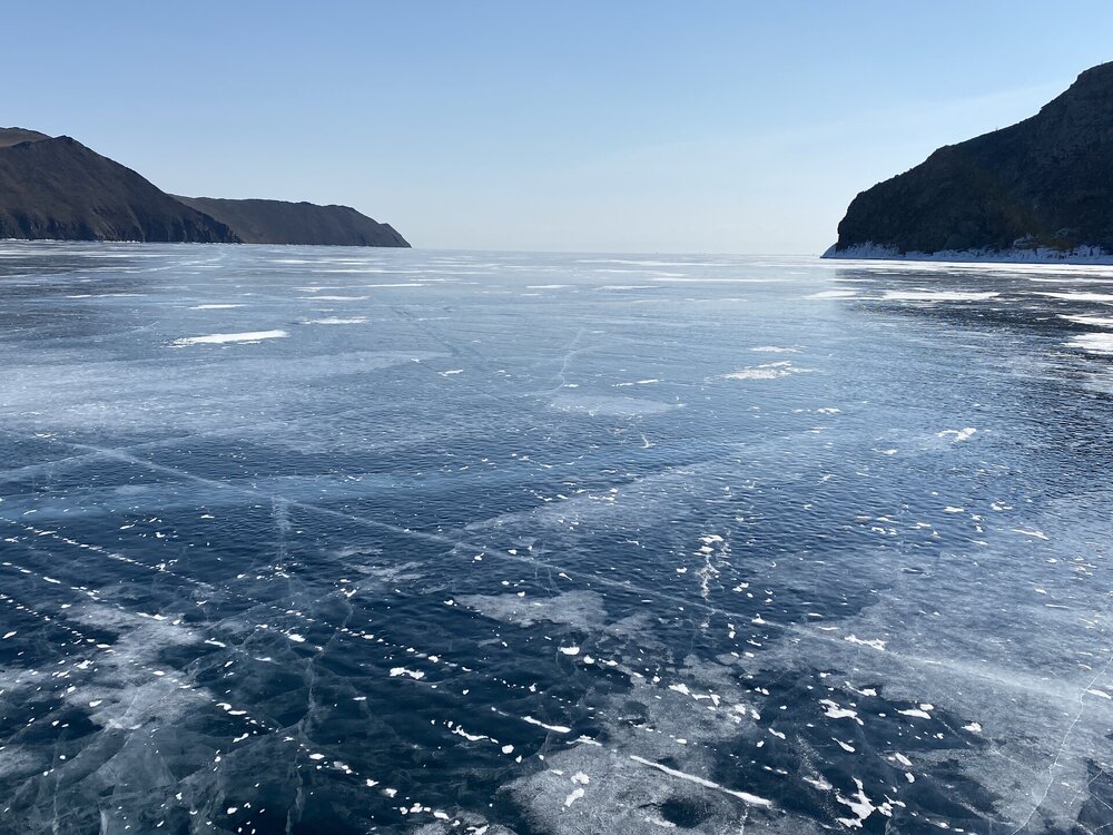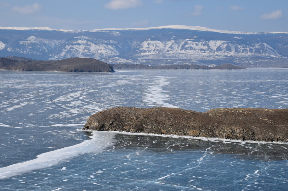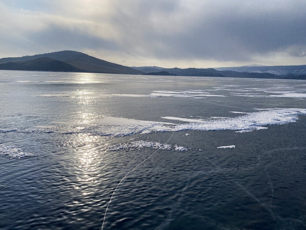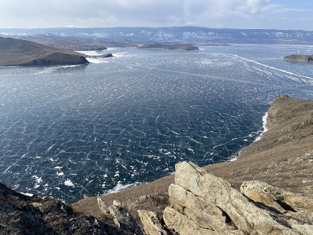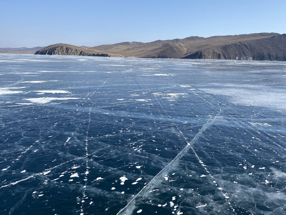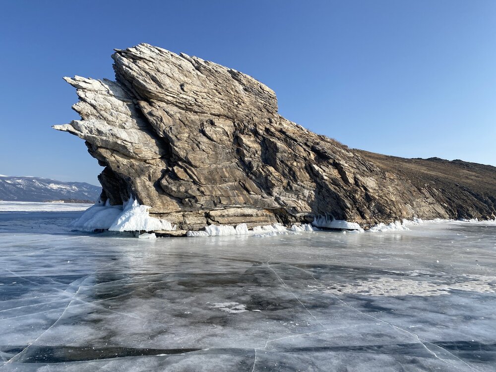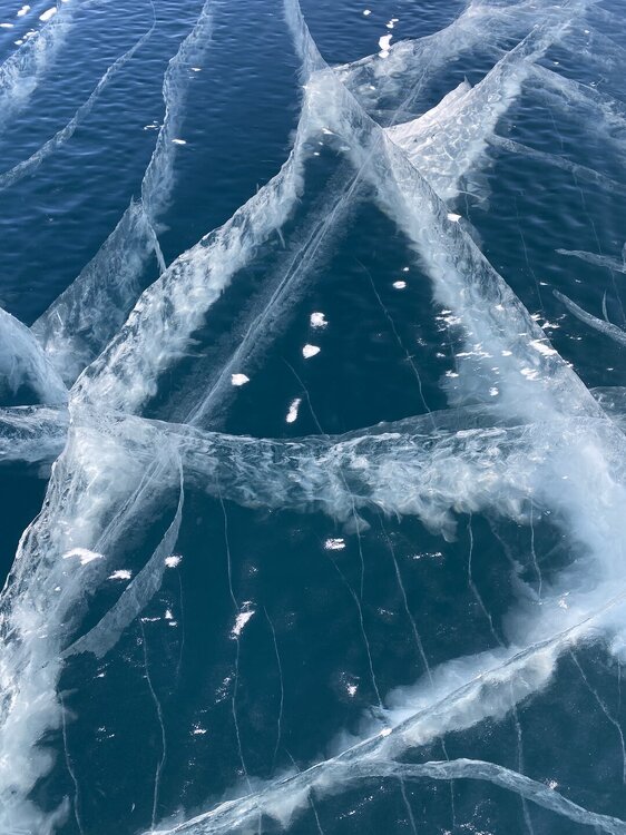 День 4. 12.03.2025 Сегодня наш день снова посвящен Льду! Вчерашний ветер Сарма сдул со льда снег. И если в первый выход было много снежных участков, то сейчас – перед нами почти идеальное зеркальное полотно! Хотя снежные участки для первого выхода – это больше плюс. Они помогали мне не скользить и побороть свой страх. В программе - поход на Мыс Уншуй острова Ольхон, Большое море. Гуляем по новым, весьма живописным окрестностям, а также поднимемся на скалу, что расположена над мысом Уншуй – с её вершины будет очередной, потрясающий вид на ледовую гладь Байкала. Активная часть треккинга: 20,1 км пешком, перепад высот 450-500 м, продолжительность похода 6-7 часов. В этом году лед образовался поздно, он тоньше и больше пропарин, поэтому в Большое море мы не выходим. Но вечером мы взяли дополнительную экскурсию на хивусе, который с легкостью вывез нас на большую глубину. Лед там отличается от Малого моря. Идем мы по проливу Ольхонские ворота. Это небольшой по ширине пролив, разделяющий материк и остров Ольхон. С одной стороны, он уходит в Малое море, с другой – в основную часть Байкала. На бурятском пролив называется Аман, что в переводе означает «рот» или «зёв». Иногда ещё можно встретить старое название – Ольхонский зунд. Длина пролива составляет 8,3 километра – это расстояние от мысов Улан и Кобылья голова до выхода в Большое море Байкала. Ширина наиболее узкого участка Ольхонских ворот – 1,2 километра. Именно на этом отрезке и находится паромная переправа на Ольхон. Средняя глубина пролива составляет 30-40 метров, а у южного входа, в окрестностях мысов Уншуй и Крест, она может достигать 100 метров. Течение здесь не такое, как на остальном Байкале. С северо-западной стороны находится Сарминское ущелье, откуда буйными порывами вырывается сильнейший одноименный ветер. Поэтому вода здесь находится в непрерывном движении, а волны порой могут достигать 5 метров высотой. В 2005 году на дне вдоль пролива Аман был проложен высоковольтный кабель, по которому на остров Ольхон поступает электричество. Ольхонские ворота – необычайно красивое и опасное место. Берега здесь круты и обрывисты, а вокруг них постоянно гоняет ветер и бьются волны. Зимой прибрежные скалы покрываются льдом и превращаются действительно нечто, похожее на сказочные ворота. Не удивительно, что туристы из года в год делают на Ольхонских воротах памятные, красочные фото. На побережье пролива Аман много узких заливов и небольших бухточек. Некоторые из бухт покрупнее – длиной 3-4 километра, но большинство все же совсем маленькие. На материковой части стоит посетить такие бухты, как: Тутай; Куркутская; Базарная. Со стороны Ольхона наибольший интерес представляют заливы Хул и Загли. Они закрыты от ветра и прекрасно подходит для стоянки судов в плохую погоду. Сегодня я выискиваю на льду необычные фигуры.