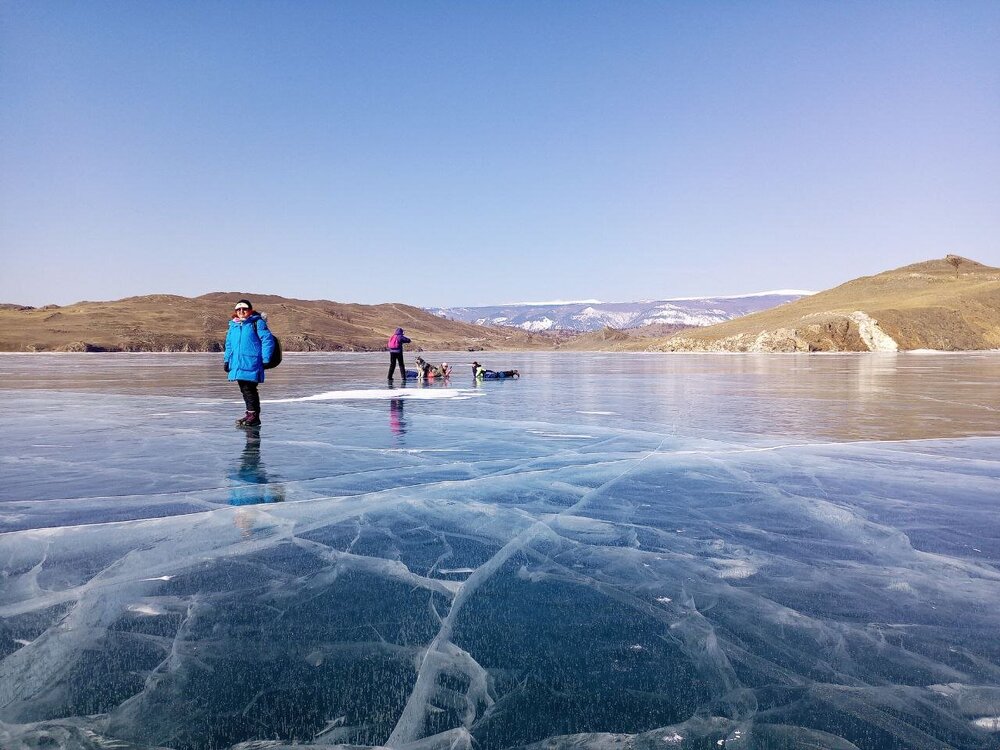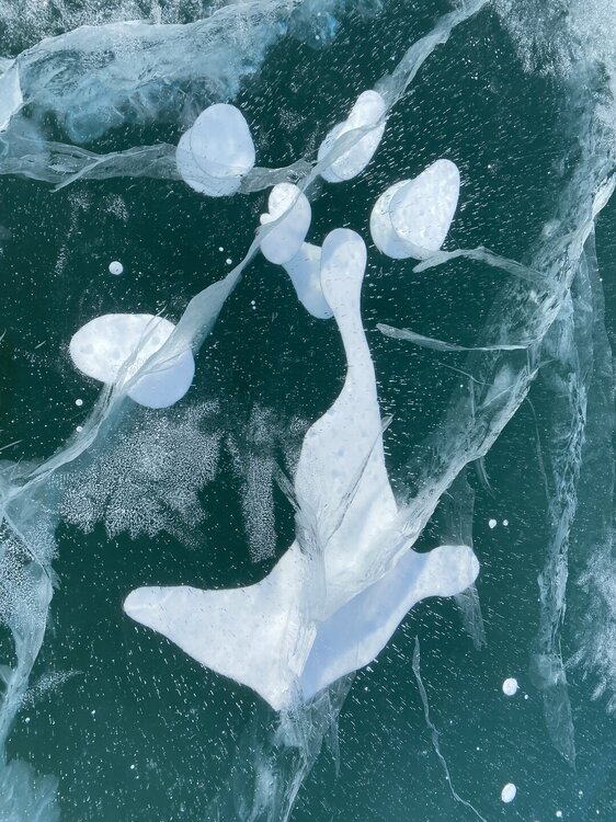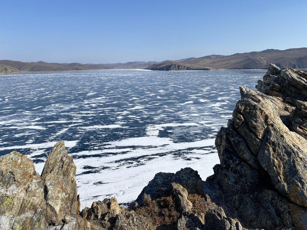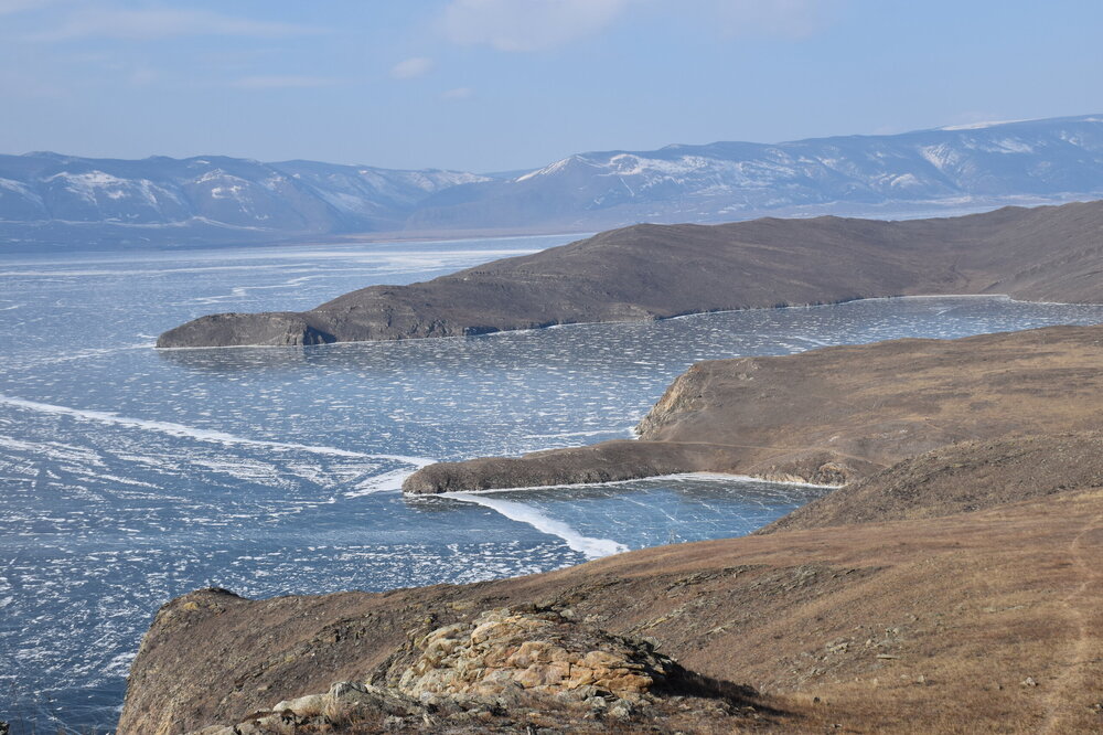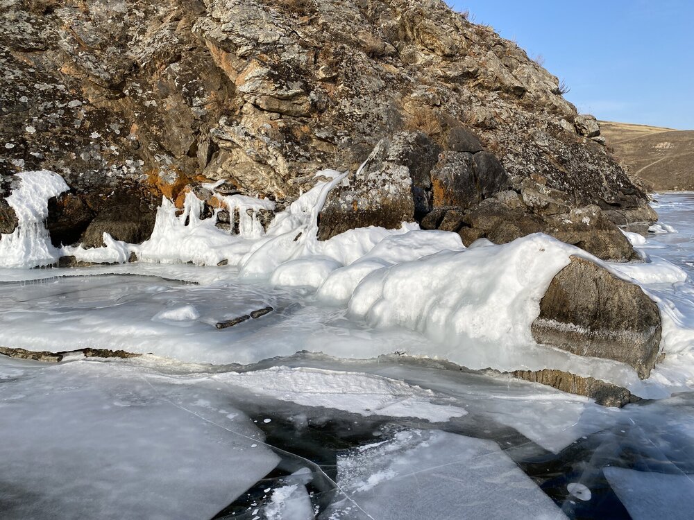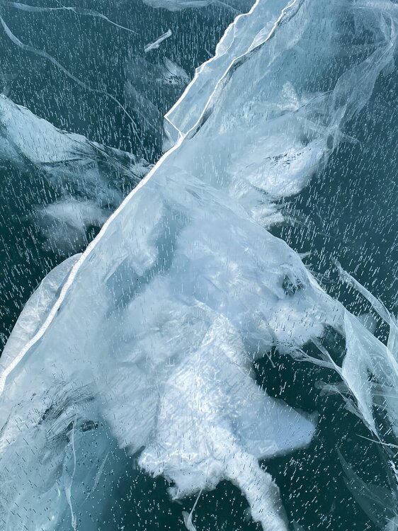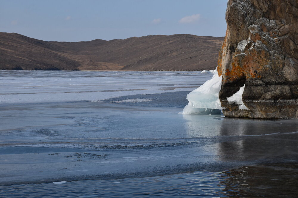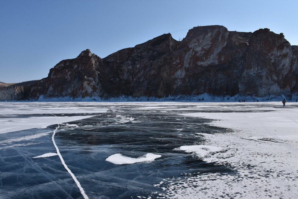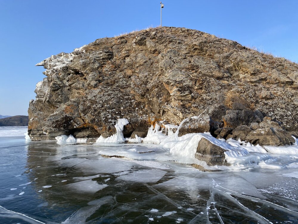 День 4. 12.03.2025 Сегодня наш день снова посвящен Льду! Вчерашний ветер Сарма сдул со льда снег. И если в первый выход было много снежных участков, то сейчас – перед нами почти идеальное зеркальное полотно! Хотя снежные участки для первого выхода – это больше плюс. Они помогали мне не скользить и побороть свой страх. В программе - поход на Мыс Уншуй острова Ольхон, Большое море. Гуляем по новым, весьма живописным окрестностям, а также поднимемся на скалу, что расположена над мысом Уншуй – с её вершины будет очередной, потрясающий вид на ледовую гладь Байкала. Активная часть треккинга: 20,1 км пешком, перепад высот 450-500 м, продолжительность похода 6-7 часов. В этом году лед образовался поздно, он тоньше и больше пропарин, поэтому в Большое море мы не выходим. Но вечером мы взяли дополнительную экскурсию на хивусе, который с легкостью вывез нас на большую глубину. Лед там отличается от Малого моря. Идем мы по проливу Ольхонские ворота. Это небольшой по ширине пролив, разделяющий материк и остров Ольхон. С одной стороны, он уходит в Малое море, с другой – в основную часть Байкала. На бурятском пролив называется Аман, что в переводе означает «рот» или «зёв». Иногда ещё можно встретить старое название – Ольхонский зунд. Длина пролива составляет 8,3 километра – это расстояние от мысов Улан и Кобылья голова до выхода в Большое море Байкала. Ширина наиболее узкого участка Ольхонских ворот – 1,2 километра. Именно на этом отрезке и находится паромная переправа на Ольхон. Средняя глубина пролива составляет 30-40 метров, а у южного входа, в окрестностях мысов Уншуй и Крест, она может достигать 100 метров. Течение здесь не такое, как на остальном Байкале. С северо-западной стороны находится Сарминское ущелье, откуда буйными порывами вырывается сильнейший одноименный ветер. Поэтому вода здесь находится в непрерывном движении, а волны порой могут достигать 5 метров высотой. В 2005 году на дне вдоль пролива Аман был проложен высоковольтный кабель, по которому на остров Ольхон поступает электричество. Ольхонские ворота – необычайно красивое и опасное место. Берега здесь круты и обрывисты, а вокруг них постоянно гоняет ветер и бьются волны. Зимой прибрежные скалы покрываются льдом и превращаются действительно нечто, похожее на сказочные ворота. Не удивительно, что туристы из года в год делают на Ольхонских воротах памятные, красочные фото. На побережье пролива Аман много узких заливов и небольших бухточек. Некоторые из бухт покрупнее – длиной 3-4 километра, но большинство все же совсем маленькие. На материковой части стоит посетить такие бухты, как: Тутай; Куркутская; Базарная. Со стороны Ольхона наибольший интерес представляют заливы Хул и Загли. Они закрыты от ветра и прекрасно подходит для стоянки судов в плохую погоду. Сегодня я выискиваю на льду необычные фигуры.