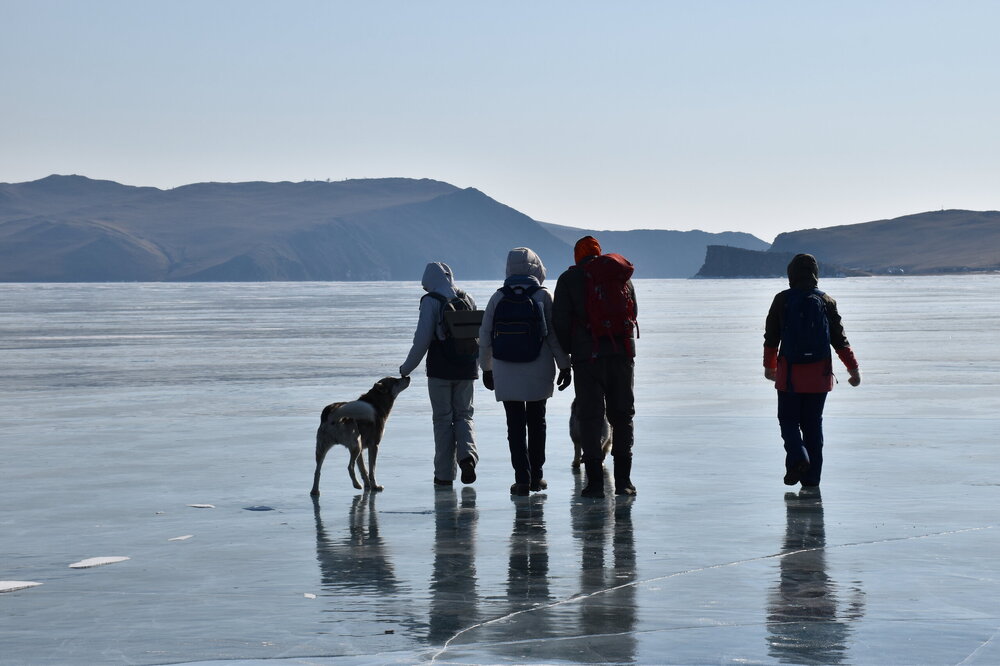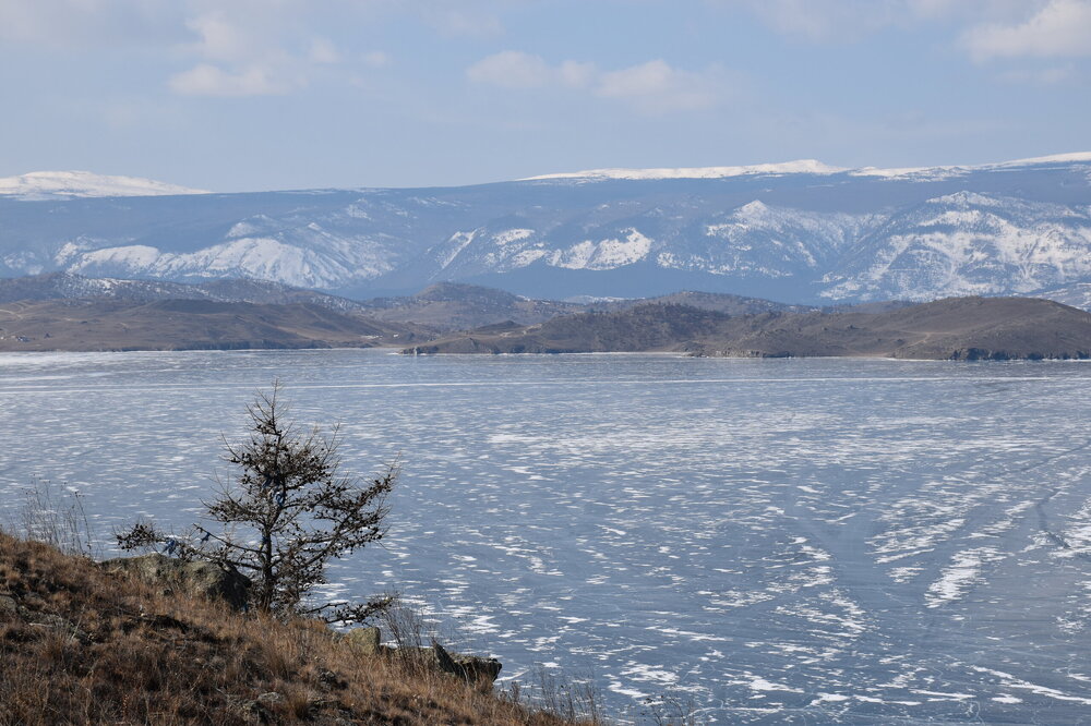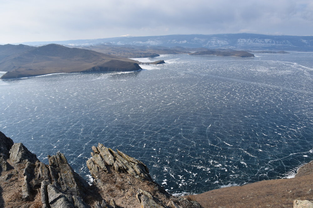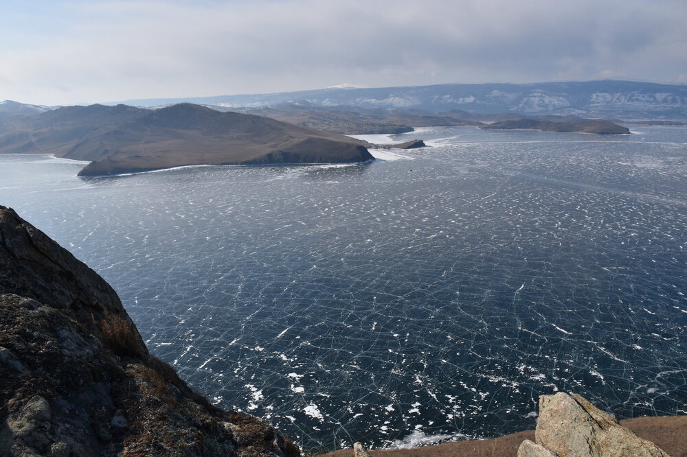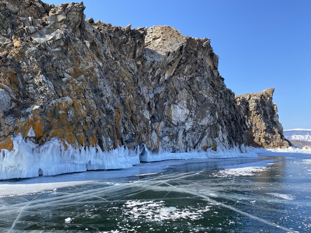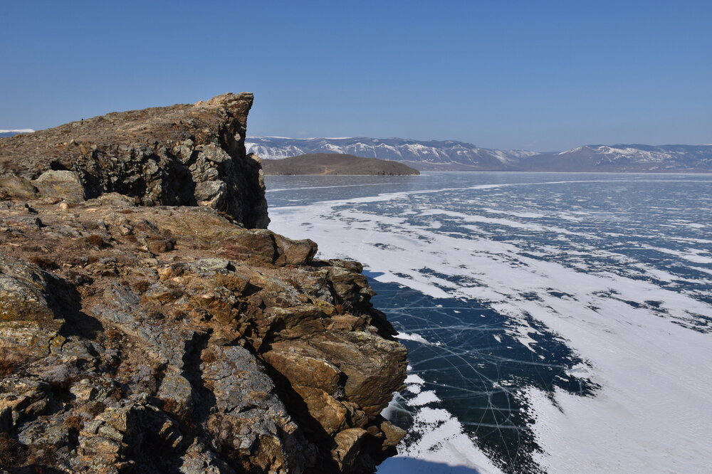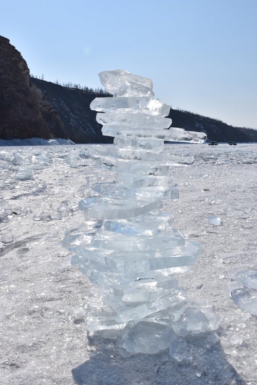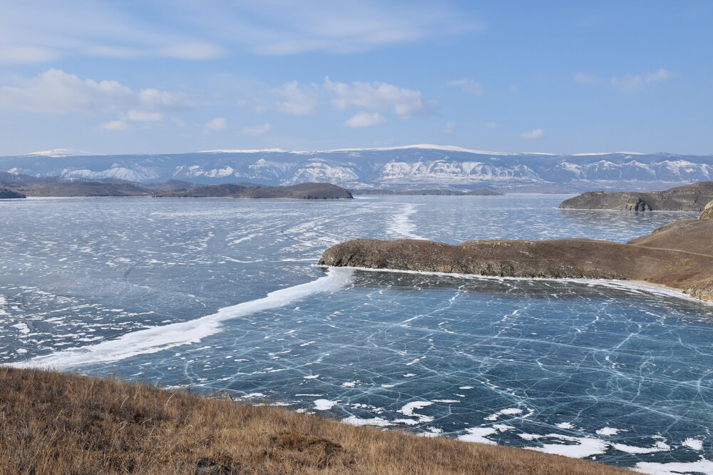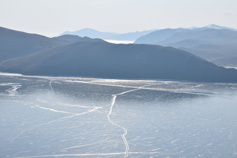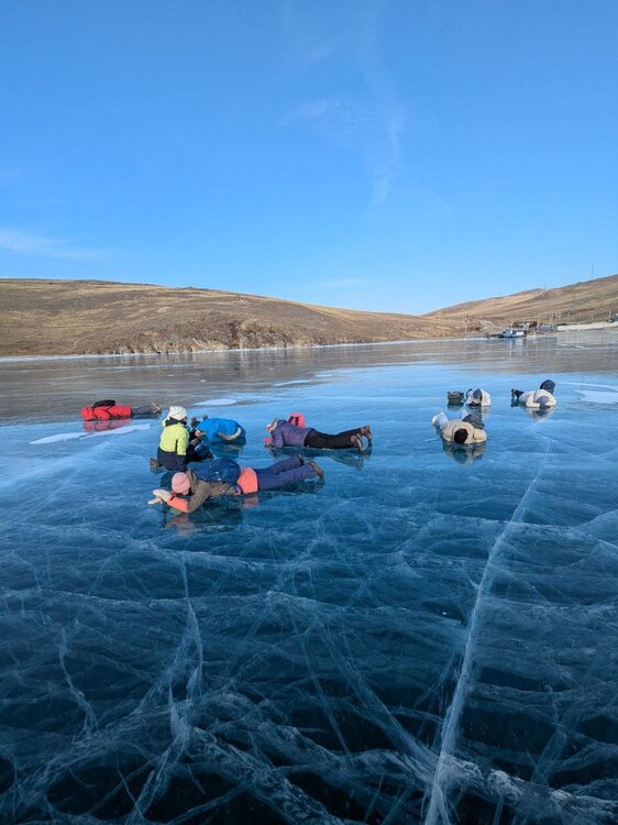 День 4. 12.03.2025 Сегодня наш день снова посвящен Льду! Вчерашний ветер Сарма сдул со льда снег. И если в первый выход было много снежных участков, то сейчас – перед нами почти идеальное зеркальное полотно! Хотя снежные участки для первого выхода – это больше плюс. Они помогали мне не скользить и побороть свой страх. В программе - поход на Мыс Уншуй острова Ольхон, Большое море. Гуляем по новым, весьма живописным окрестностям, а также поднимемся на скалу, что расположена над мысом Уншуй – с её вершины будет очередной, потрясающий вид на ледовую гладь Байкала. Активная часть треккинга: 20,1 км пешком, перепад высот 450-500 м, продолжительность похода 6-7 часов. В этом году лед образовался поздно, он тоньше и больше пропарин, поэтому в Большое море мы не выходим. Но вечером мы взяли дополнительную экскурсию на хивусе, который с легкостью вывез нас на большую глубину. Лед там отличается от Малого моря. Идем мы по проливу Ольхонские ворота. Это небольшой по ширине пролив, разделяющий материк и остров Ольхон. С одной стороны, он уходит в Малое море, с другой – в основную часть Байкала. На бурятском пролив называется Аман, что в переводе означает «рот» или «зёв». Иногда ещё можно встретить старое название – Ольхонский зунд. Длина пролива составляет 8,3 километра – это расстояние от мысов Улан и Кобылья голова до выхода в Большое море Байкала. Ширина наиболее узкого участка Ольхонских ворот – 1,2 километра. Именно на этом отрезке и находится паромная переправа на Ольхон. Средняя глубина пролива составляет 30-40 метров, а у южного входа, в окрестностях мысов Уншуй и Крест, она может достигать 100 метров. Течение здесь не такое, как на остальном Байкале. С северо-западной стороны находится Сарминское ущелье, откуда буйными порывами вырывается сильнейший одноименный ветер. Поэтому вода здесь находится в непрерывном движении, а волны порой могут достигать 5 метров высотой. В 2005 году на дне вдоль пролива Аман был проложен высоковольтный кабель, по которому на остров Ольхон поступает электричество. Ольхонские ворота – необычайно красивое и опасное место. Берега здесь круты и обрывисты, а вокруг них постоянно гоняет ветер и бьются волны. Зимой прибрежные скалы покрываются льдом и превращаются действительно нечто, похожее на сказочные ворота. Не удивительно, что туристы из года в год делают на Ольхонских воротах памятные, красочные фото. На побережье пролива Аман много узких заливов и небольших бухточек. Некоторые из бухт покрупнее – длиной 3-4 километра, но большинство все же совсем маленькие. На материковой части стоит посетить такие бухты, как: Тутай; Куркутская; Базарная. Со стороны Ольхона наибольший интерес представляют заливы Хул и Загли. Они закрыты от ветра и прекрасно подходит для стоянки судов в плохую погоду. Сегодня я выискиваю на льду необычные фигуры.