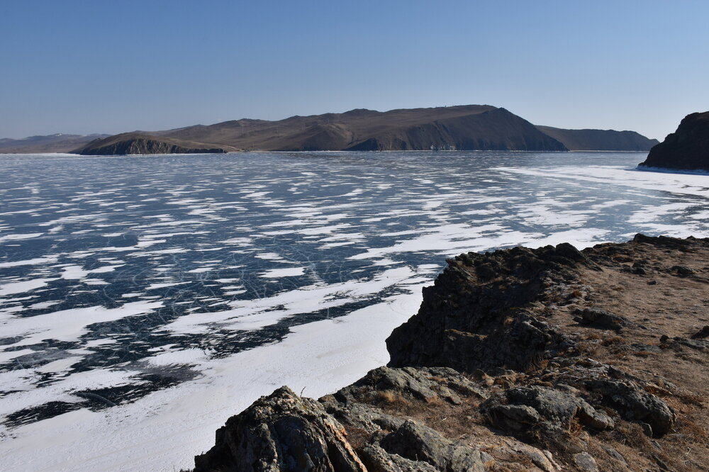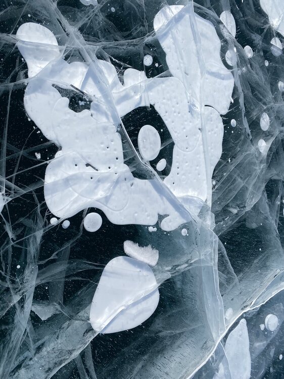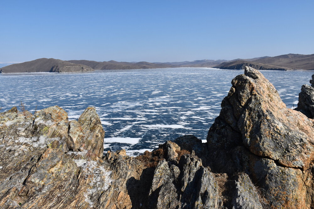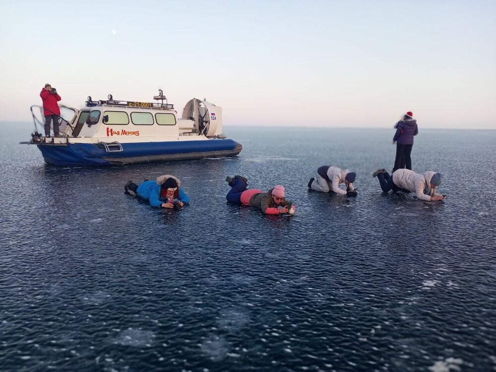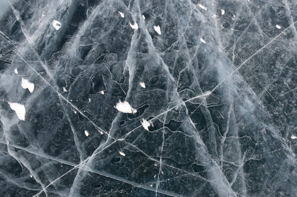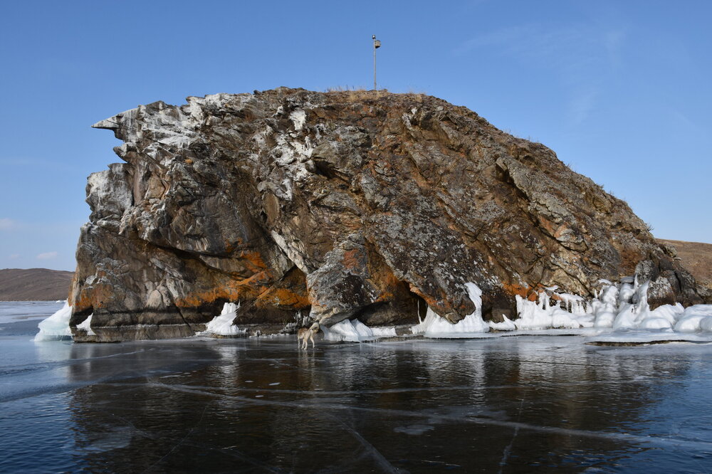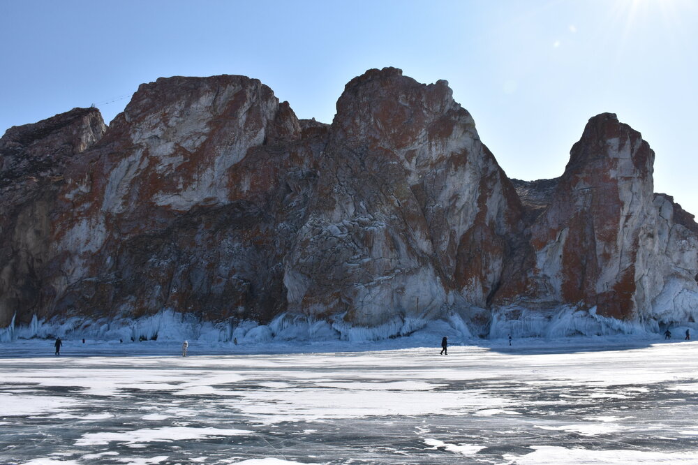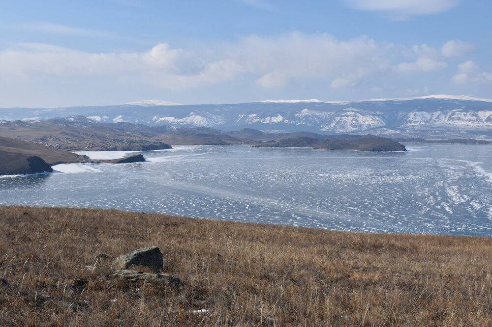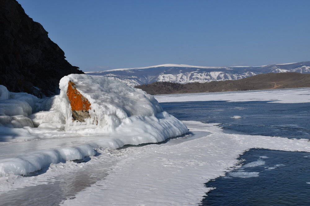 День 4. 12.03.2025 Сегодня наш день снова посвящен Льду! Вчерашний ветер Сарма сдул со льда снег. И если в первый выход было много снежных участков, то сейчас – перед нами почти идеальное зеркальное полотно! Хотя снежные участки для первого выхода – это больше плюс. Они помогали мне не скользить и побороть свой страх. В программе - поход на Мыс Уншуй острова Ольхон, Большое море. Гуляем по новым, весьма живописным окрестностям, а также поднимемся на скалу, что расположена над мысом Уншуй – с её вершины будет очередной, потрясающий вид на ледовую гладь Байкала. Активная часть треккинга: 20,1 км пешком, перепад высот 450-500 м, продолжительность похода 6-7 часов. В этом году лед образовался поздно, он тоньше и больше пропарин, поэтому в Большое море мы не выходим. Но вечером мы взяли дополнительную экскурсию на хивусе, который с легкостью вывез нас на большую глубину. Лед там отличается от Малого моря. Идем мы по проливу Ольхонские ворота. Это небольшой по ширине пролив, разделяющий материк и остров Ольхон. С одной стороны, он уходит в Малое море, с другой – в основную часть Байкала. На бурятском пролив называется Аман, что в переводе означает «рот» или «зёв». Иногда ещё можно встретить старое название – Ольхонский зунд. Длина пролива составляет 8,3 километра – это расстояние от мысов Улан и Кобылья голова до выхода в Большое море Байкала. Ширина наиболее узкого участка Ольхонских ворот – 1,2 километра. Именно на этом отрезке и находится паромная переправа на Ольхон. Средняя глубина пролива составляет 30-40 метров, а у южного входа, в окрестностях мысов Уншуй и Крест, она может достигать 100 метров. Течение здесь не такое, как на остальном Байкале. С северо-западной стороны находится Сарминское ущелье, откуда буйными порывами вырывается сильнейший одноименный ветер. Поэтому вода здесь находится в непрерывном движении, а волны порой могут достигать 5 метров высотой. В 2005 году на дне вдоль пролива Аман был проложен высоковольтный кабель, по которому на остров Ольхон поступает электричество. Ольхонские ворота – необычайно красивое и опасное место. Берега здесь круты и обрывисты, а вокруг них постоянно гоняет ветер и бьются волны. Зимой прибрежные скалы покрываются льдом и превращаются действительно нечто, похожее на сказочные ворота. Не удивительно, что туристы из года в год делают на Ольхонских воротах памятные, красочные фото. На побережье пролива Аман много узких заливов и небольших бухточек. Некоторые из бухт покрупнее – длиной 3-4 километра, но большинство все же совсем маленькие. На материковой части стоит посетить такие бухты, как: Тутай; Куркутская; Базарная. Со стороны Ольхона наибольший интерес представляют заливы Хул и Загли. Они закрыты от ветра и прекрасно подходит для стоянки судов в плохую погоду. Сегодня я выискиваю на льду необычные фигуры.