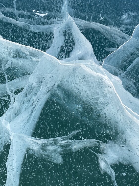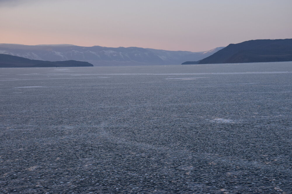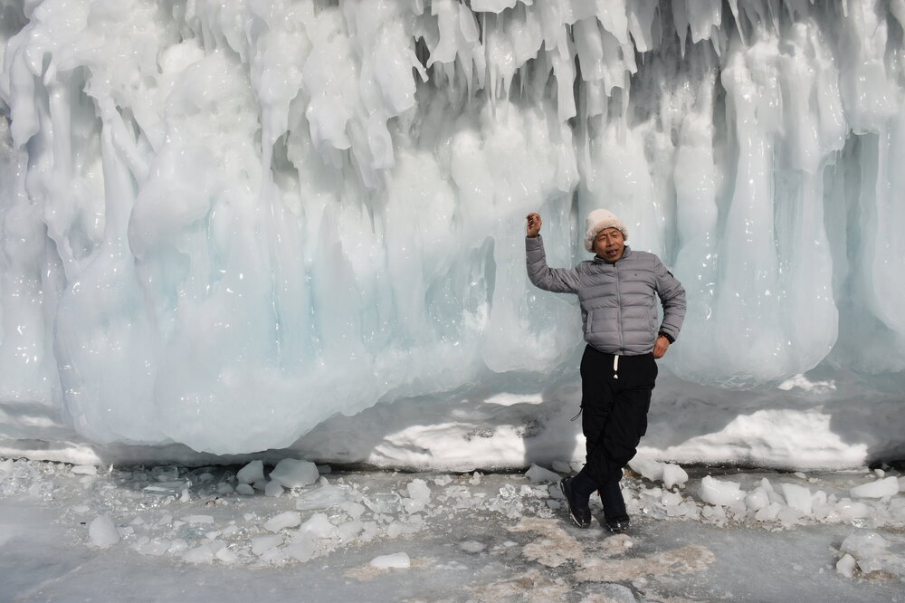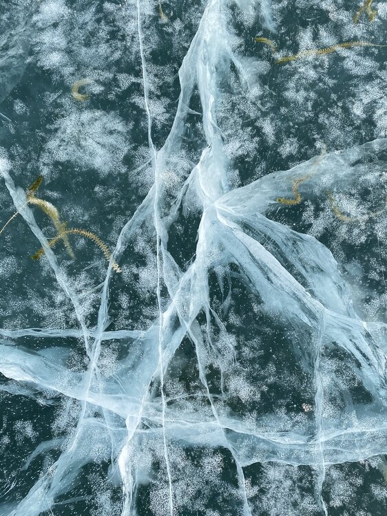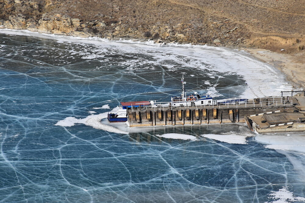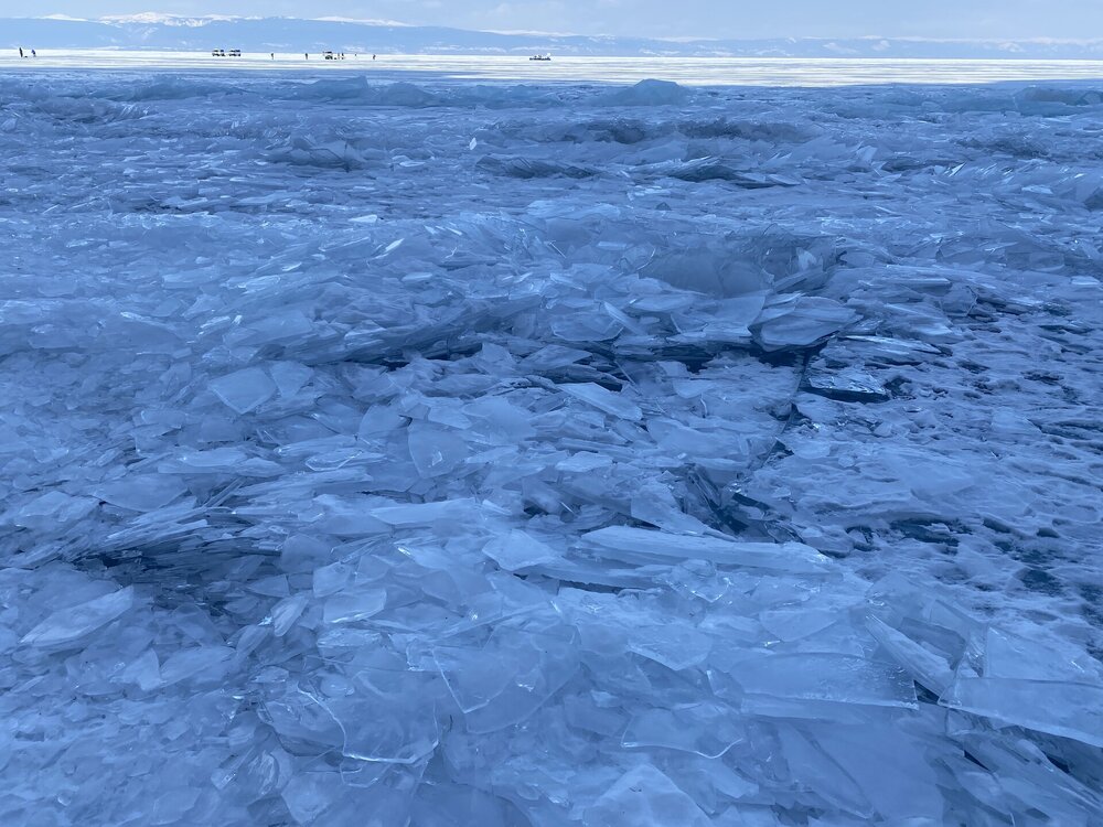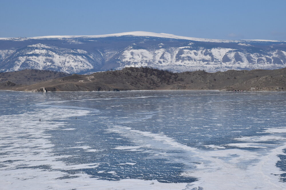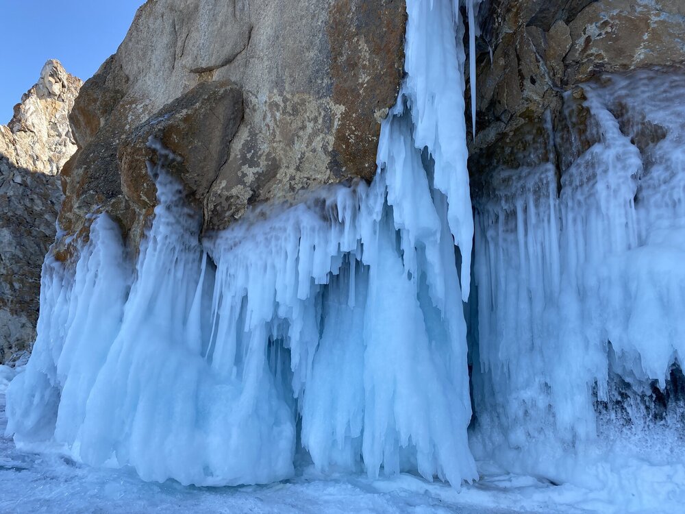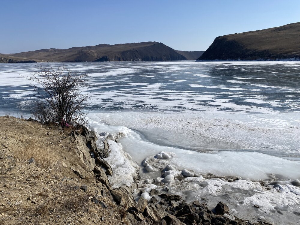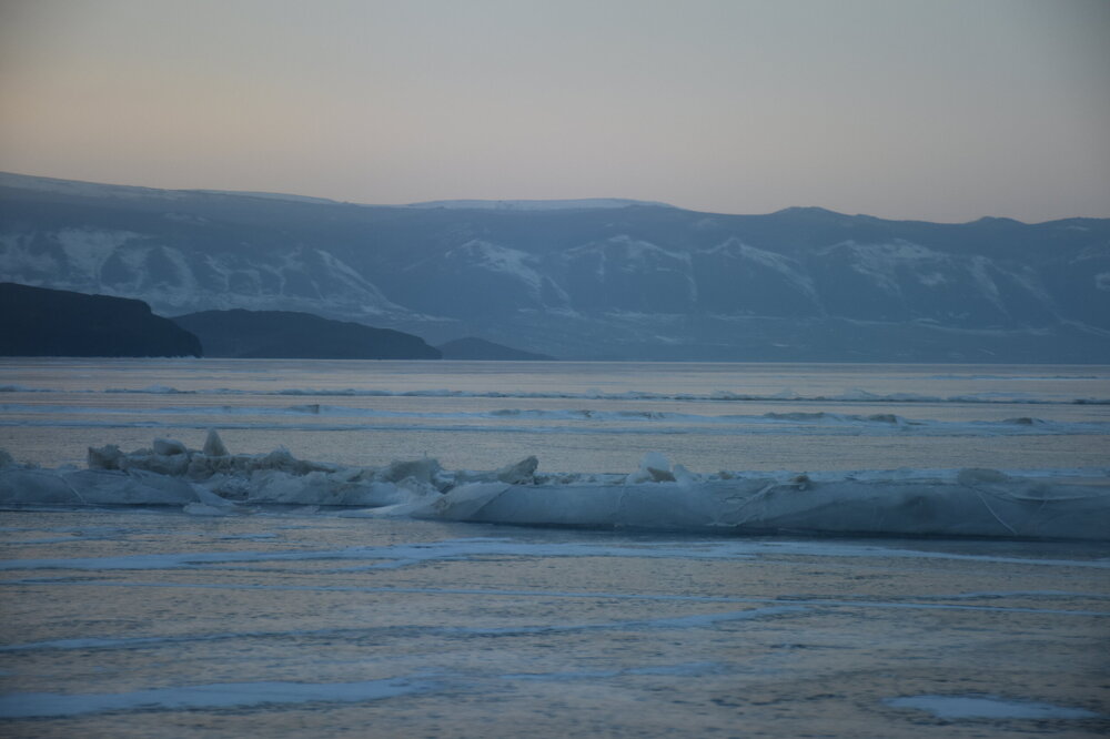 День 4. 12.03.2025 Сегодня наш день снова посвящен Льду! Вчерашний ветер Сарма сдул со льда снег. И если в первый выход было много снежных участков, то сейчас – перед нами почти идеальное зеркальное полотно! Хотя снежные участки для первого выхода – это больше плюс. Они помогали мне не скользить и побороть свой страх. В программе - поход на Мыс Уншуй острова Ольхон, Большое море. Гуляем по новым, весьма живописным окрестностям, а также поднимемся на скалу, что расположена над мысом Уншуй – с её вершины будет очередной, потрясающий вид на ледовую гладь Байкала. Активная часть треккинга: 20,1 км пешком, перепад высот 450-500 м, продолжительность похода 6-7 часов. В этом году лед образовался поздно, он тоньше и больше пропарин, поэтому в Большое море мы не выходим. Но вечером мы взяли дополнительную экскурсию на хивусе, который с легкостью вывез нас на большую глубину. Лед там отличается от Малого моря. Идем мы по проливу Ольхонские ворота. Это небольшой по ширине пролив, разделяющий материк и остров Ольхон. С одной стороны, он уходит в Малое море, с другой – в основную часть Байкала. На бурятском пролив называется Аман, что в переводе означает «рот» или «зёв». Иногда ещё можно встретить старое название – Ольхонский зунд. Длина пролива составляет 8,3 километра – это расстояние от мысов Улан и Кобылья голова до выхода в Большое море Байкала. Ширина наиболее узкого участка Ольхонских ворот – 1,2 километра. Именно на этом отрезке и находится паромная переправа на Ольхон. Средняя глубина пролива составляет 30-40 метров, а у южного входа, в окрестностях мысов Уншуй и Крест, она может достигать 100 метров. Течение здесь не такое, как на остальном Байкале. С северо-западной стороны находится Сарминское ущелье, откуда буйными порывами вырывается сильнейший одноименный ветер. Поэтому вода здесь находится в непрерывном движении, а волны порой могут достигать 5 метров высотой. В 2005 году на дне вдоль пролива Аман был проложен высоковольтный кабель, по которому на остров Ольхон поступает электричество. Ольхонские ворота – необычайно красивое и опасное место. Берега здесь круты и обрывисты, а вокруг них постоянно гоняет ветер и бьются волны. Зимой прибрежные скалы покрываются льдом и превращаются действительно нечто, похожее на сказочные ворота. Не удивительно, что туристы из года в год делают на Ольхонских воротах памятные, красочные фото. На побережье пролива Аман много узких заливов и небольших бухточек. Некоторые из бухт покрупнее – длиной 3-4 километра, но большинство все же совсем маленькие. На материковой части стоит посетить такие бухты, как: Тутай; Куркутская; Базарная. Со стороны Ольхона наибольший интерес представляют заливы Хул и Загли. Они закрыты от ветра и прекрасно подходит для стоянки судов в плохую погоду. Сегодня я выискиваю на льду необычные фигуры.