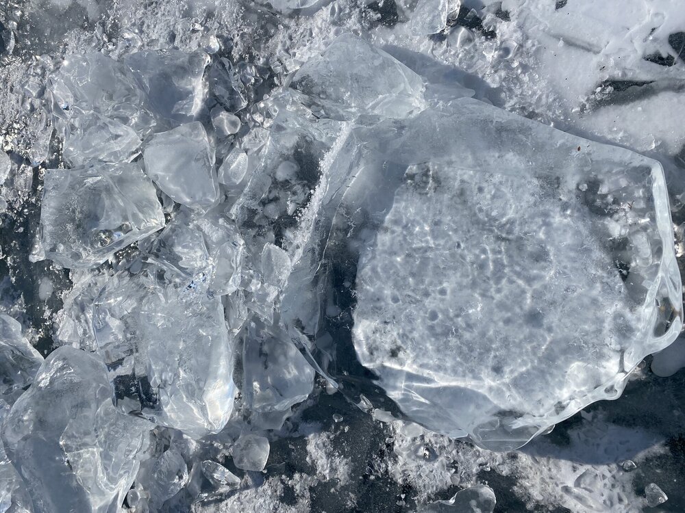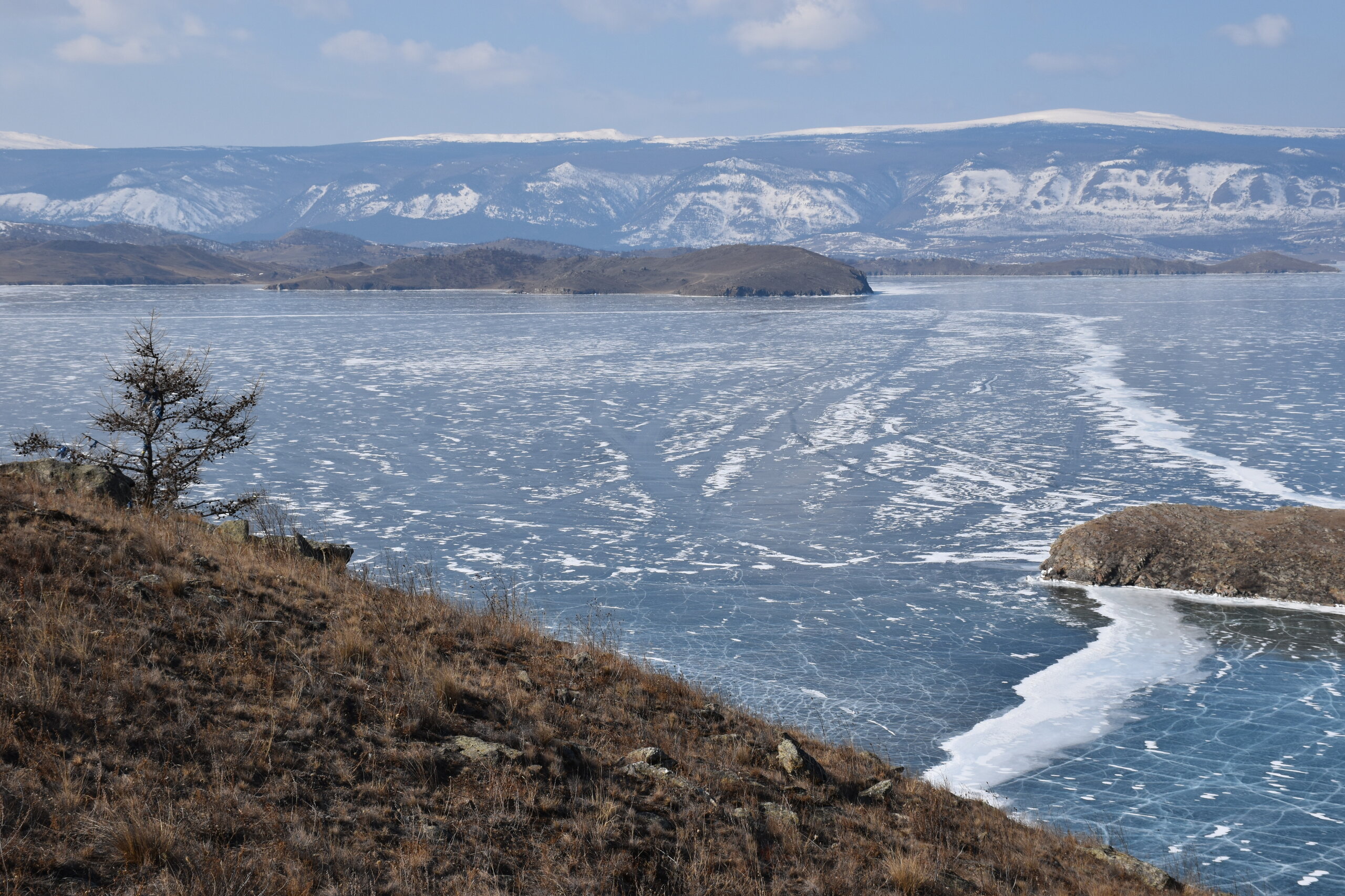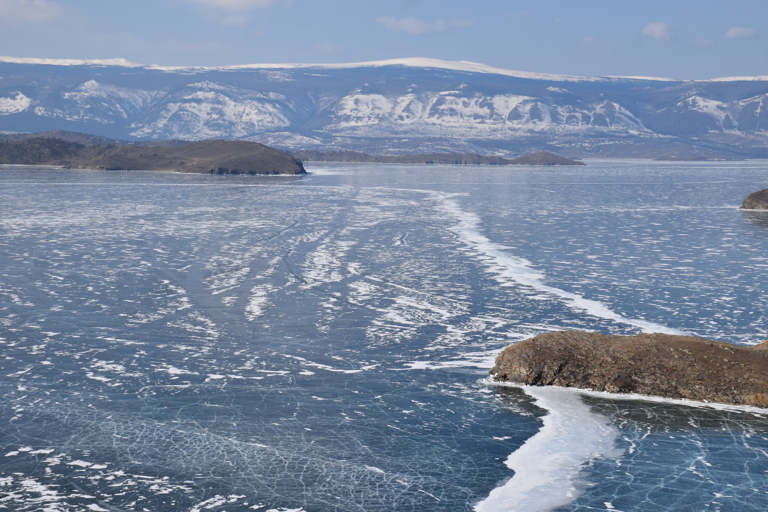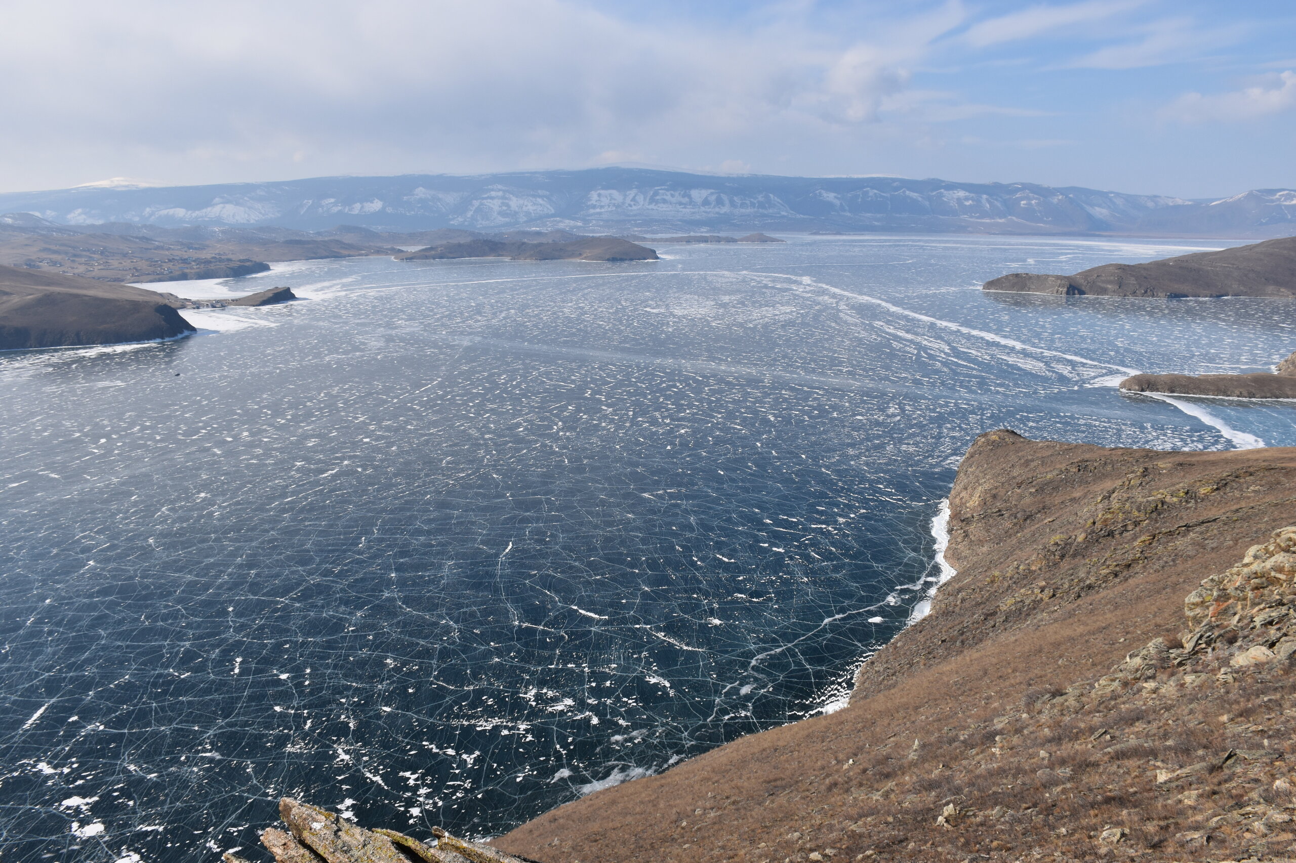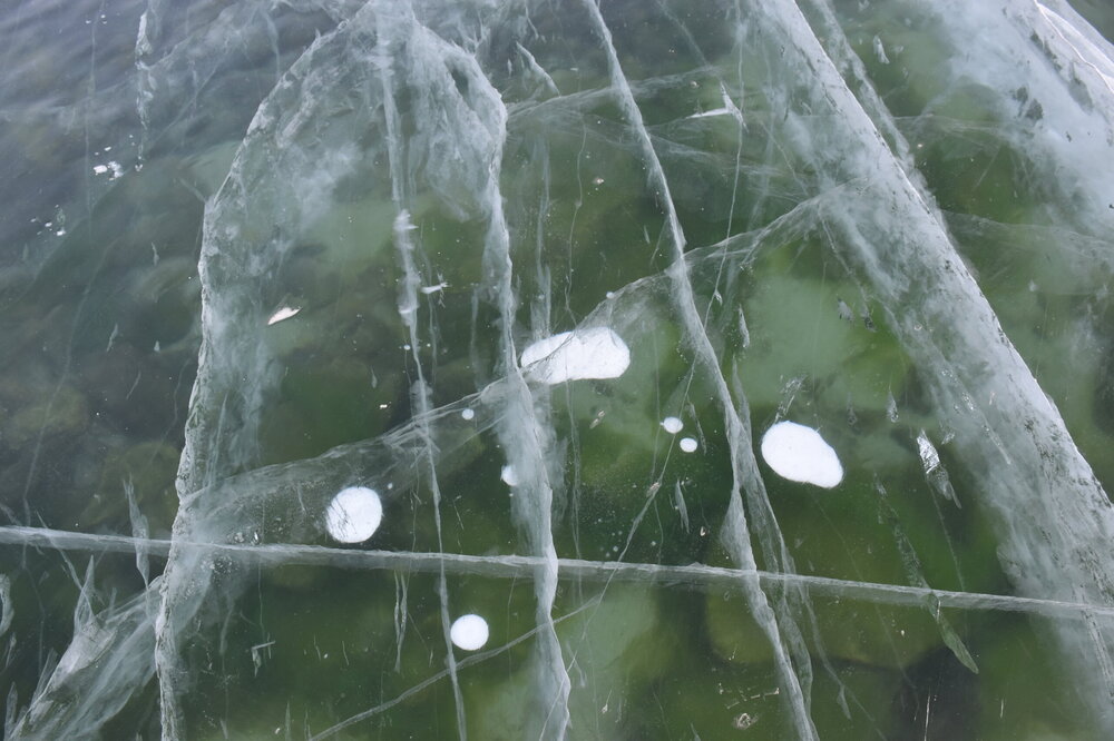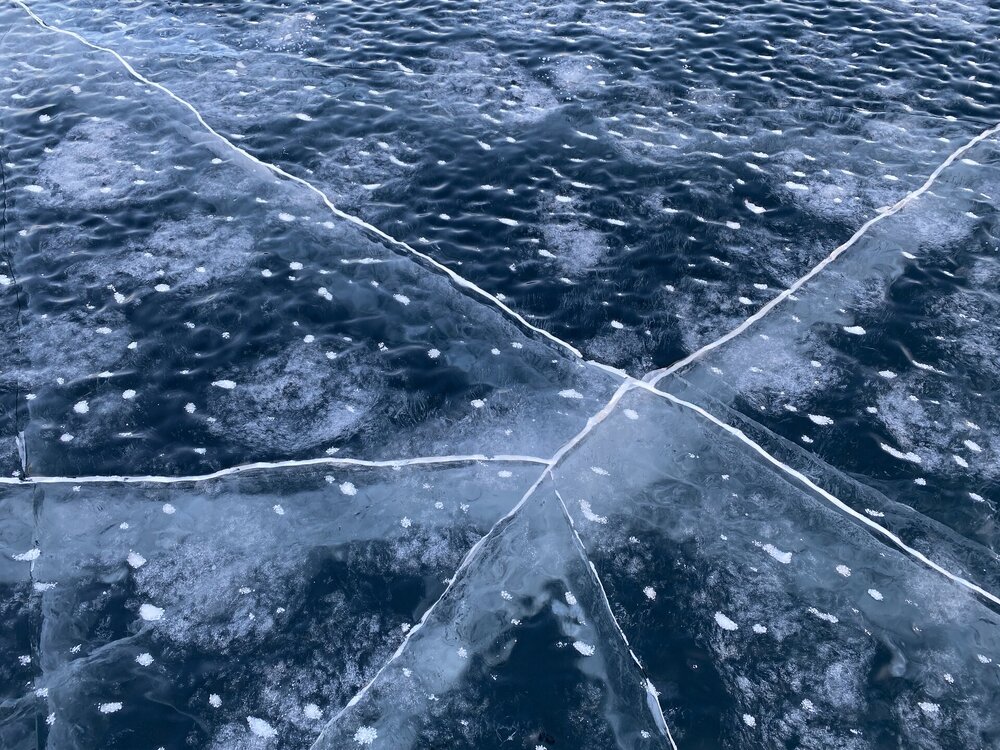 День 4. 12.03.2025 Сегодня наш день снова посвящен Льду! Вчерашний ветер Сарма сдул со льда снег. И если в первый выход было много снежных участков, то сейчас – перед нами почти идеальное зеркальное полотно! Хотя снежные участки для первого выхода – это больше плюс. Они помогали мне не скользить и побороть свой страх. В программе - поход на Мыс Уншуй острова Ольхон, Большое море. Гуляем по новым, весьма живописным окрестностям, а также поднимемся на скалу, что расположена над мысом Уншуй – с её вершины будет очередной, потрясающий вид на ледовую гладь Байкала. Активная часть треккинга: 20,1 км пешком, перепад высот 450-500 м, продолжительность похода 6-7 часов. В этом году лед образовался поздно, он тоньше и больше пропарин, поэтому в Большое море мы не выходим. Но вечером мы взяли дополнительную экскурсию на хивусе, который с легкостью вывез нас на большую глубину. Лед там отличается от Малого моря. Идем мы по проливу Ольхонские ворота. Это небольшой по ширине пролив, разделяющий материк и остров Ольхон. С одной стороны, он уходит в Малое море, с другой – в основную часть Байкала. На бурятском пролив называется Аман, что в переводе означает «рот» или «зёв». Иногда ещё можно встретить старое название – Ольхонский зунд. Длина пролива составляет 8,3 километра – это расстояние от мысов Улан и Кобылья голова до выхода в Большое море Байкала. Ширина наиболее узкого участка Ольхонских ворот – 1,2 километра. Именно на этом отрезке и находится паромная переправа на Ольхон. Средняя глубина пролива составляет 30-40 метров, а у южного входа, в окрестностях мысов Уншуй и Крест, она может достигать 100 метров. Течение здесь не такое, как на остальном Байкале. С северо-западной стороны находится Сарминское ущелье, откуда буйными порывами вырывается сильнейший одноименный ветер. Поэтому вода здесь находится в непрерывном движении, а волны порой могут достигать 5 метров высотой. В 2005 году на дне вдоль пролива Аман был проложен высоковольтный кабель, по которому на остров Ольхон поступает электричество. Ольхонские ворота – необычайно красивое и опасное место. Берега здесь круты и обрывисты, а вокруг них постоянно гоняет ветер и бьются волны. Зимой прибрежные скалы покрываются льдом и превращаются действительно нечто, похожее на сказочные ворота. Не удивительно, что туристы из года в год делают на Ольхонских воротах памятные, красочные фото. На побережье пролива Аман много узких заливов и небольших бухточек. Некоторые из бухт покрупнее – длиной 3-4 километра, но большинство все же совсем маленькие. На материковой части стоит посетить такие бухты, как: Тутай; Куркутская; Базарная. Со стороны Ольхона наибольший интерес представляют заливы Хул и Загли. Они закрыты от ветра и прекрасно подходит для стоянки судов в плохую погоду. Сегодня я выискиваю на льду необычные фигуры.