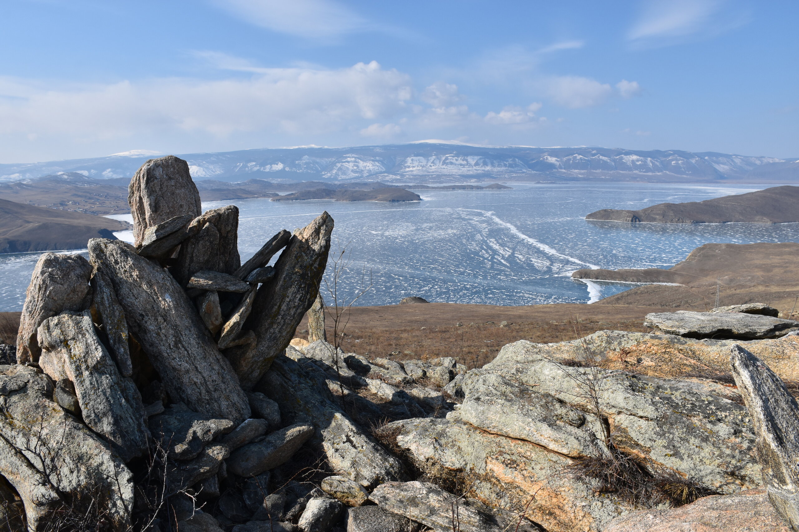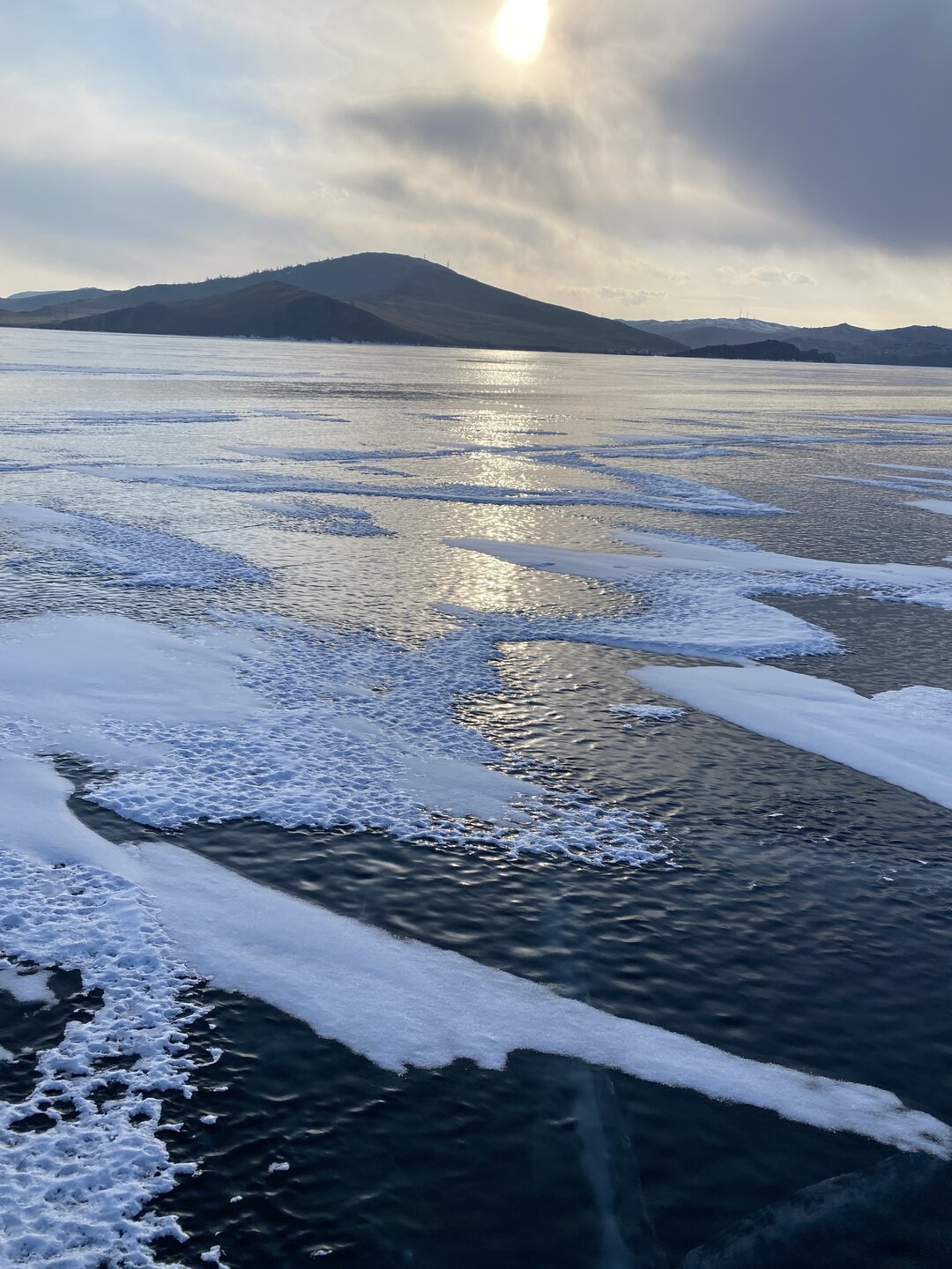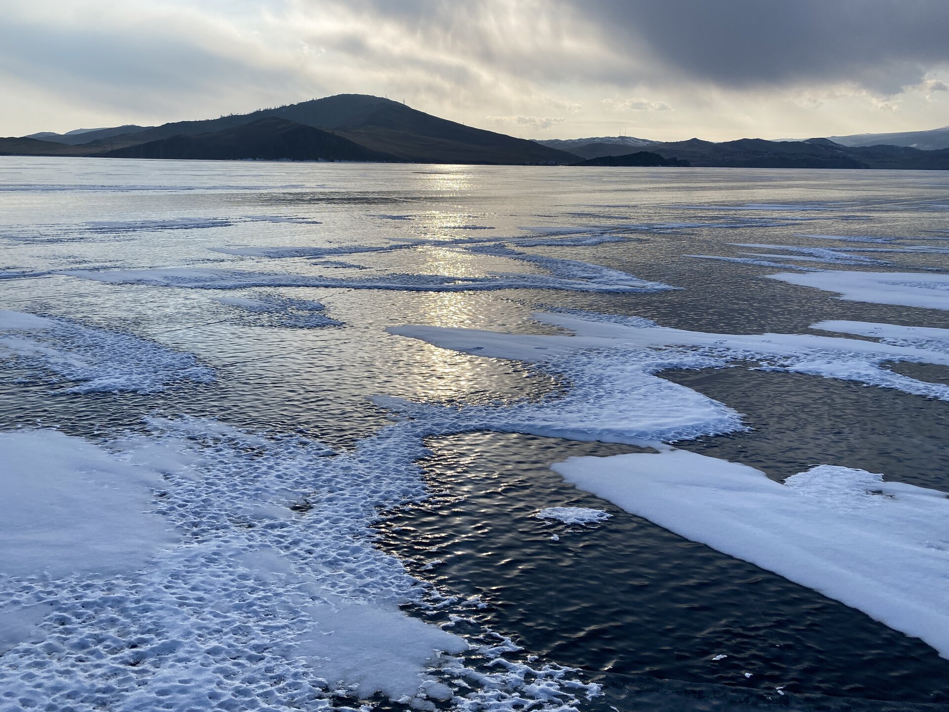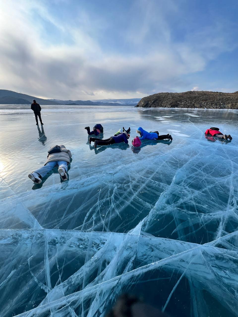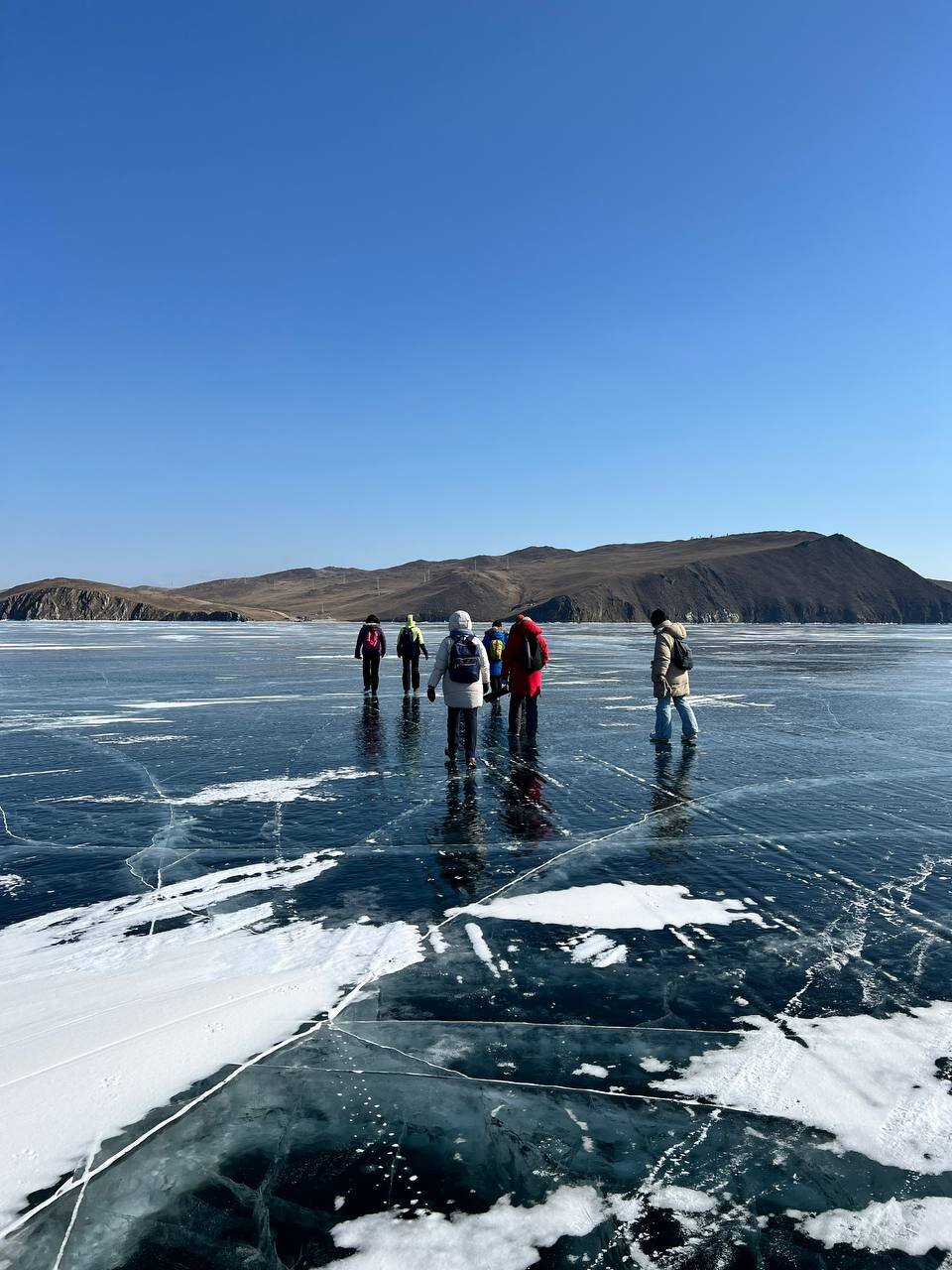 День 4. 12.03.2025 Сегодня наш день снова посвящен Льду! Вчерашний ветер Сарма сдул со льда снег. И если в первый выход было много снежных участков, то сейчас – перед нами почти идеальное зеркальное полотно! Хотя снежные участки для первого выхода – это больше плюс. Они помогали мне не скользить и побороть свой страх. В программе - поход на Мыс Уншуй острова Ольхон, Большое море. Гуляем по новым, весьма живописным окрестностям, а также поднимемся на скалу, что расположена над мысом Уншуй – с её вершины будет очередной, потрясающий вид на ледовую гладь Байкала. Активная часть треккинга: 20,1 км пешком, перепад высот 450-500 м, продолжительность похода 6-7 часов. В этом году лед образовался поздно, он тоньше и больше пропарин, поэтому в Большое море мы не выходим. Но вечером мы взяли дополнительную экскурсию на хивусе, который с легкостью вывез нас на большую глубину. Лед там отличается от Малого моря. Идем мы по проливу Ольхонские ворота. Это небольшой по ширине пролив, разделяющий материк и остров Ольхон. С одной стороны, он уходит в Малое море, с другой – в основную часть Байкала. На бурятском пролив называется Аман, что в переводе означает «рот» или «зёв». Иногда ещё можно встретить старое название – Ольхонский зунд. Длина пролива составляет 8,3 километра – это расстояние от мысов Улан и Кобылья голова до выхода в Большое море Байкала. Ширина наиболее узкого участка Ольхонских ворот – 1,2 километра. Именно на этом отрезке и находится паромная переправа на Ольхон. Средняя глубина пролива составляет 30-40 метров, а у южного входа, в окрестностях мысов Уншуй и Крест, она может достигать 100 метров. Течение здесь не такое, как на остальном Байкале. С северо-западной стороны находится Сарминское ущелье, откуда буйными порывами вырывается сильнейший одноименный ветер. Поэтому вода здесь находится в непрерывном движении, а волны порой могут достигать 5 метров высотой. В 2005 году на дне вдоль пролива Аман был проложен высоковольтный кабель, по которому на остров Ольхон поступает электричество. Ольхонские ворота – необычайно красивое и опасное место. Берега здесь круты и обрывисты, а вокруг них постоянно гоняет ветер и бьются волны. Зимой прибрежные скалы покрываются льдом и превращаются действительно нечто, похожее на сказочные ворота. Не удивительно, что туристы из года в год делают на Ольхонских воротах памятные, красочные фото. На побережье пролива Аман много узких заливов и небольших бухточек. Некоторые из бухт покрупнее – длиной 3-4 километра, но большинство все же совсем маленькие. На материковой части стоит посетить такие бухты, как: Тутай; Куркутская; Базарная. Со стороны Ольхона наибольший интерес представляют заливы Хул и Загли. Они закрыты от ветра и прекрасно подходит для стоянки судов в плохую погоду. Сегодня я выискиваю на льду необычные фигуры.