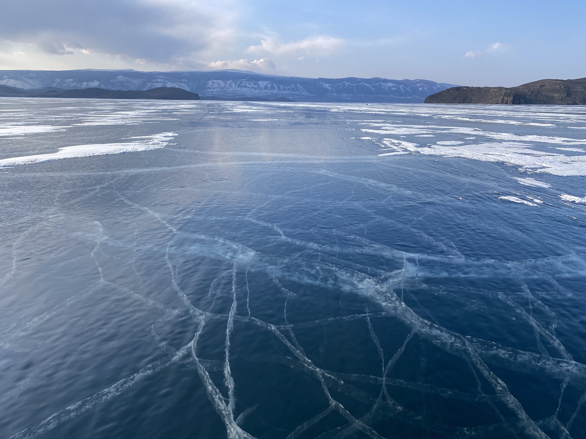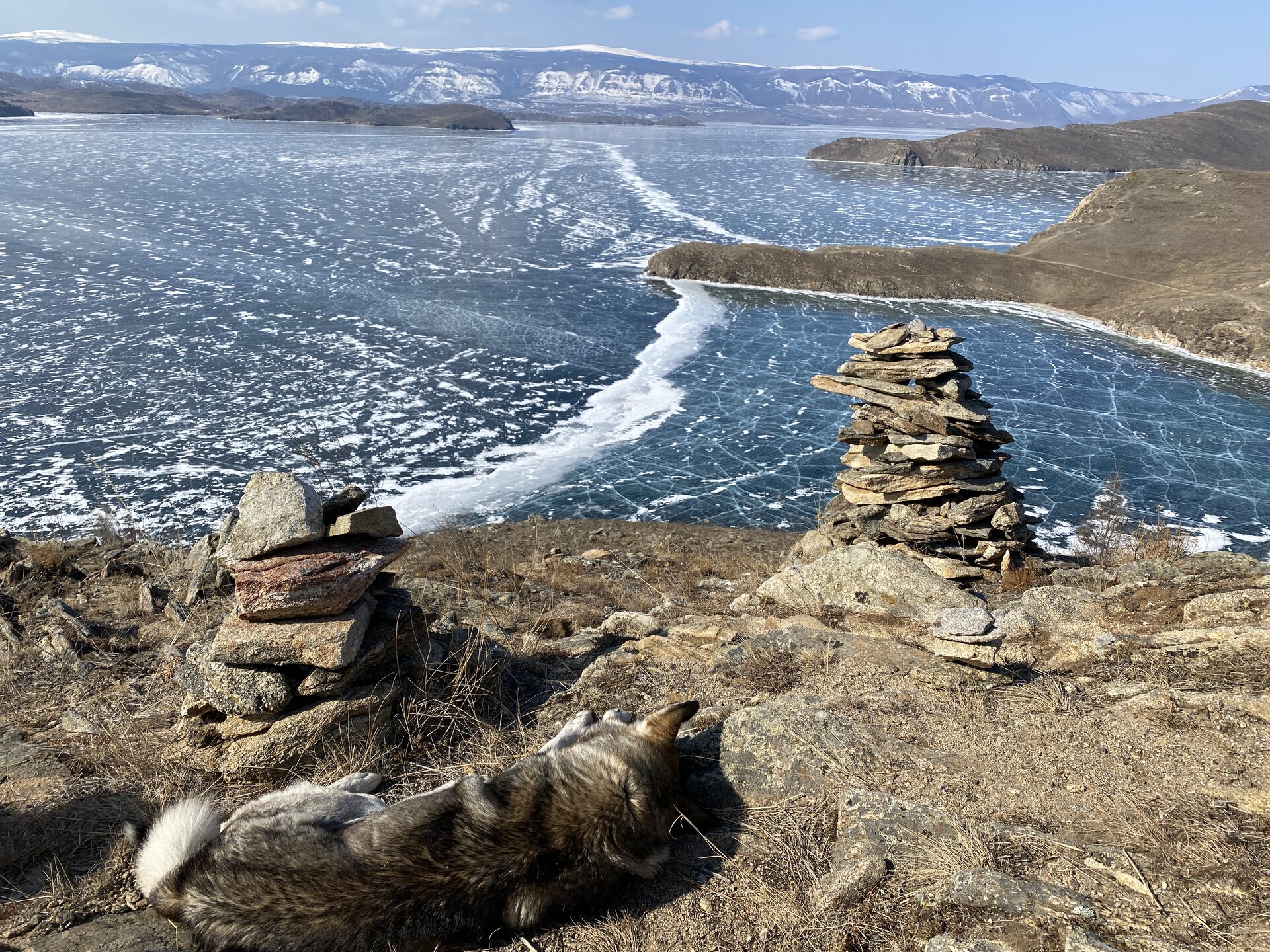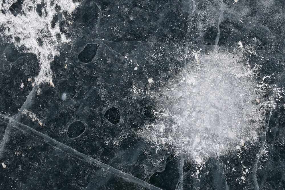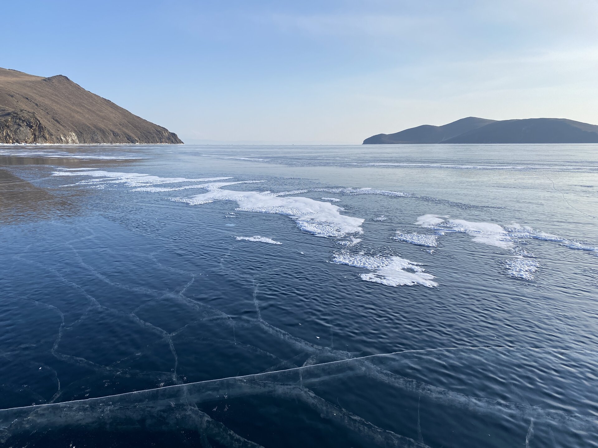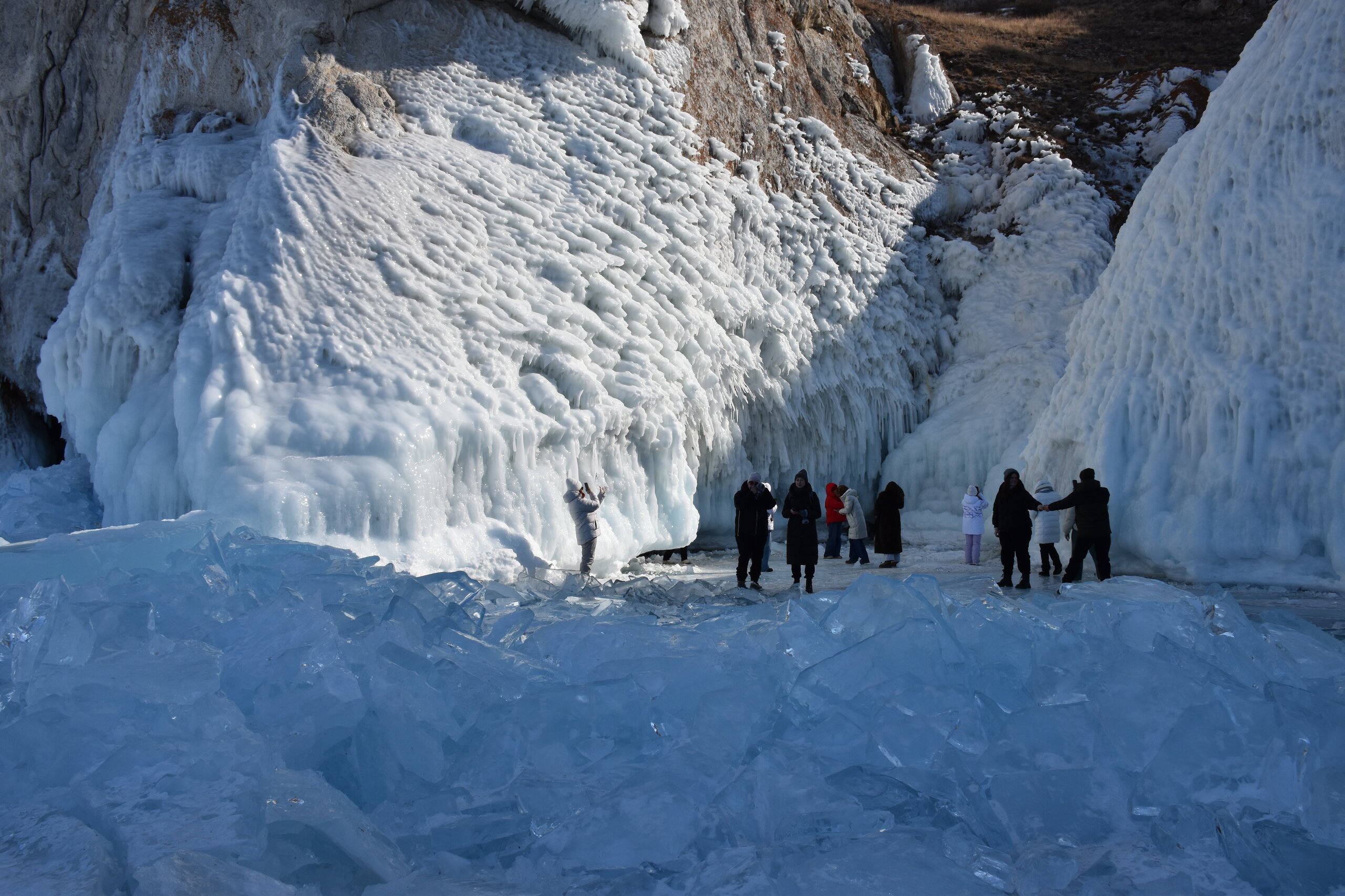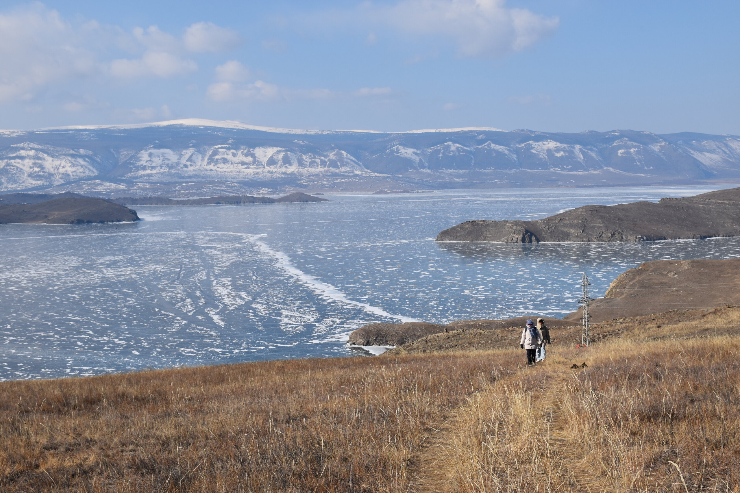 День 4. 12.03.2025 Сегодня наш день снова посвящен Льду! Вчерашний ветер Сарма сдул со льда снег. И если в первый выход было много снежных участков, то сейчас – перед нами почти идеальное зеркальное полотно! Хотя снежные участки для первого выхода – это больше плюс. Они помогали мне не скользить и побороть свой страх. В программе - поход на Мыс Уншуй острова Ольхон, Большое море. Гуляем по новым, весьма живописным окрестностям, а также поднимемся на скалу, что расположена над мысом Уншуй – с её вершины будет очередной, потрясающий вид на ледовую гладь Байкала. Активная часть треккинга: 20,1 км пешком, перепад высот 450-500 м, продолжительность похода 6-7 часов. В этом году лед образовался поздно, он тоньше и больше пропарин, поэтому в Большое море мы не выходим. Но вечером мы взяли дополнительную экскурсию на хивусе, который с легкостью вывез нас на большую глубину. Лед там отличается от Малого моря. Идем мы по проливу Ольхонские ворота. Это небольшой по ширине пролив, разделяющий материк и остров Ольхон. С одной стороны, он уходит в Малое море, с другой – в основную часть Байкала. На бурятском пролив называется Аман, что в переводе означает «рот» или «зёв». Иногда ещё можно встретить старое название – Ольхонский зунд. Длина пролива составляет 8,3 километра – это расстояние от мысов Улан и Кобылья голова до выхода в Большое море Байкала. Ширина наиболее узкого участка Ольхонских ворот – 1,2 километра. Именно на этом отрезке и находится паромная переправа на Ольхон. Средняя глубина пролива составляет 30-40 метров, а у южного входа, в окрестностях мысов Уншуй и Крест, она может достигать 100 метров. Течение здесь не такое, как на остальном Байкале. С северо-западной стороны находится Сарминское ущелье, откуда буйными порывами вырывается сильнейший одноименный ветер. Поэтому вода здесь находится в непрерывном движении, а волны порой могут достигать 5 метров высотой. В 2005 году на дне вдоль пролива Аман был проложен высоковольтный кабель, по которому на остров Ольхон поступает электричество. Ольхонские ворота – необычайно красивое и опасное место. Берега здесь круты и обрывисты, а вокруг них постоянно гоняет ветер и бьются волны. Зимой прибрежные скалы покрываются льдом и превращаются действительно нечто, похожее на сказочные ворота. Не удивительно, что туристы из года в год делают на Ольхонских воротах памятные, красочные фото. На побережье пролива Аман много узких заливов и небольших бухточек. Некоторые из бухт покрупнее – длиной 3-4 километра, но большинство все же совсем маленькие. На материковой части стоит посетить такие бухты, как: Тутай; Куркутская; Базарная. Со стороны Ольхона наибольший интерес представляют заливы Хул и Загли. Они закрыты от ветра и прекрасно подходит для стоянки судов в плохую погоду. Сегодня я выискиваю на льду необычные фигуры.